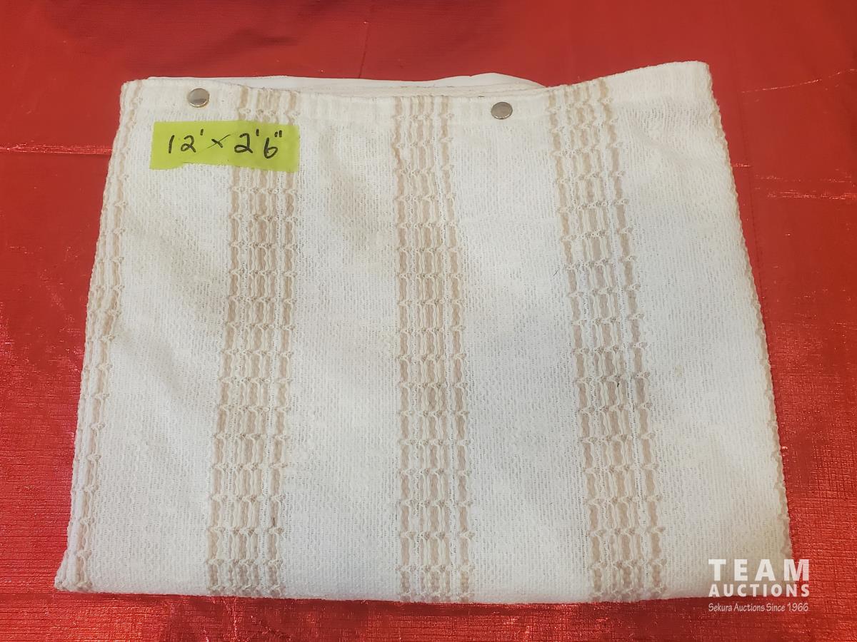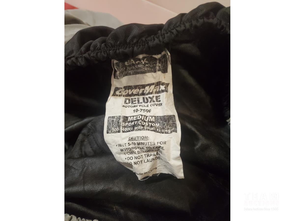 Large RV Duffle Bag, Covermax Deluxe Medium Motorcycle (covers up to 500 cc with Small Fairing), Approximately 11 ft 7 inch PWC or Small Boat Cover, Beige Sheers 20 ft wide x 7 ft 3 inch High & (2) 9 ft 6 inch Wide x 7 ft 8 inch High, 12 ft x 2 ft 6 inch RV Curtain, 4 Tarps (Sizes as marked), Pillow, Air Mattress or Flotation Device