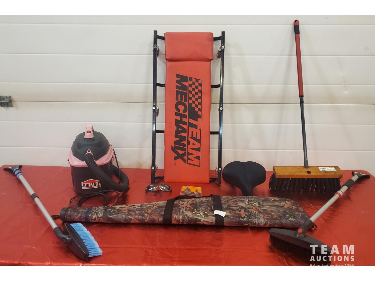 Jobmate 2 gallon Wet / Dry Vacuum, Team Mechanix Creeper, 2 piece High Speed Step Drills, Safety Glasses, CCM Mega Gel Touring Bicycle Seat, 45 inch Rifle Case, Push Button Telescoping Snow Brush, Push Button Snow Brushes, 14 inch PVC Extra Stiff Broom with Telescopic Handle