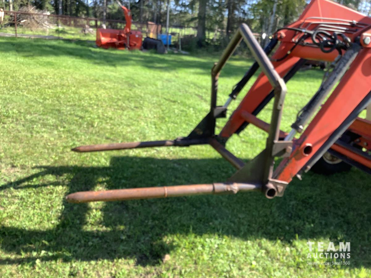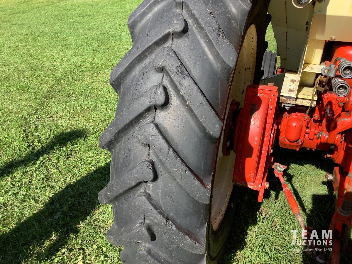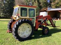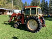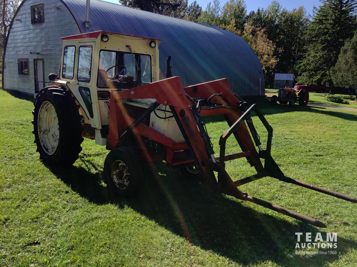 Loader, bucket, bale forks, 4 cylinder engine, cab, 540 PTO, 3 point hitch, 15.5X38 rear tires, manuals, wrenches