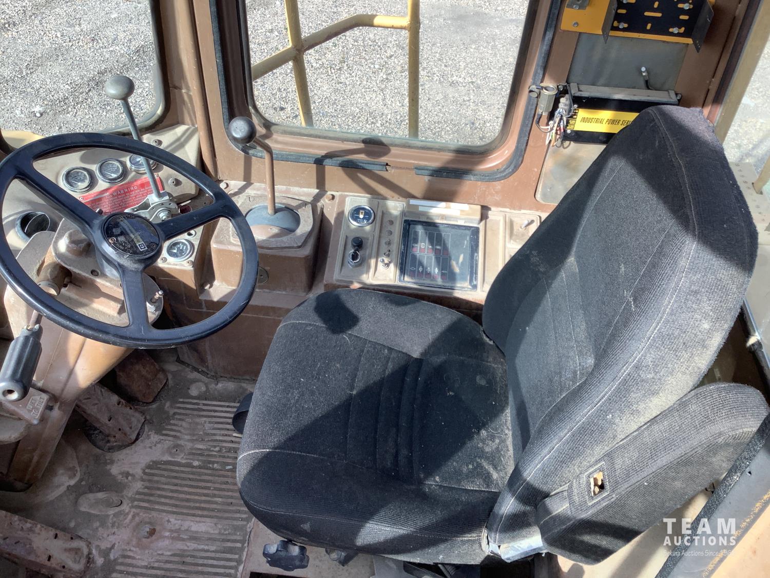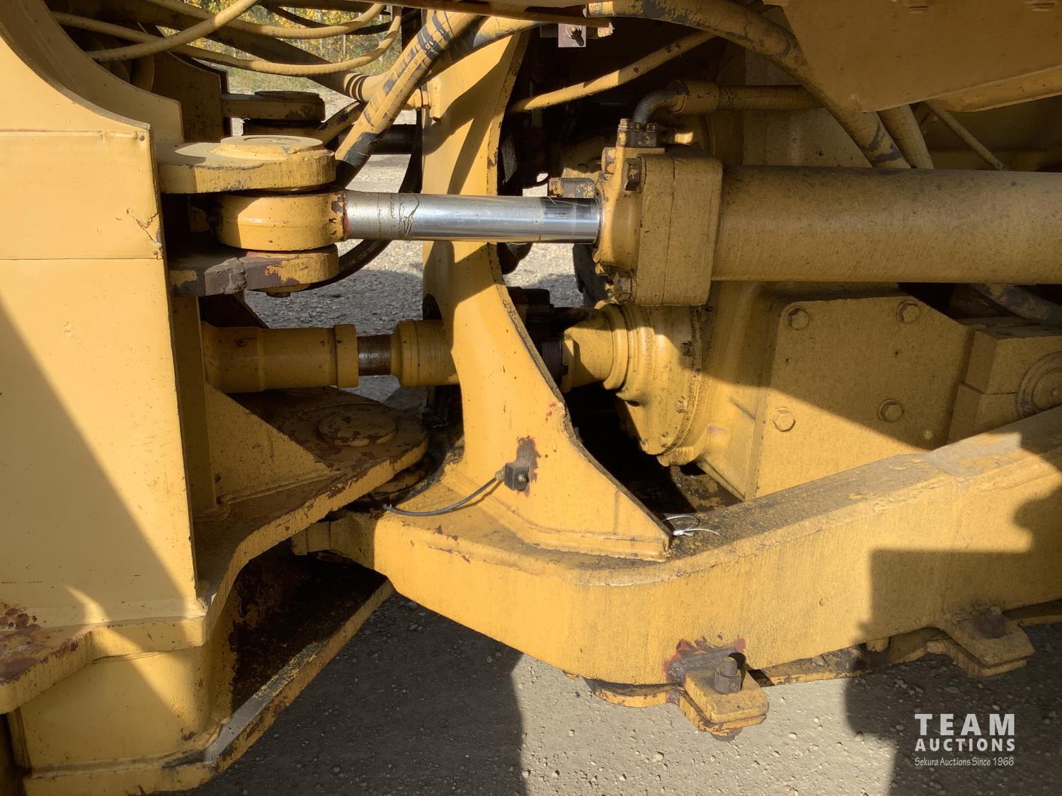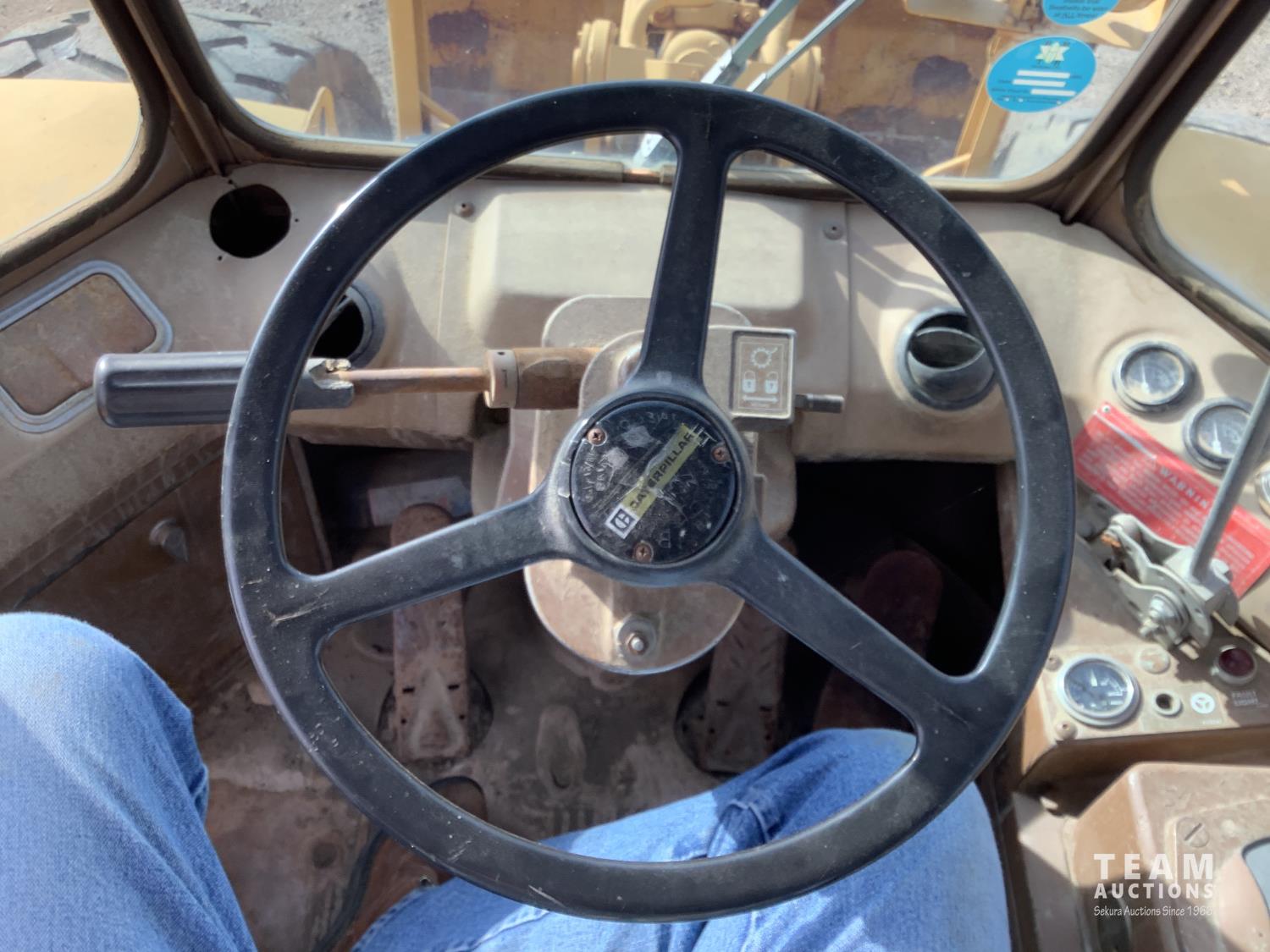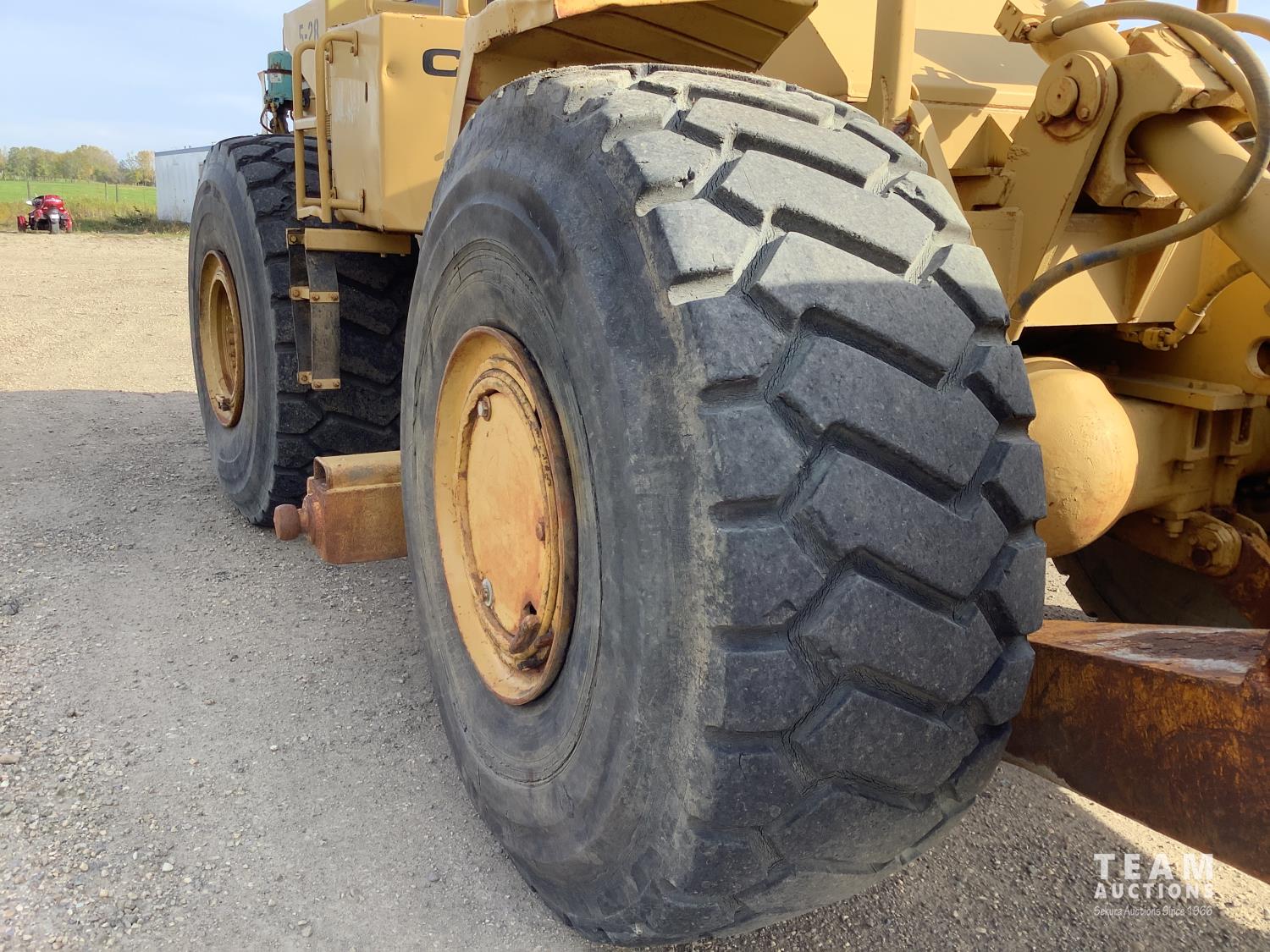 3406 caterpillar 14.6 Liter engine, 4 speed single lever power shift transmission, hydraulic 10 ft blade with rubber cushion blocks, cab, factory ROPS protection, rear tow hitch, 4 wheel oil- immersed multiple disc brakes, master switch, good batteries, 29.5X25 tires