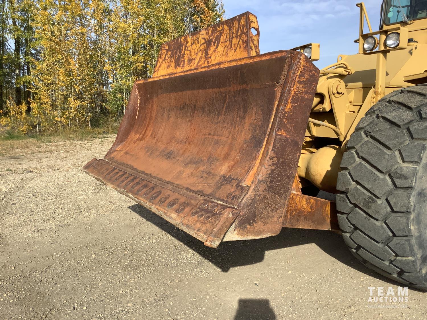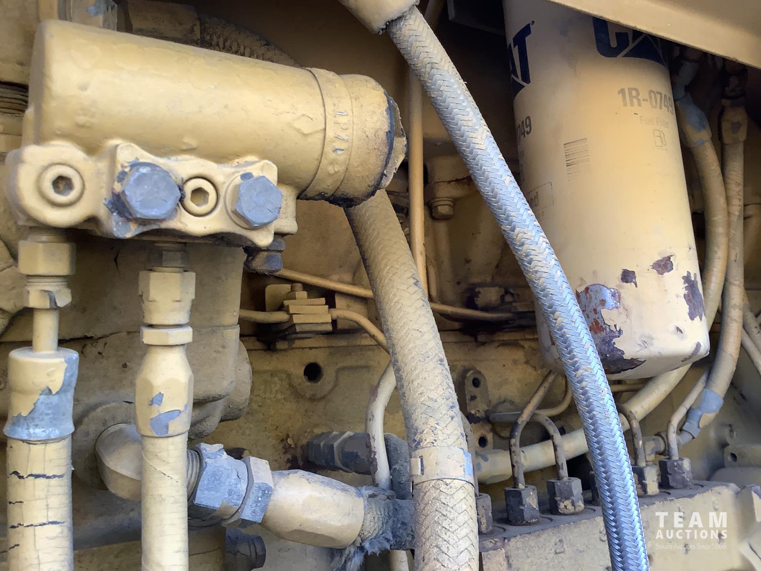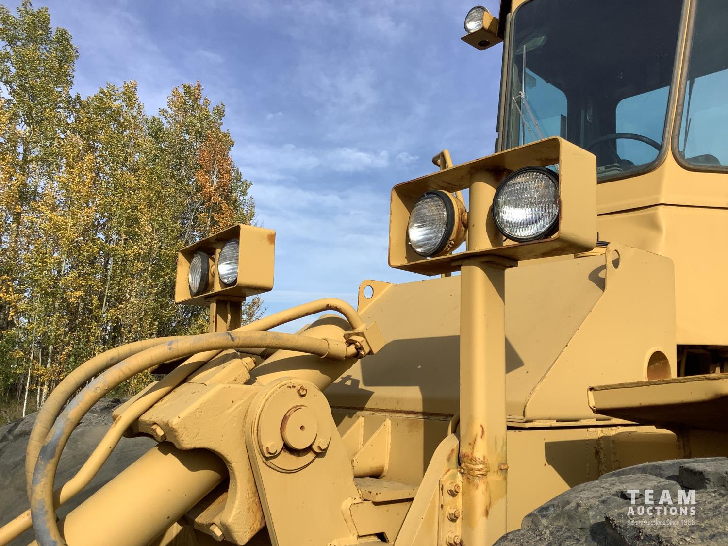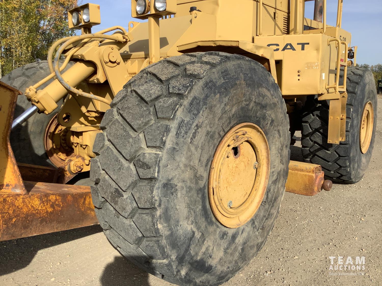 3406 caterpillar 14.6 Liter engine, 4 speed single lever power shift transmission, hydraulic 10 ft blade with rubber cushion blocks, cab, factory ROPS protection, rear tow hitch, 4 wheel oil- immersed multiple disc brakes, master switch, good batteries, 29.5X25 tires
