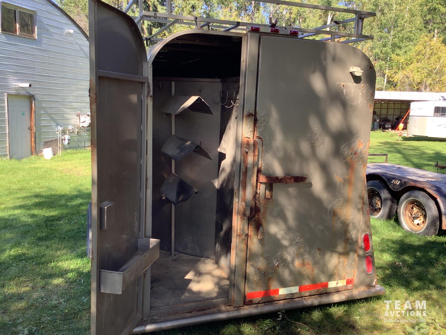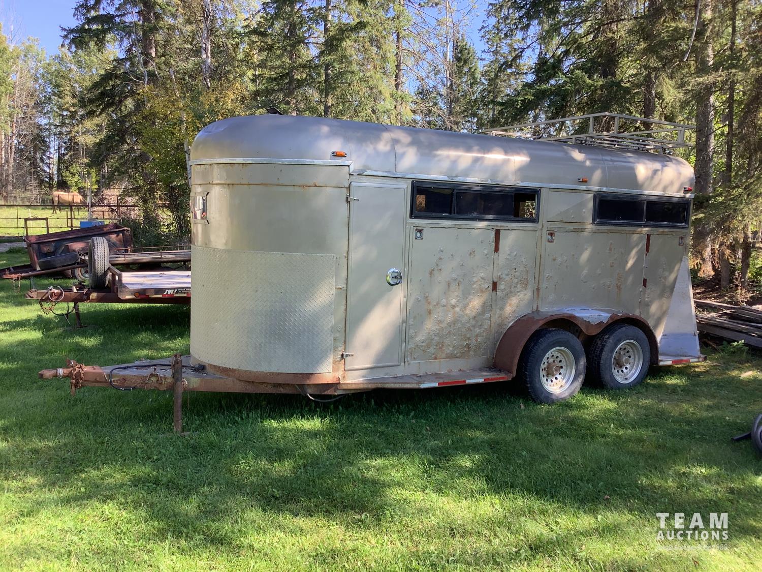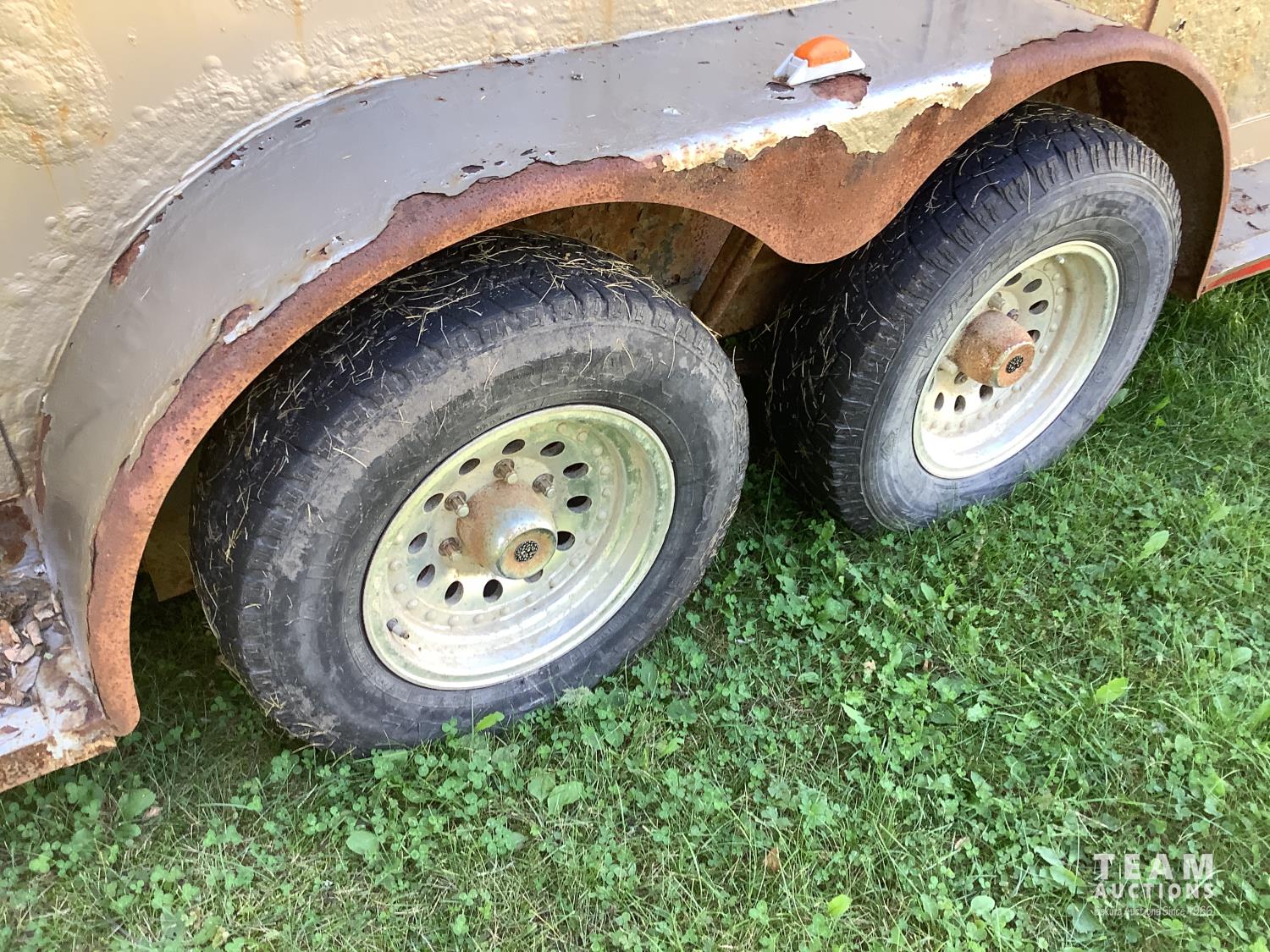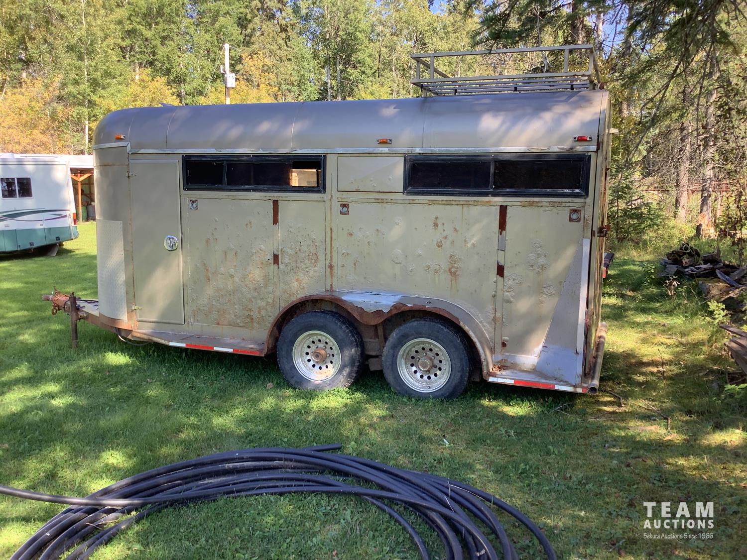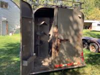 (2) side doors, rear tack storage area, rubber mat flooring, roof rack, 2-5/16 ball hitch, 3000 lb axles, sliding side windows, LT215/75R15 tires on aluminum rims