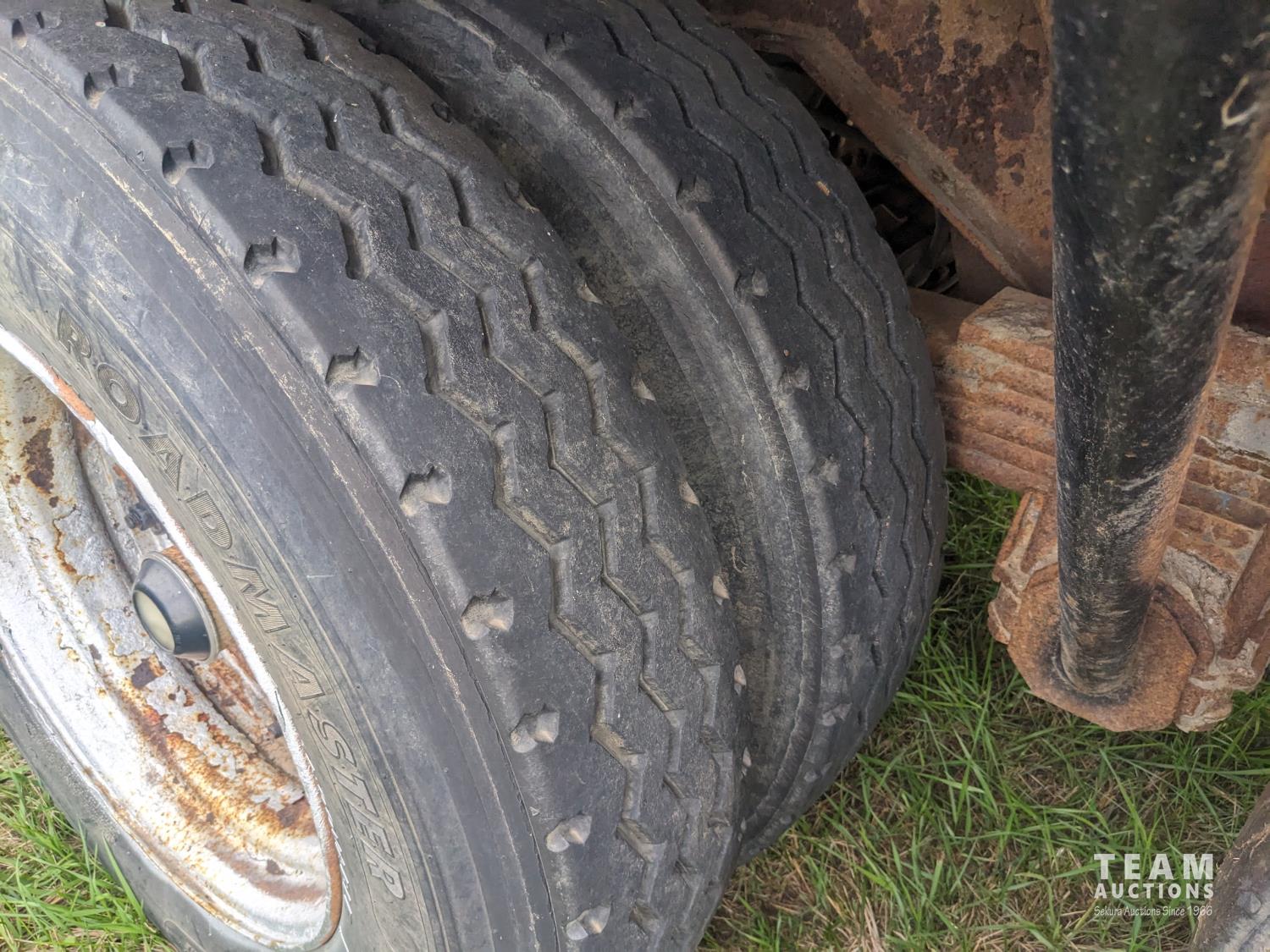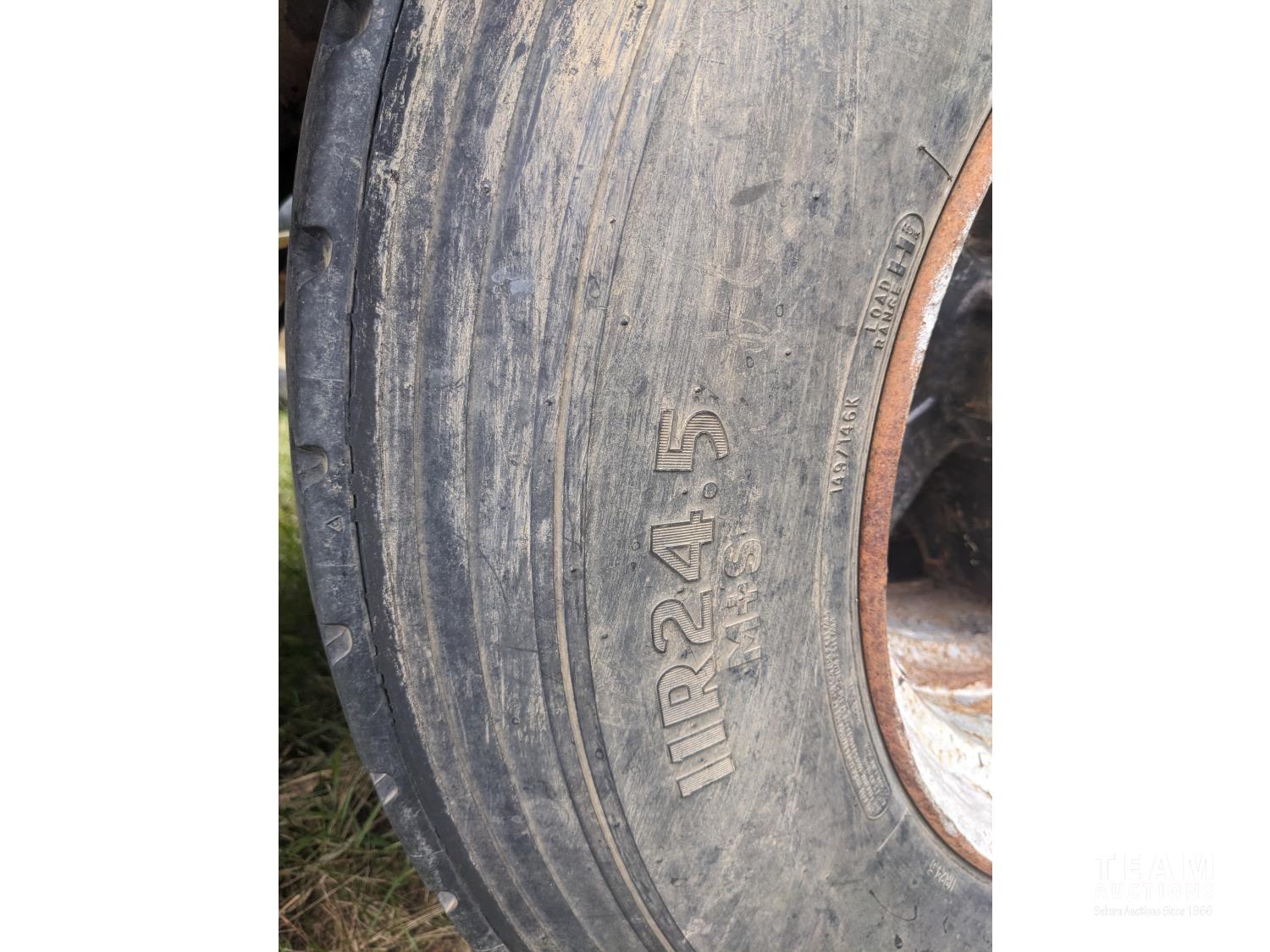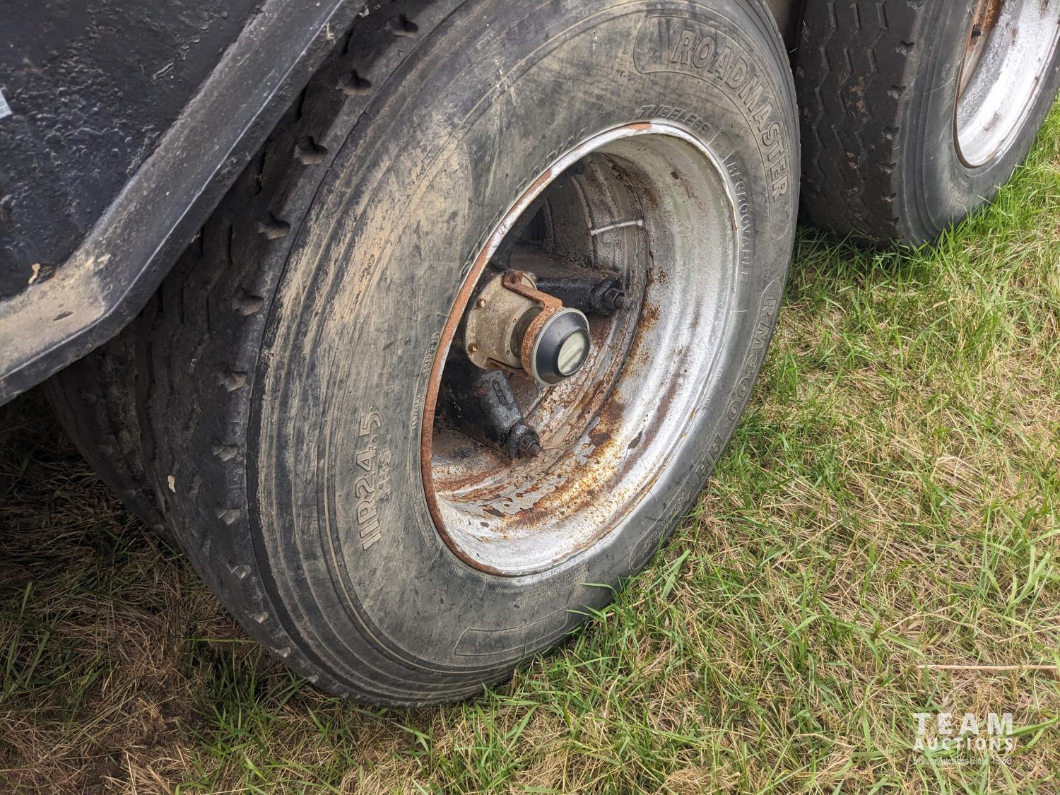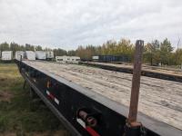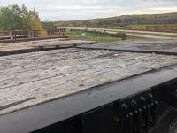 102 inch wide deck, wood deck, cargo winches, rear live roll, pin pockets, swing out wide load lights, spring suspension, 11R24.5 tires