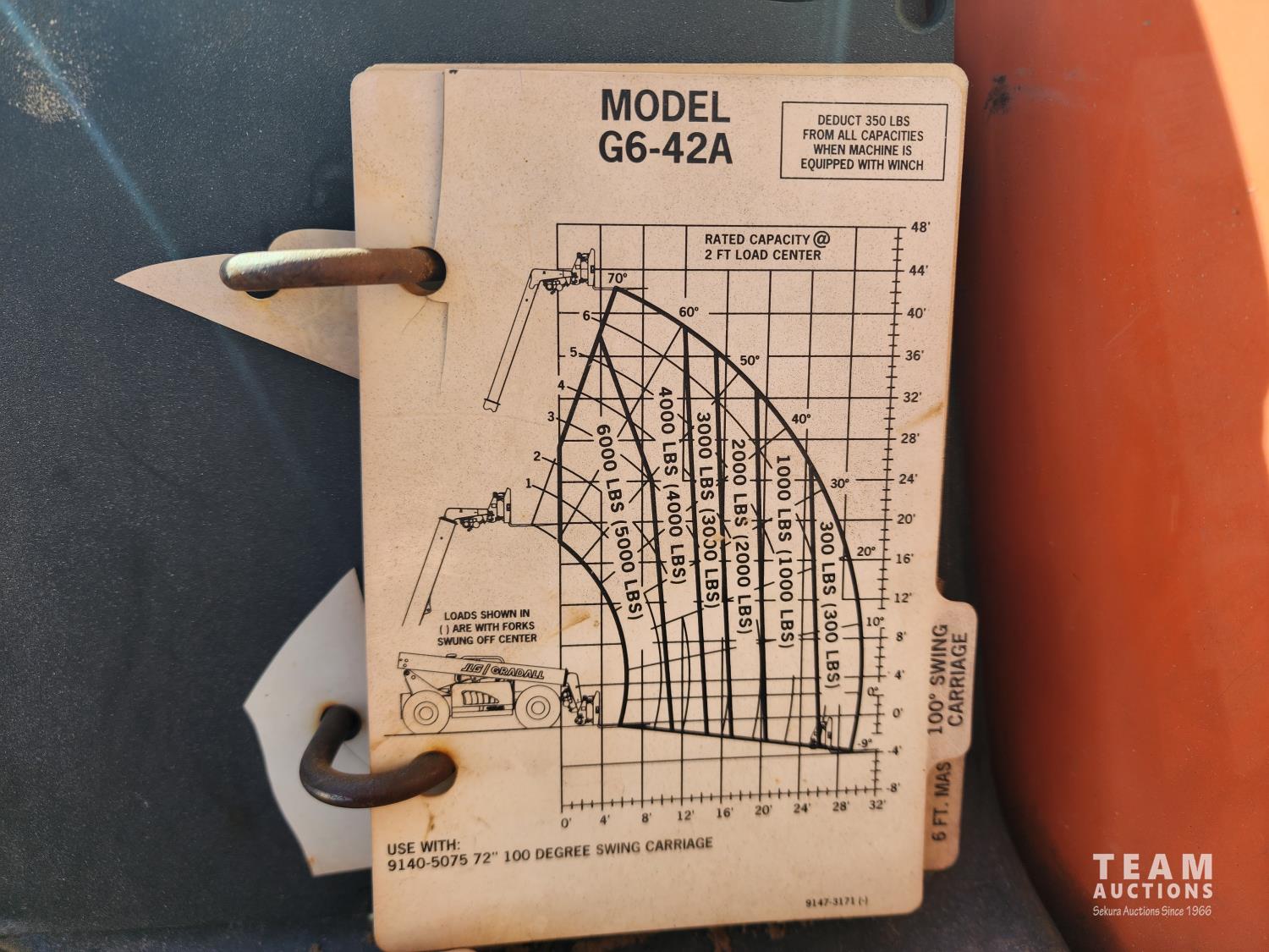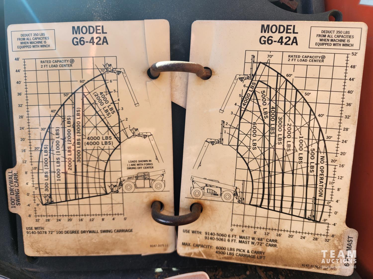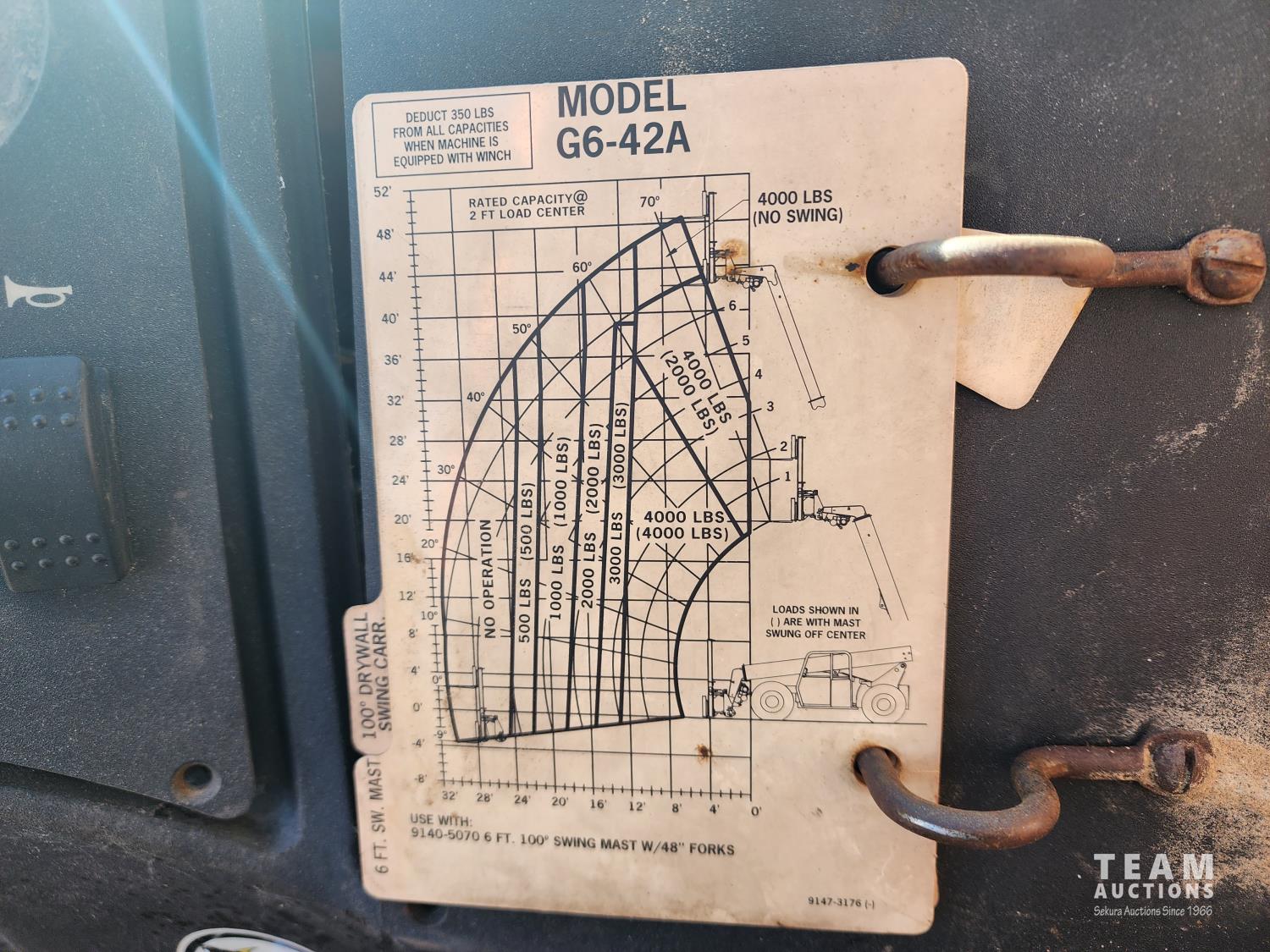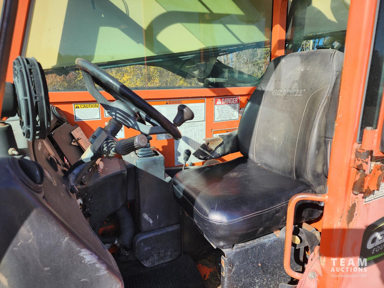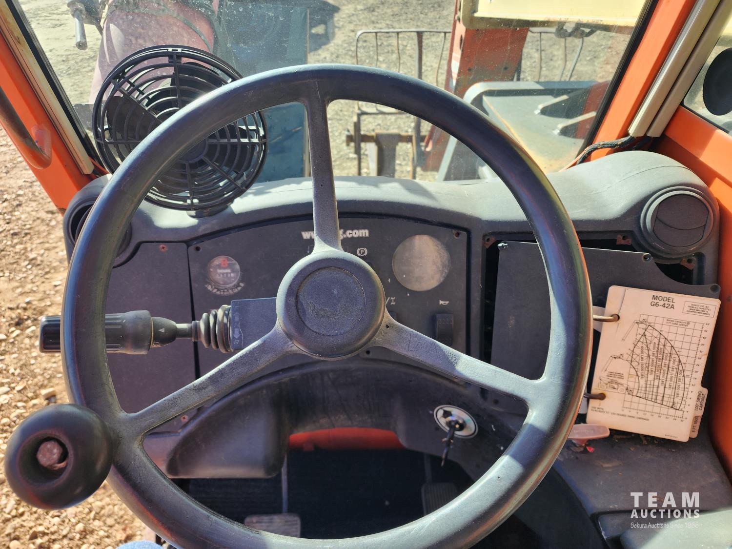 John Deere diesel engine, Gradall 4 ft forks, heated cab, Maximum Lift Height 42 ft, Max capacity 6600 lb, 13.00-24TG tires