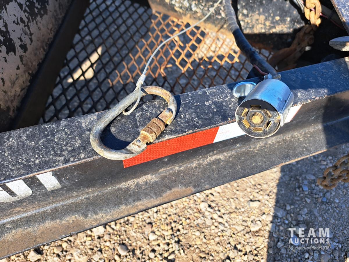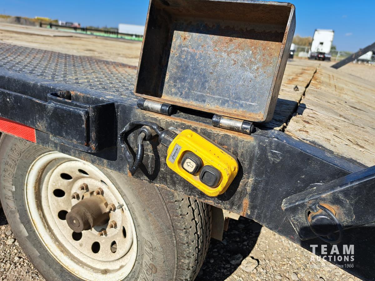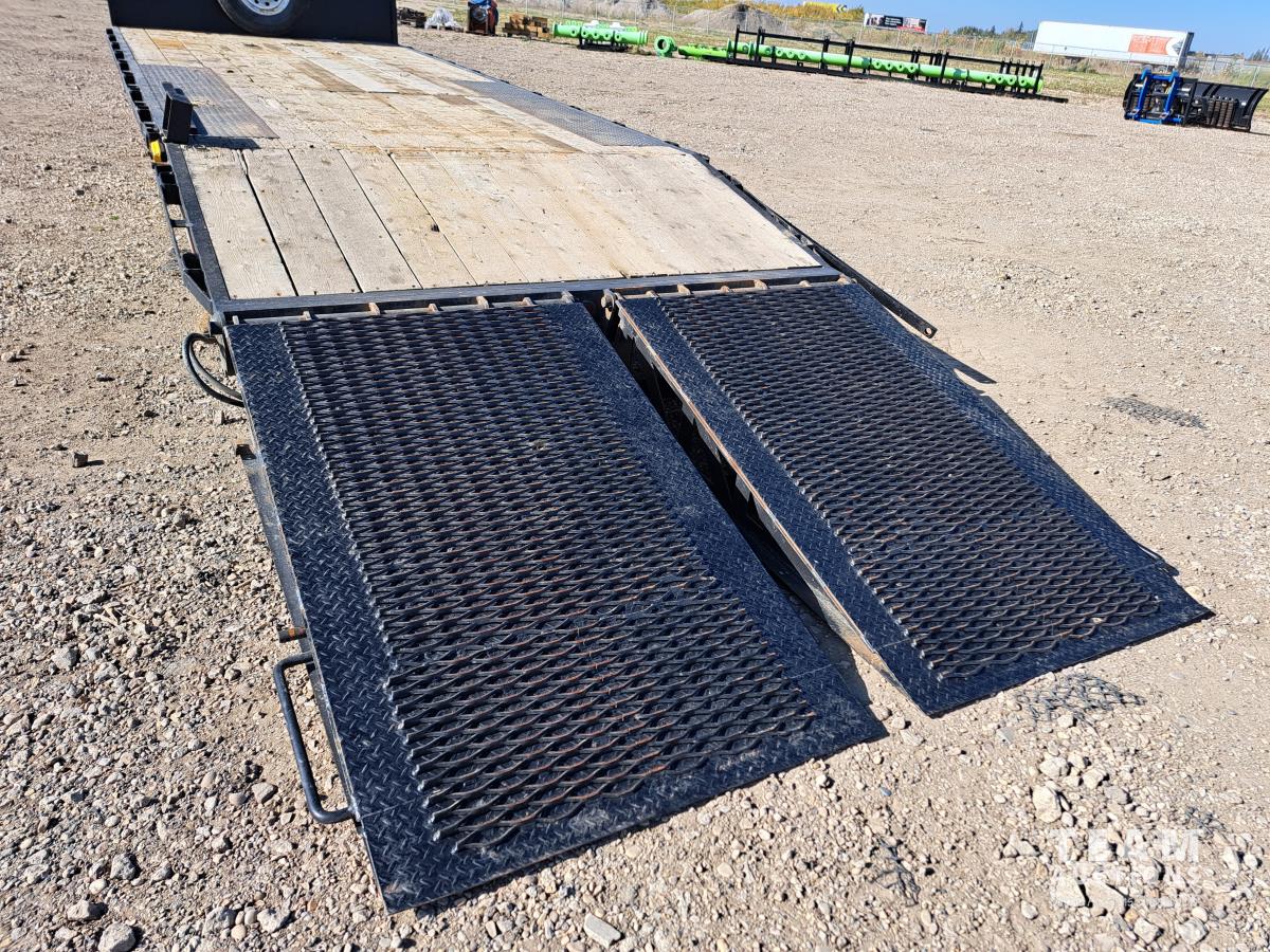 92 inch wide deck, wood deck, stake pockets, rub rails, 8 bolt rims, 4ft beaver tail, 2 electric over hydraulic loading ramps, 43" wide each, spare tire, hand crank single jack, pintle hitch, spring suspension, 10000 lift axles, ST235/80R16 tires