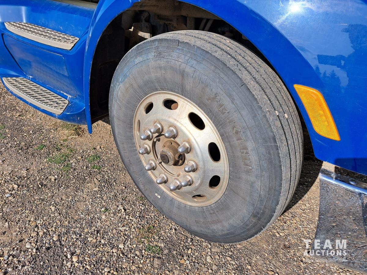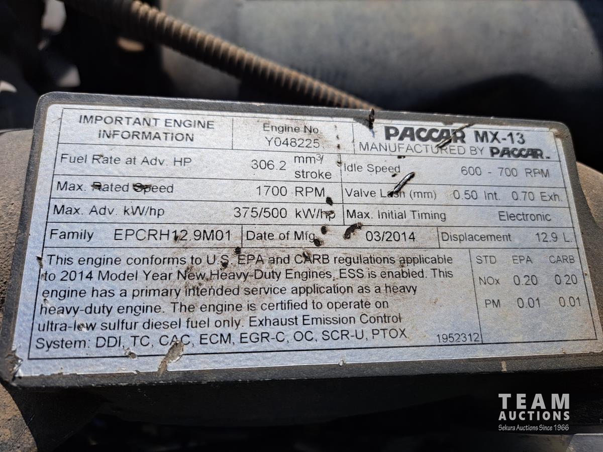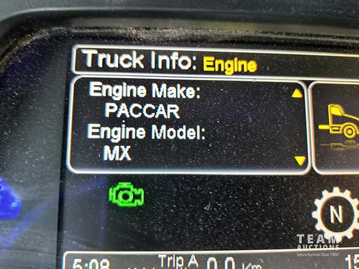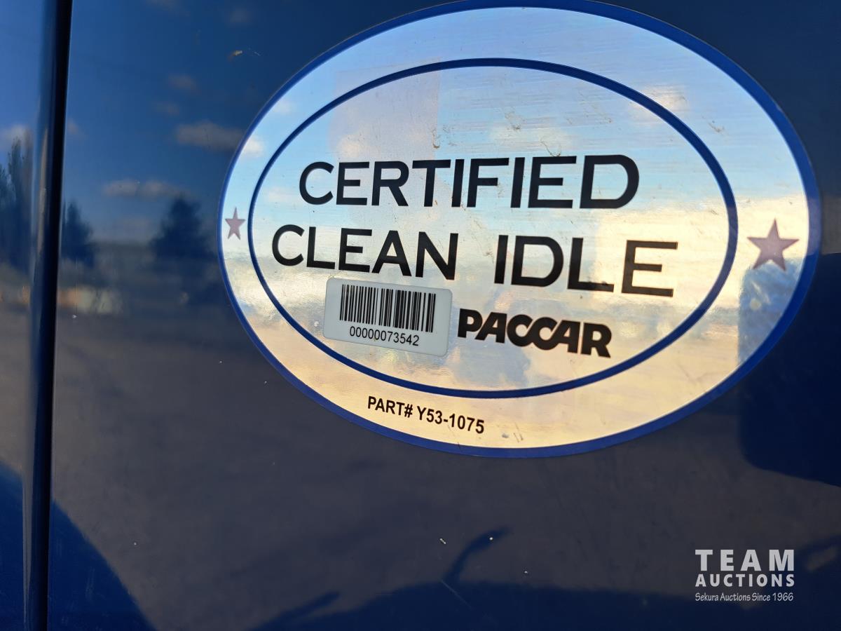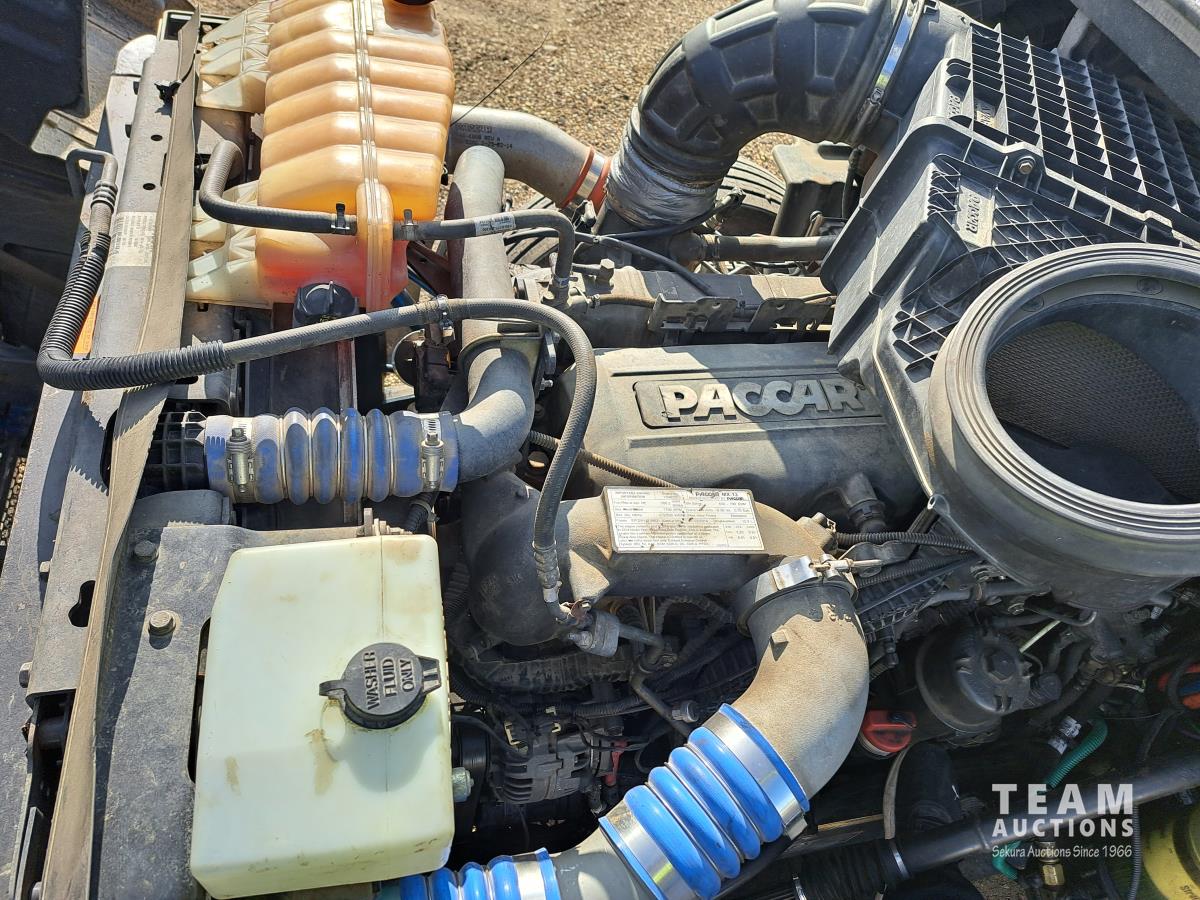 Paccar MX13 12.9 L Inline 6-Cylinder 510 HP diesel engine, DEF required, engine heater, engine brake, Eaton Fuller PACCAR TX-12 auto shift transmission, cab heater, high rise 80 inch sleeper, A/C, cruise control, leather interior, navigation system, radio, aluminum moose bumper, air ride cab, chain holders, 5,988 lb front axle, 20,000 lb rear axles, aluminum outer wheels, 11R22.5 tires