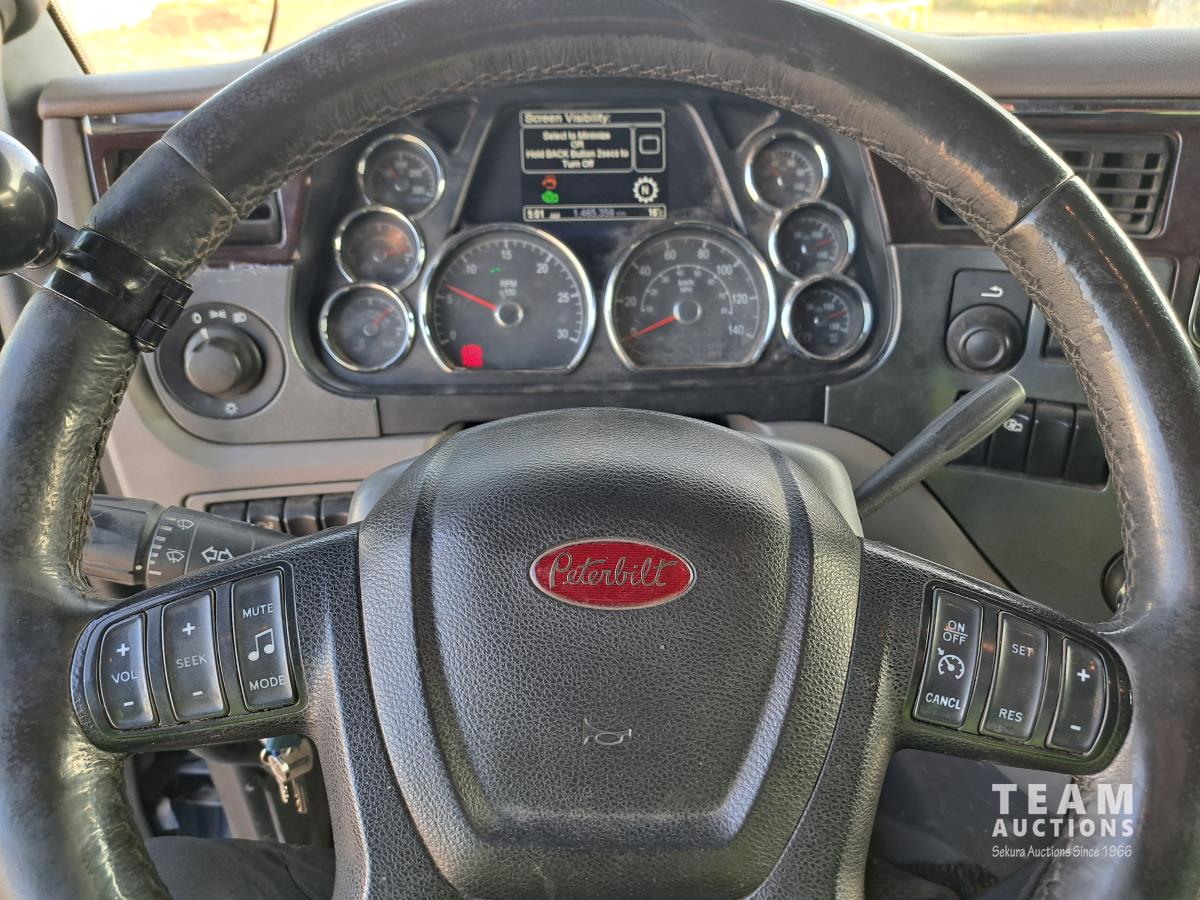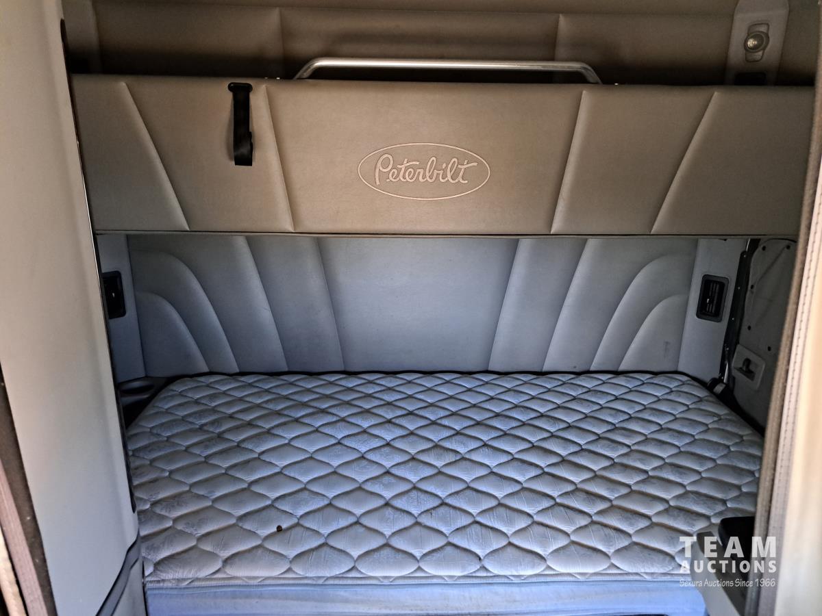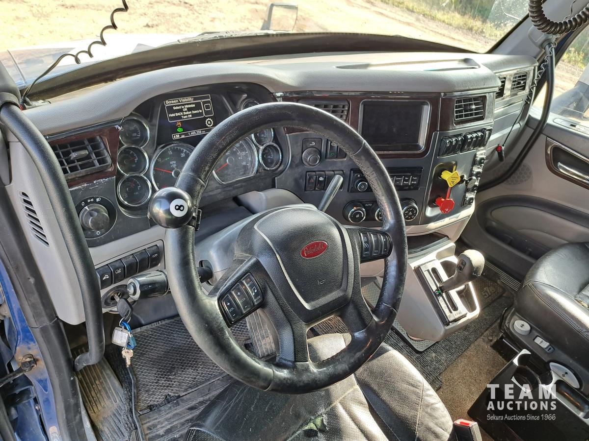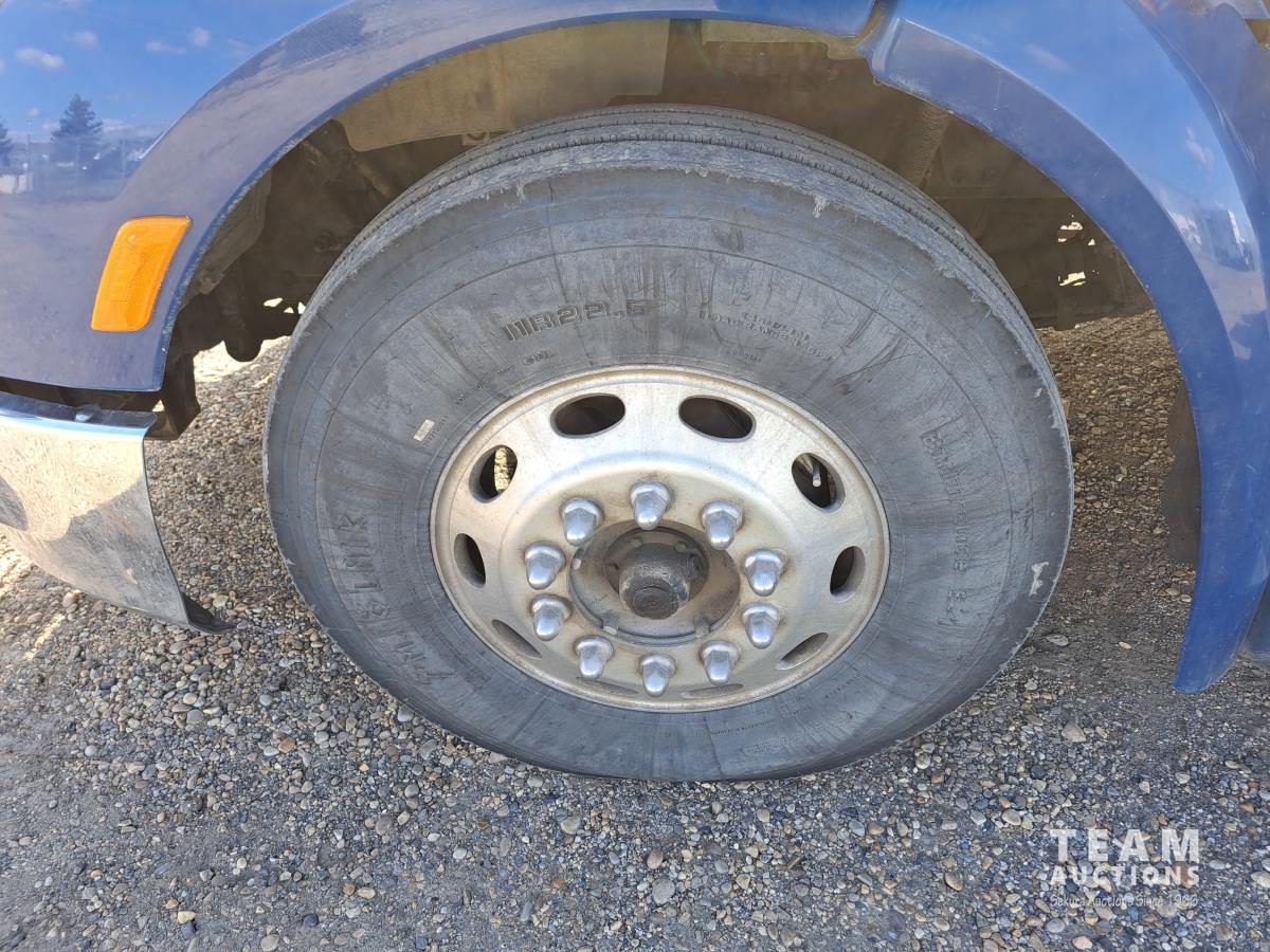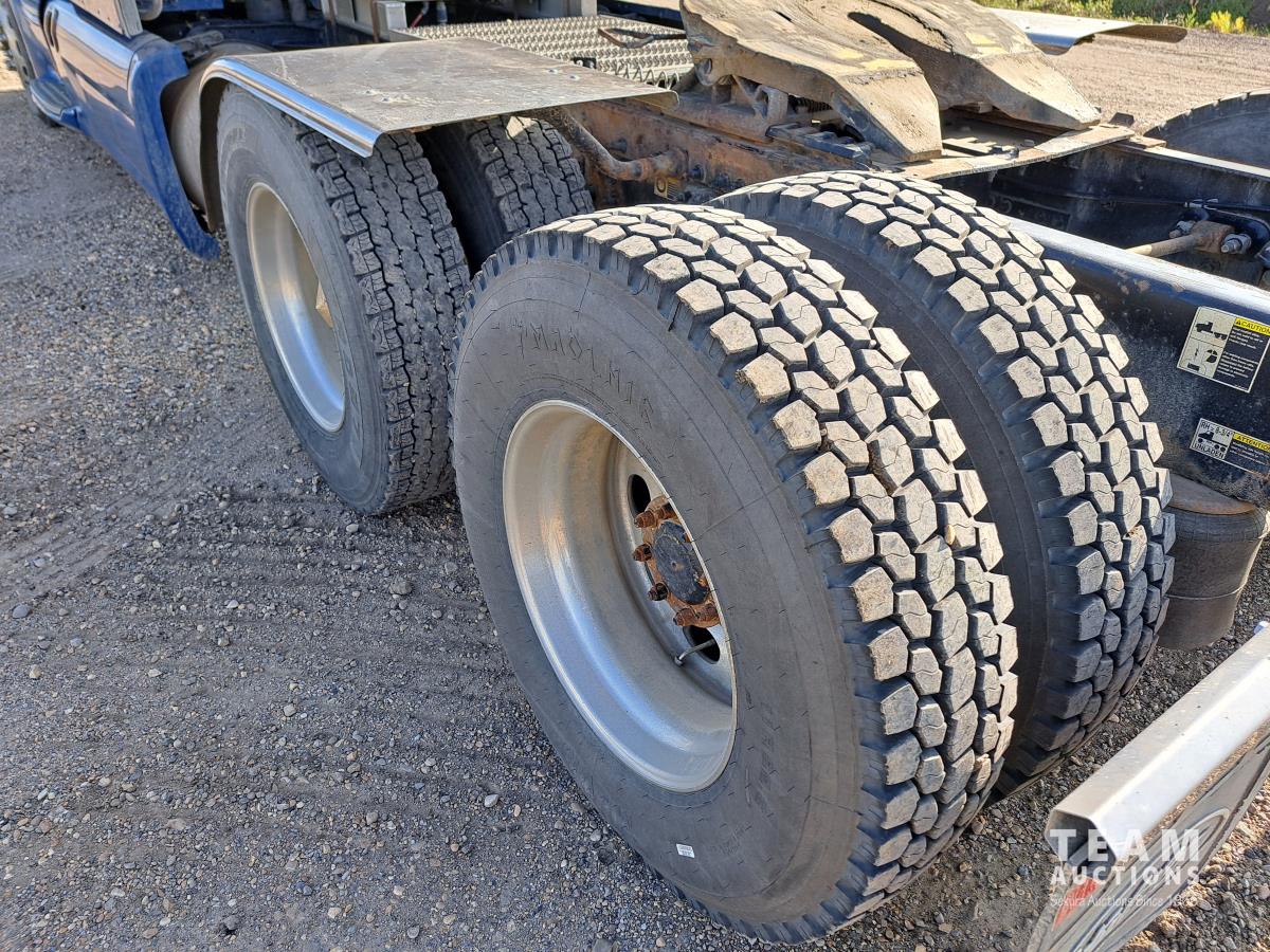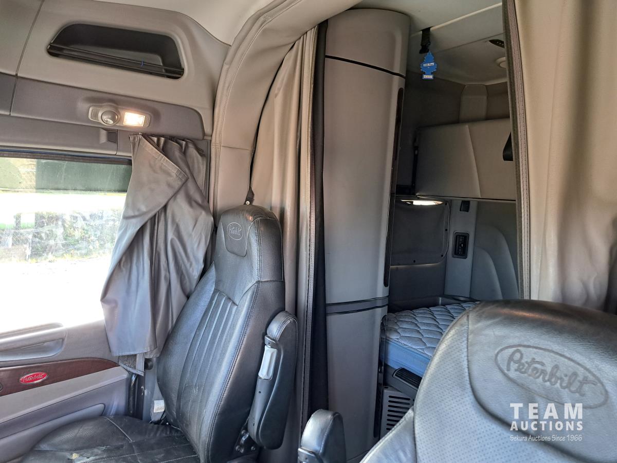 Paccar MX13 12.9 L Inline 6-Cylinder 510 HP diesel engine, DEF required, engine heater, engine brake, Eaton Fuller PACCAR TX-12 auto shift transmission, cab heater, high rise 80 inch sleeper, A/C, cruise control, leather interior, navigation system, radio, aluminum moose bumper, air ride cab, chain holders, 5,988 lb front axle, 20,000 lb rear axles, aluminum outer wheels, 11R22.5 tires