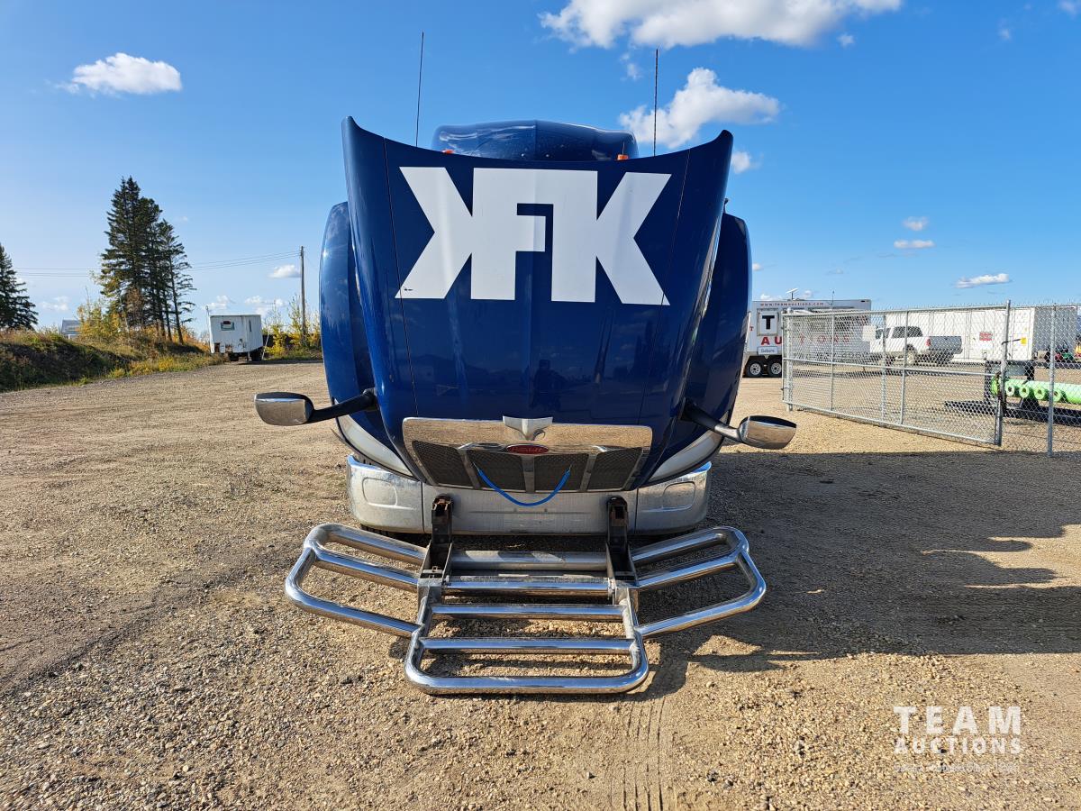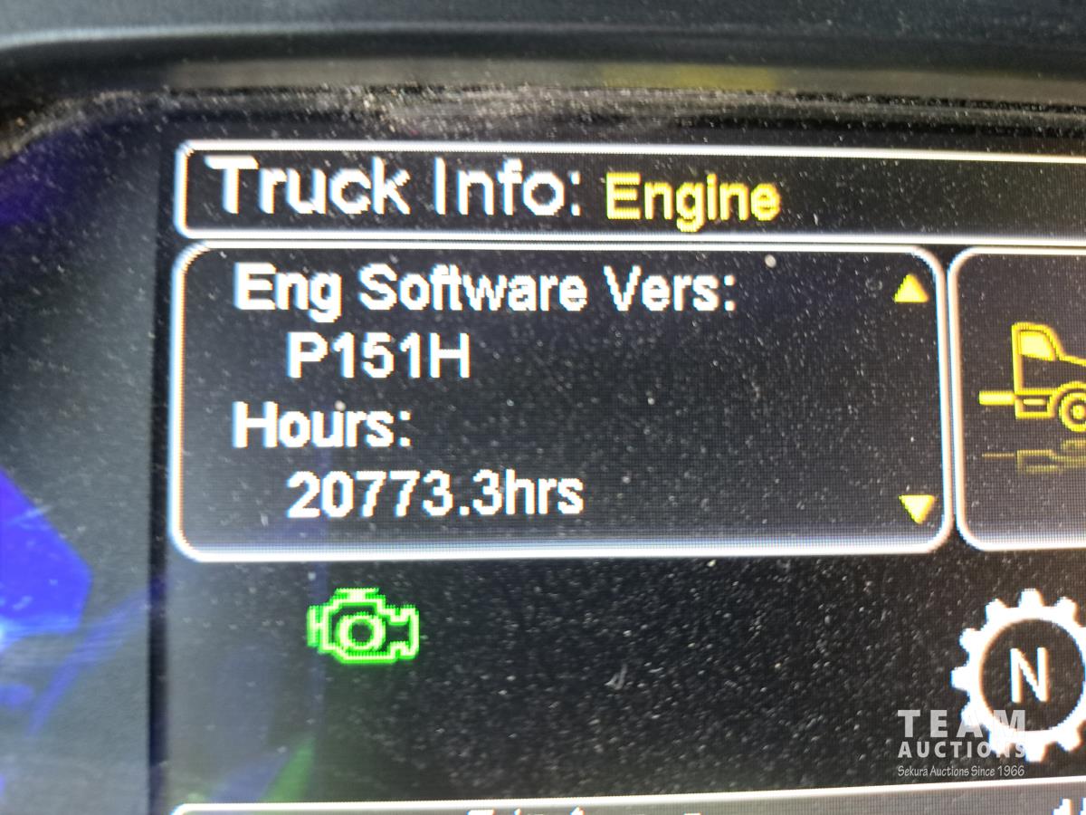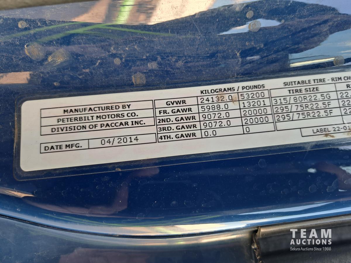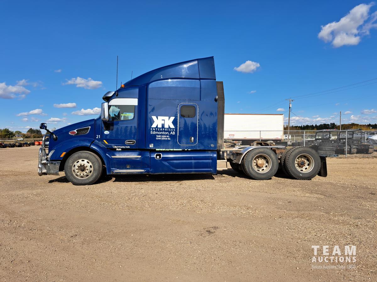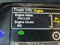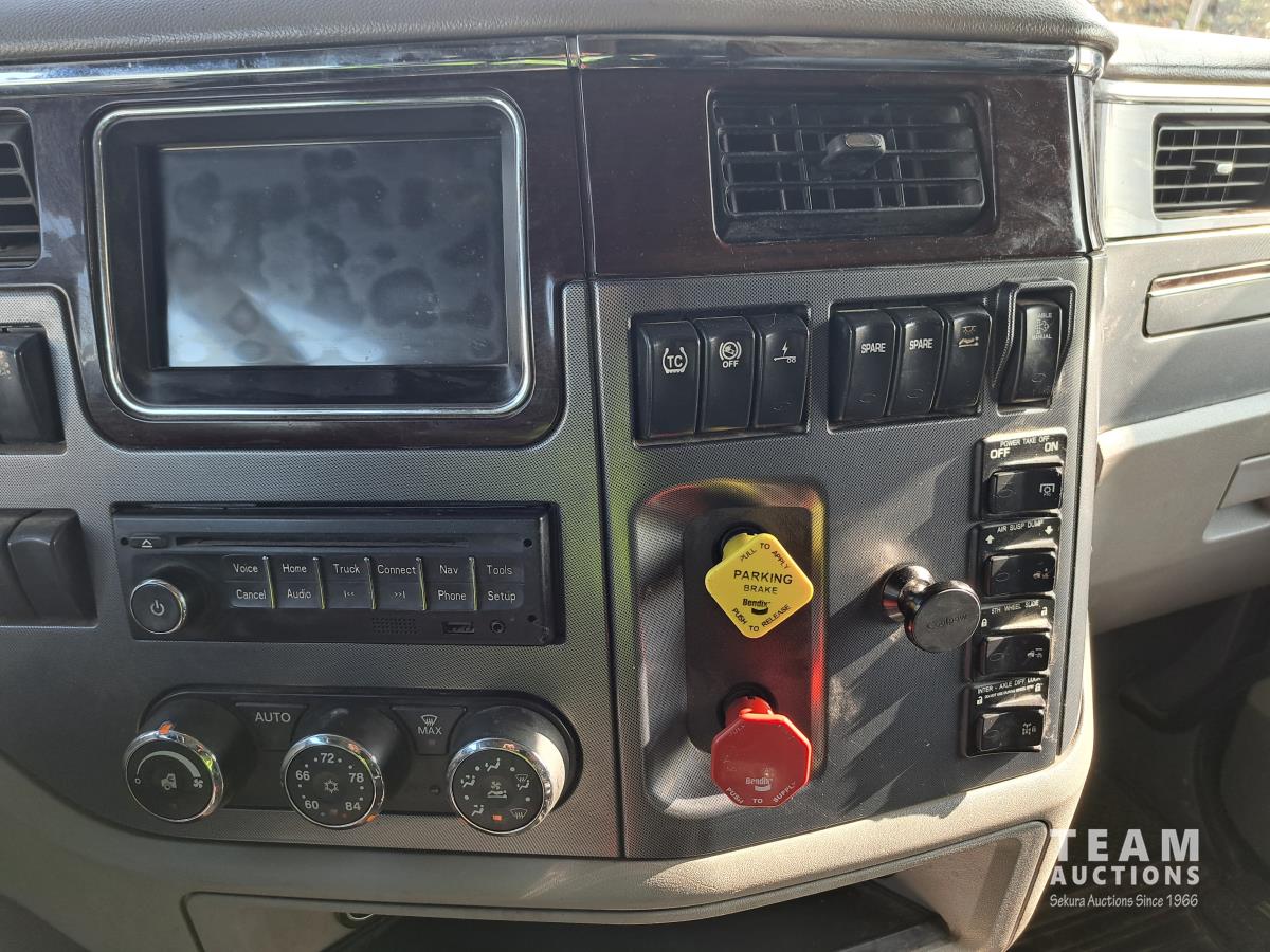 Paccar MX13 12.9 L Inline 6-Cylinder 510 HP diesel engine, DEF required, engine heater, engine brake, Eaton Fuller PACCAR TX-12 auto shift transmission, cab heater, high rise 80 inch sleeper, A/C, cruise control, leather interior, navigation system, radio, aluminum moose bumper, air ride cab, chain holders, 5,988 lb front axle, 20,000 lb rear axles, aluminum outer wheels, 11R22.5 tires