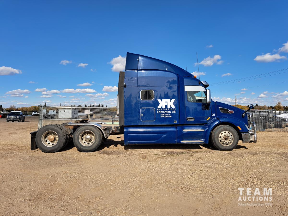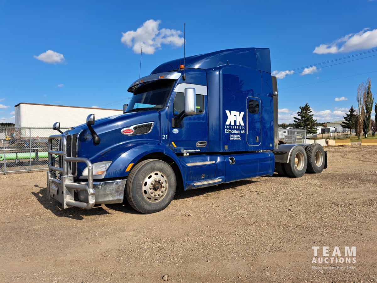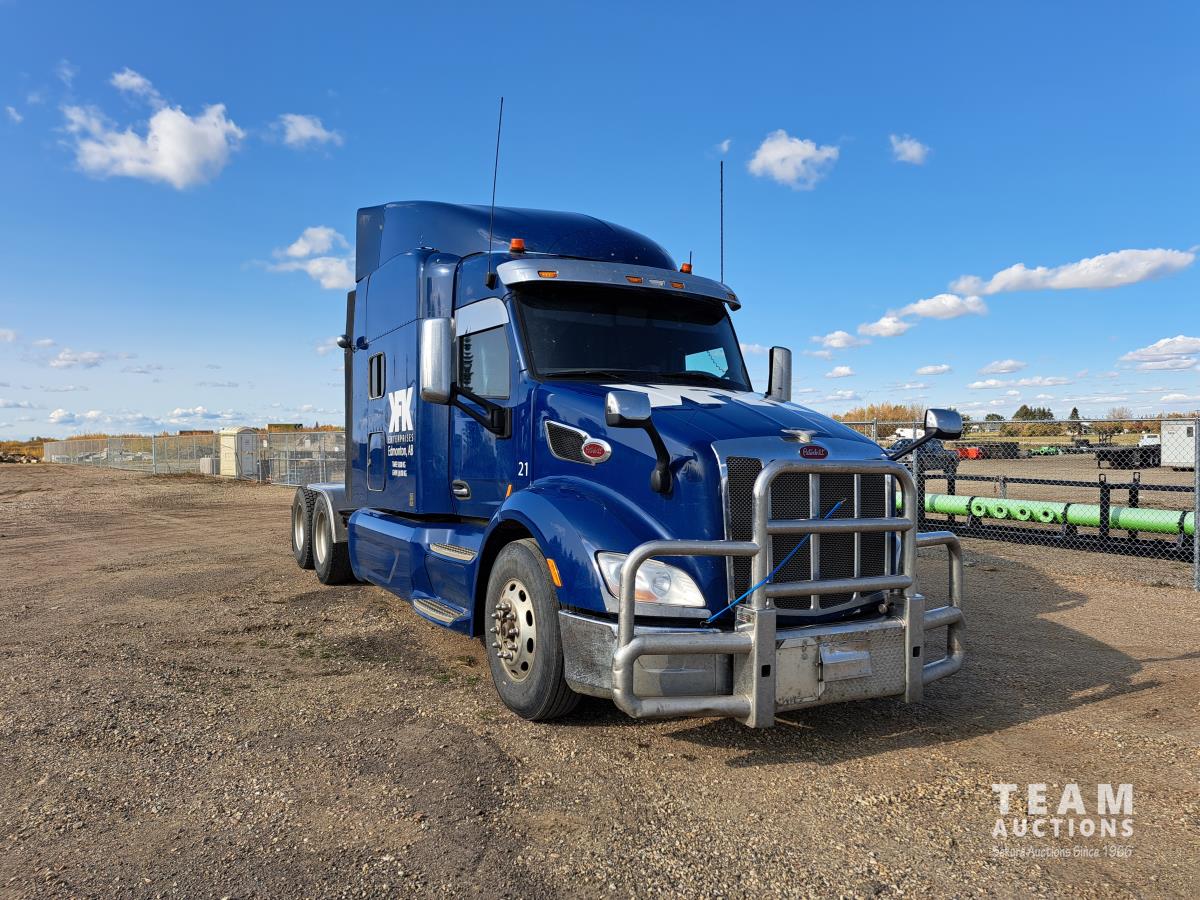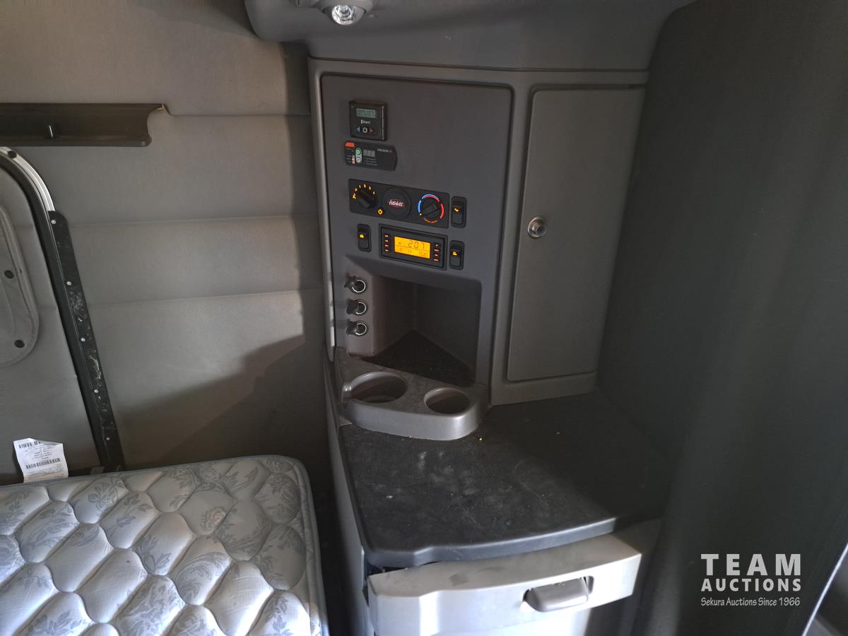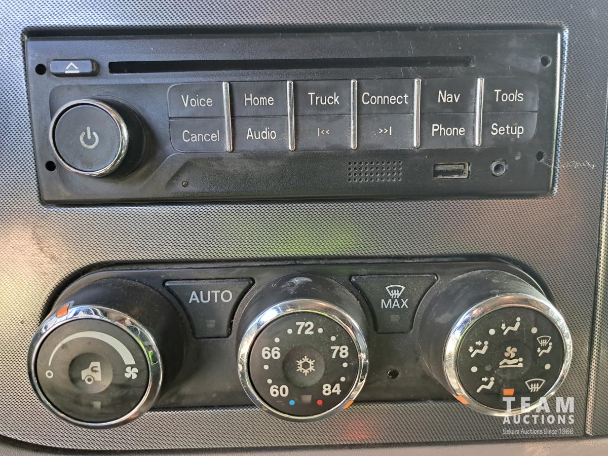 Paccar MX13 12.9 L Inline 6-Cylinder 510 HP diesel engine, DEF required, engine heater, engine brake, Eaton Fuller PACCAR TX-12 auto shift transmission, cab heater, high rise 80 inch sleeper, A/C, cruise control, leather interior, navigation system, radio, aluminum moose bumper, air ride cab, chain holders, 5,988 lb front axle, 20,000 lb rear axles, aluminum outer wheels, 11R22.5 tires