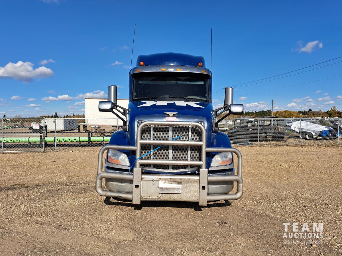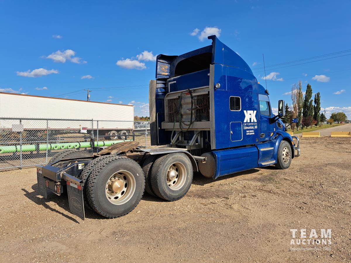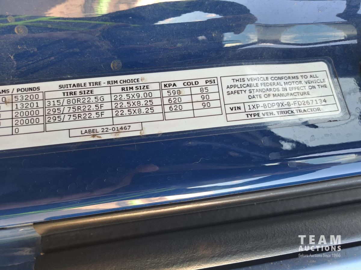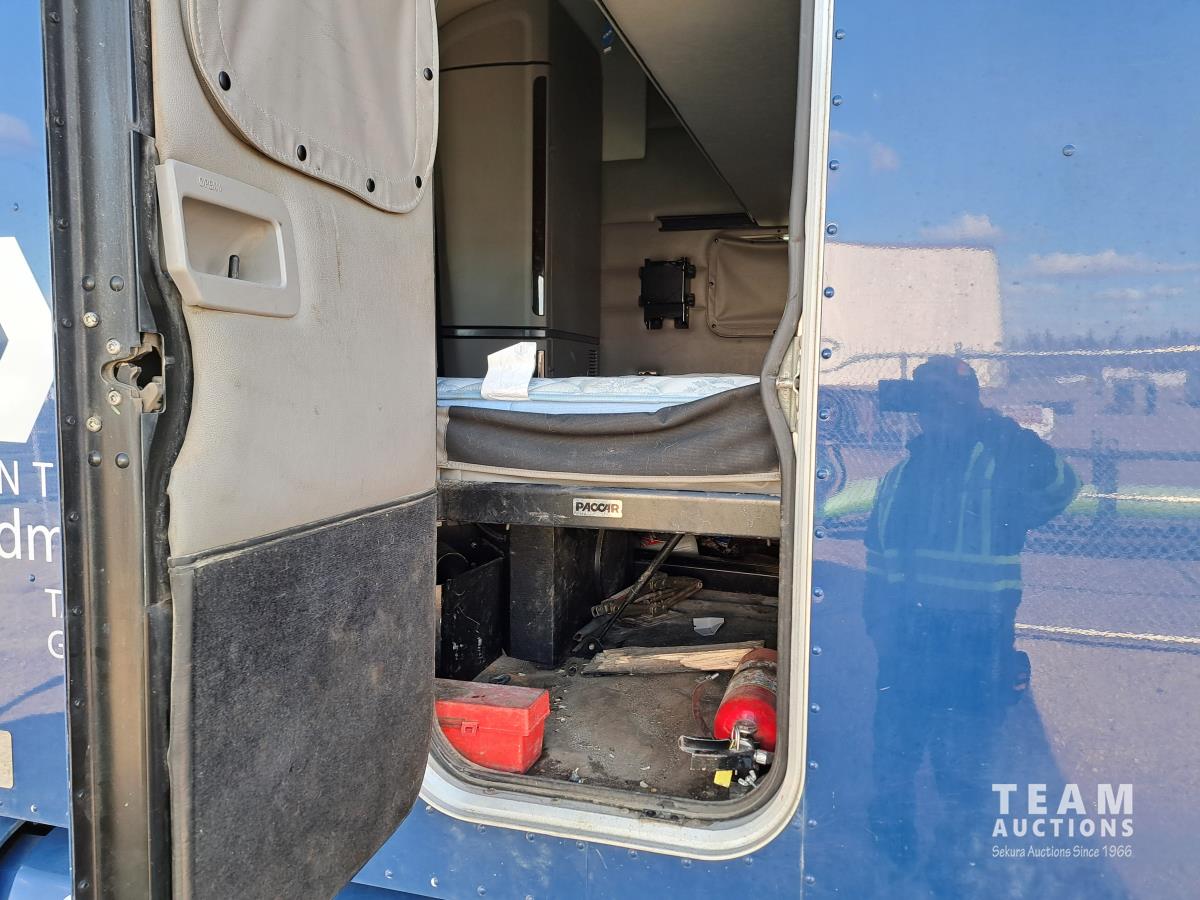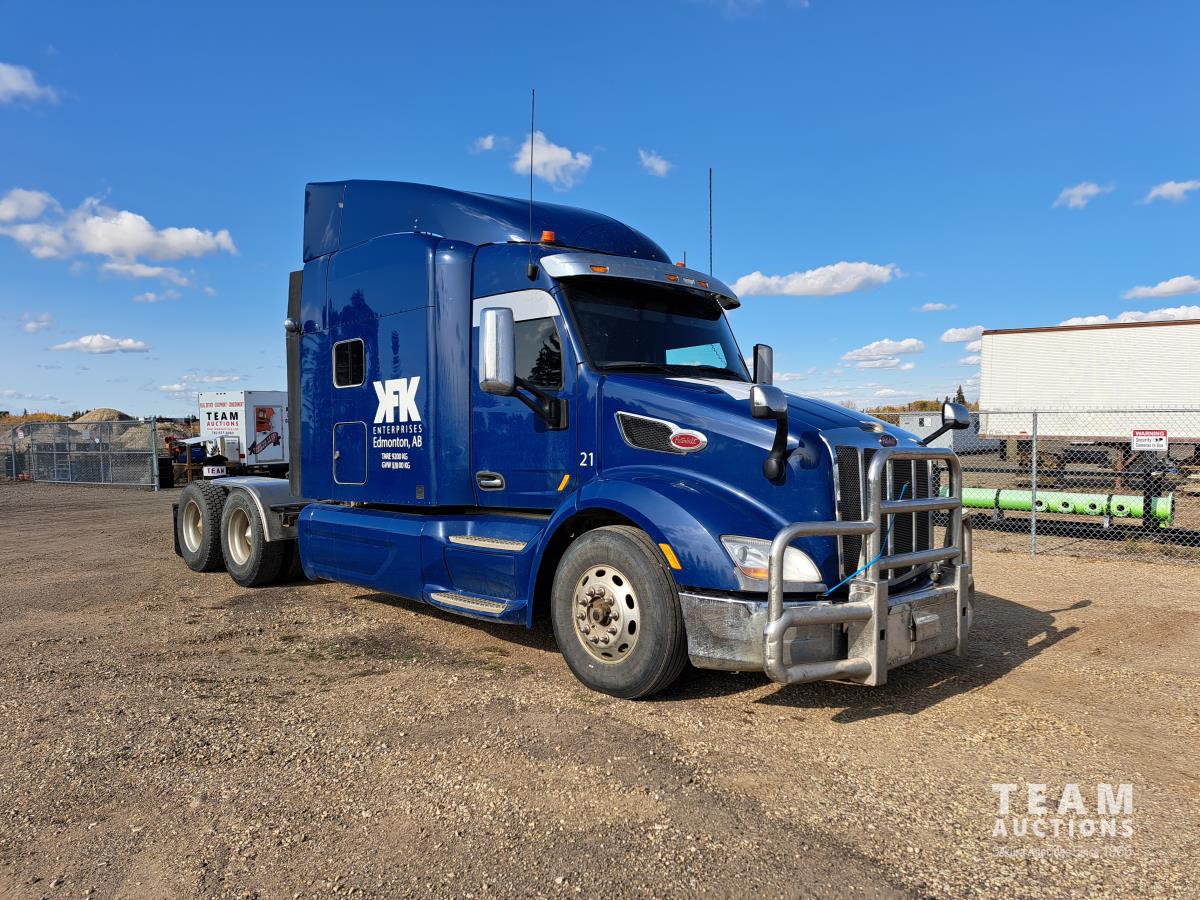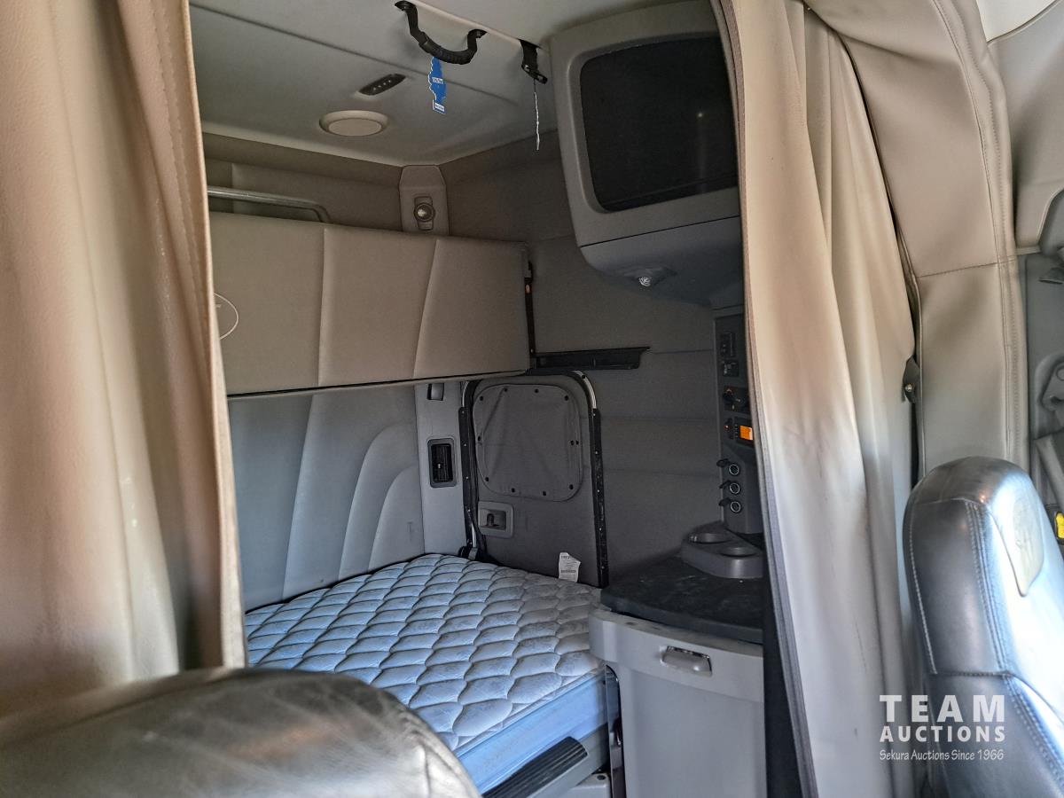 Paccar MX13 12.9 L Inline 6-Cylinder 510 HP diesel engine, DEF required, engine heater, engine brake, Eaton Fuller PACCAR TX-12 auto shift transmission, cab heater, high rise 80 inch sleeper, A/C, cruise control, leather interior, navigation system, radio, aluminum moose bumper, air ride cab, chain holders, 5,988 lb front axle, 20,000 lb rear axles, aluminum outer wheels, 11R22.5 tires