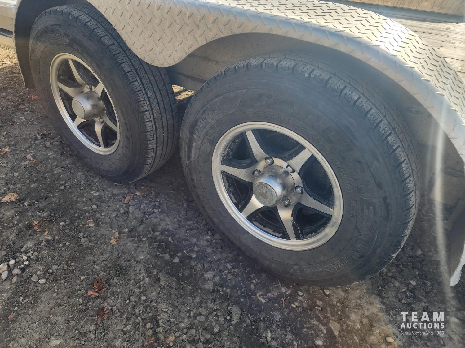 82 inch wide deck, wood deck, slide in ramps, spring suspension, ball hitch, rub rails, stake pockets, LED lights, spare tire, 5200 lb axles, 225/75R15 tires