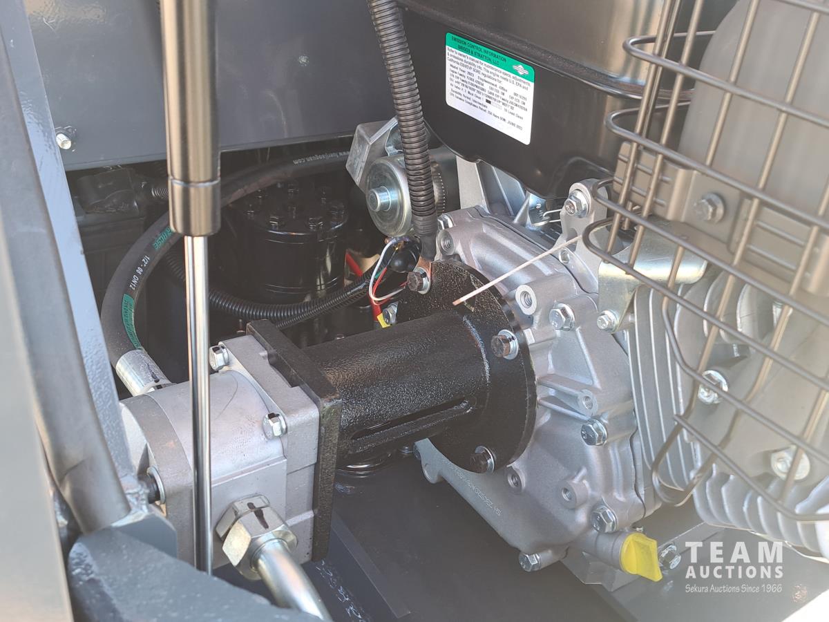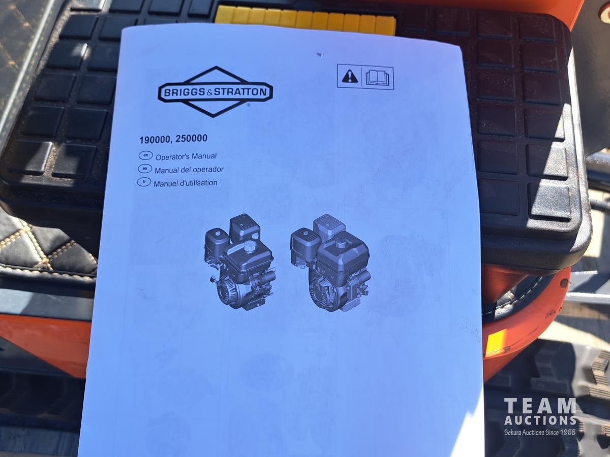 13.5 HP Briggs and Stratton gas engine, mechanical thumb, 36 inch backfill blade, 16 inch tooth bucket, auxiliary hydraulic outlets, LED lights, overall dimensions 91 inch long x 39 inch wide x 83 inch high, track length 48.43 inch x 7 inch wide, digging bucket capacity 583 lb, tool kit and operators manual