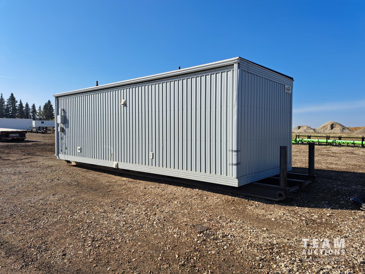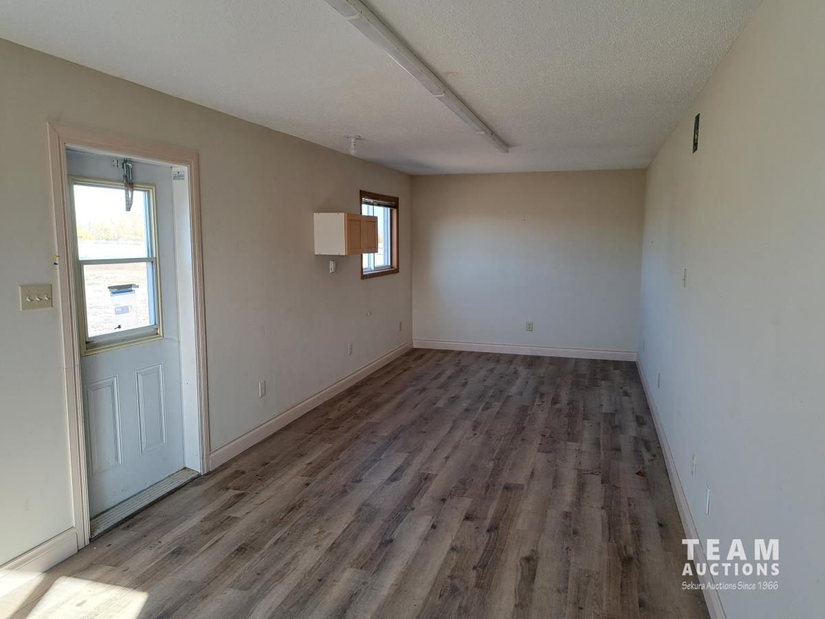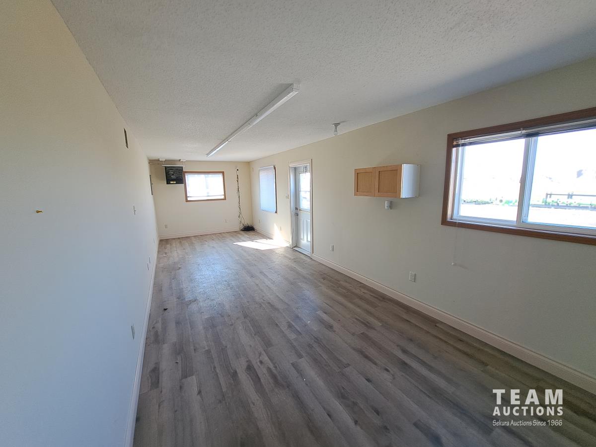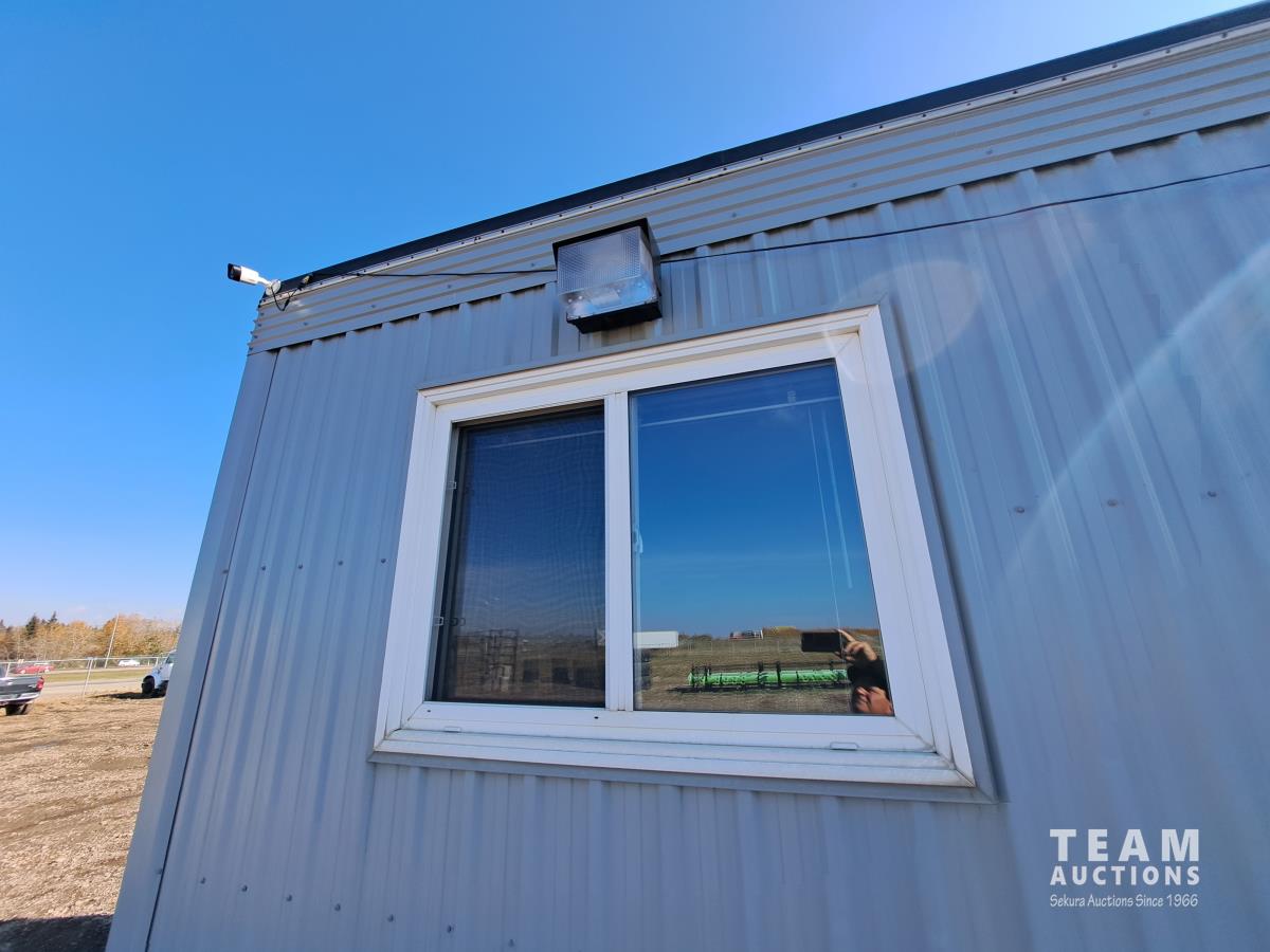 Sloped roof, eaves troughs, metal siding, 6.5 inch x 12 inch skid beams, 1 door, 3 windows, exterior electrical outlets, exterior lights, open floor plan, recently refurbished with new flooring, paint and stipple, comes with large roll of 5 wire cable for rig up.