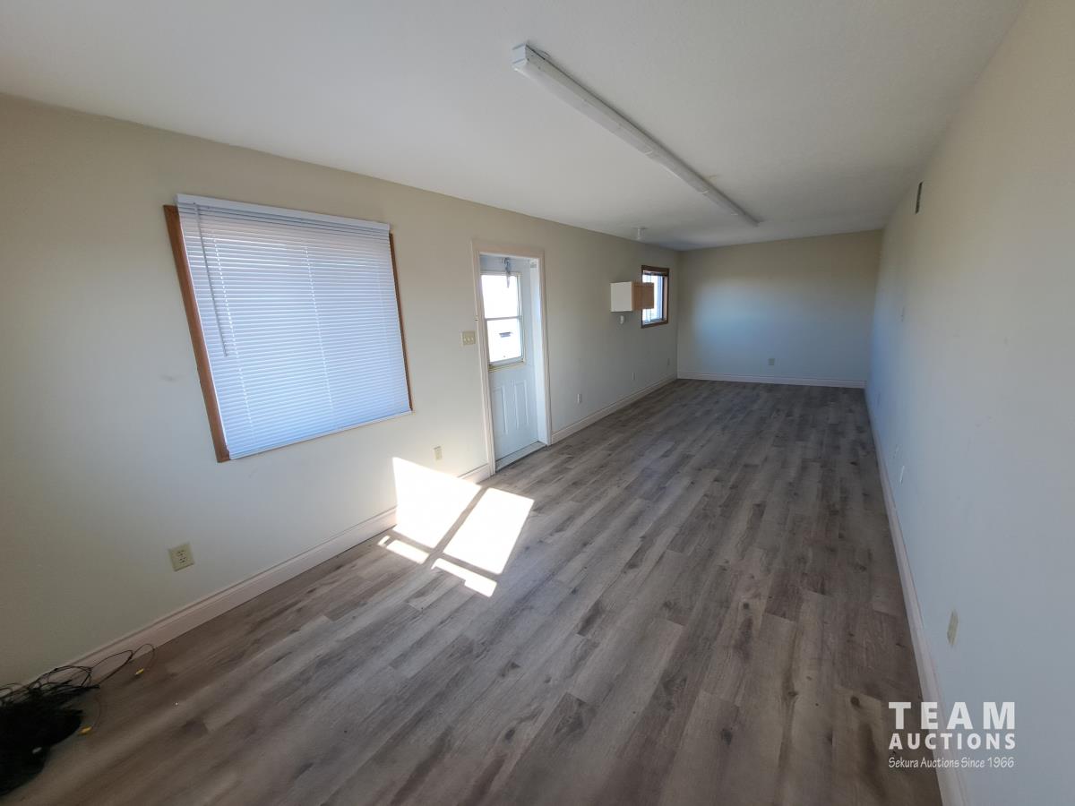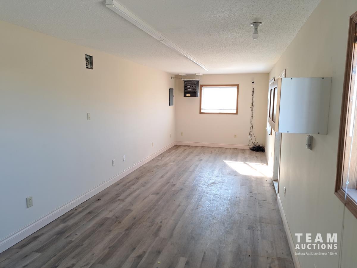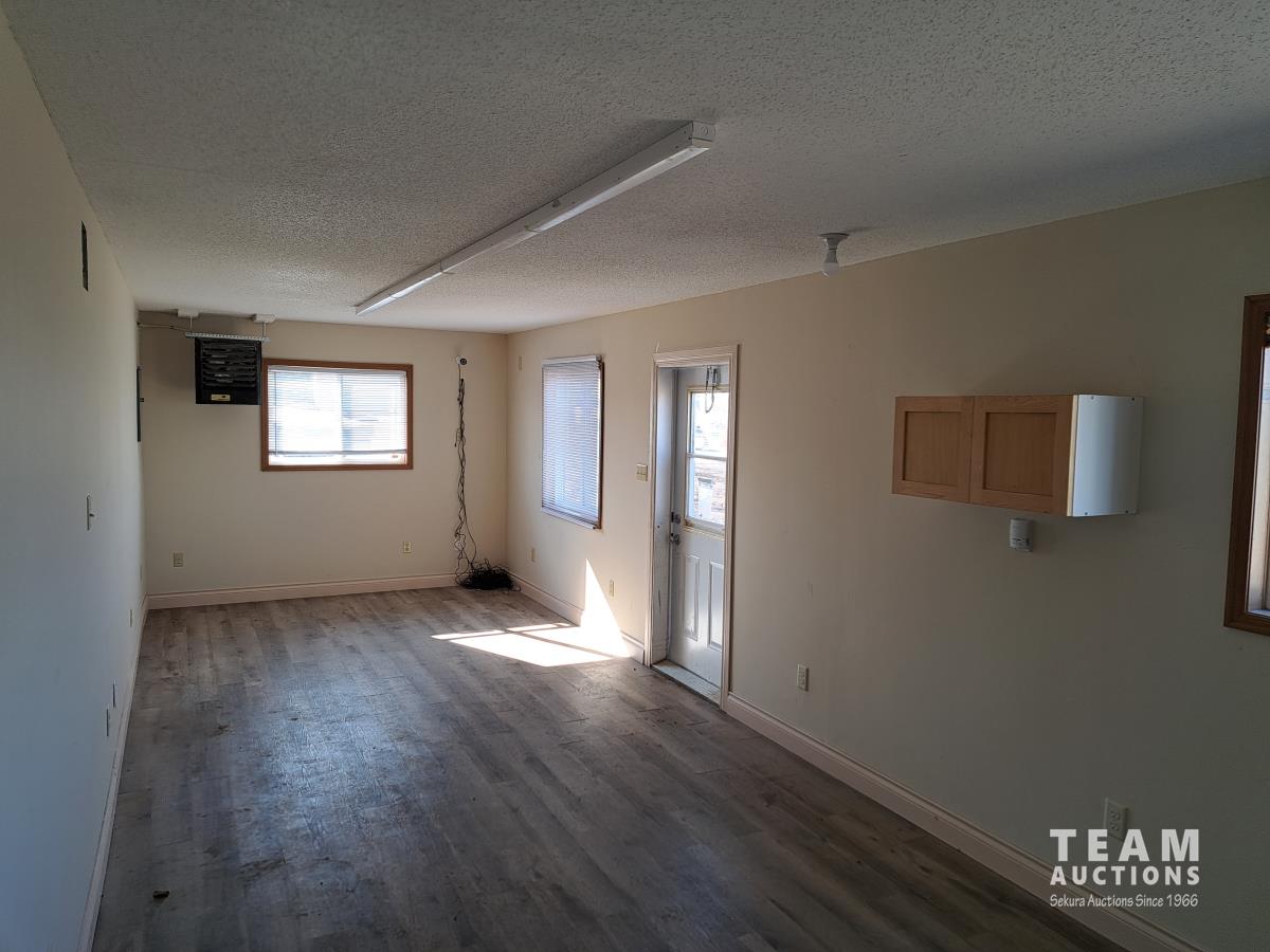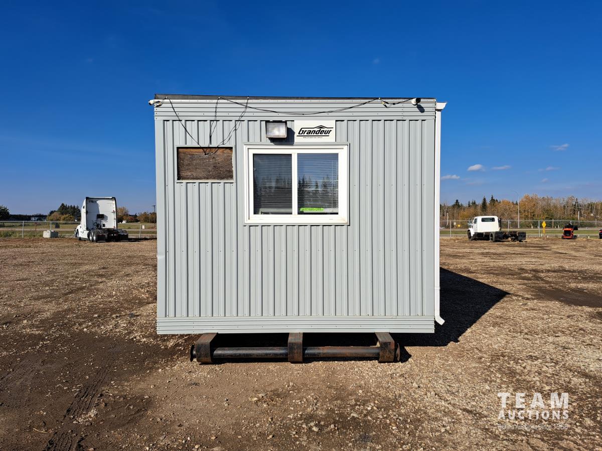 Sloped roof, eaves troughs, metal siding, 6.5 inch x 12 inch skid beams, 1 door, 3 windows, exterior electrical outlets, exterior lights, open floor plan, recently refurbished with new flooring, paint and stipple, comes with large roll of 5 wire cable for rig up.