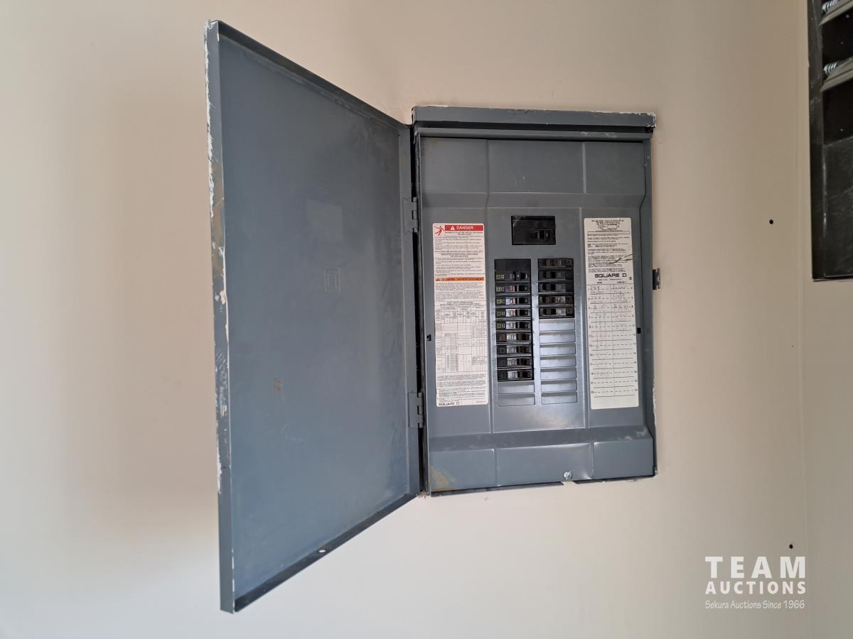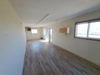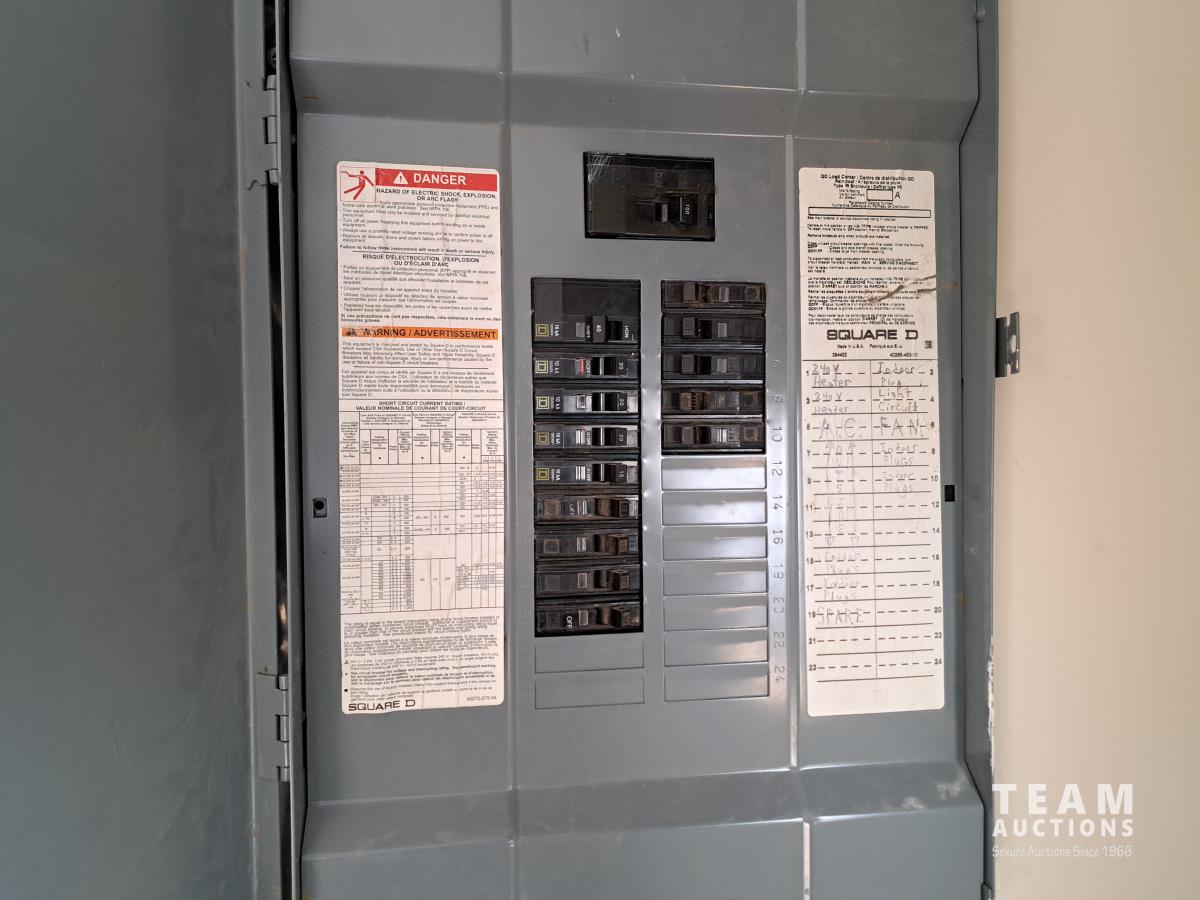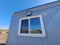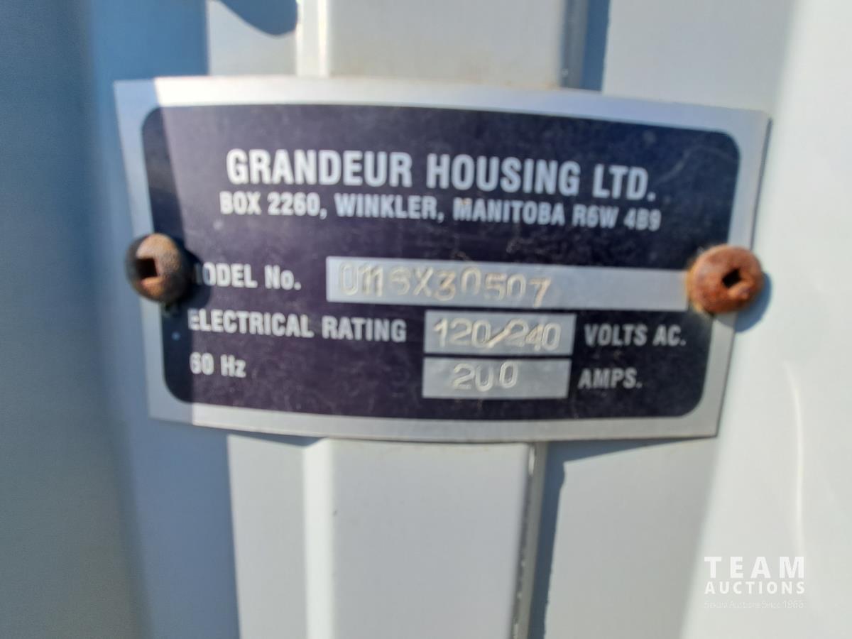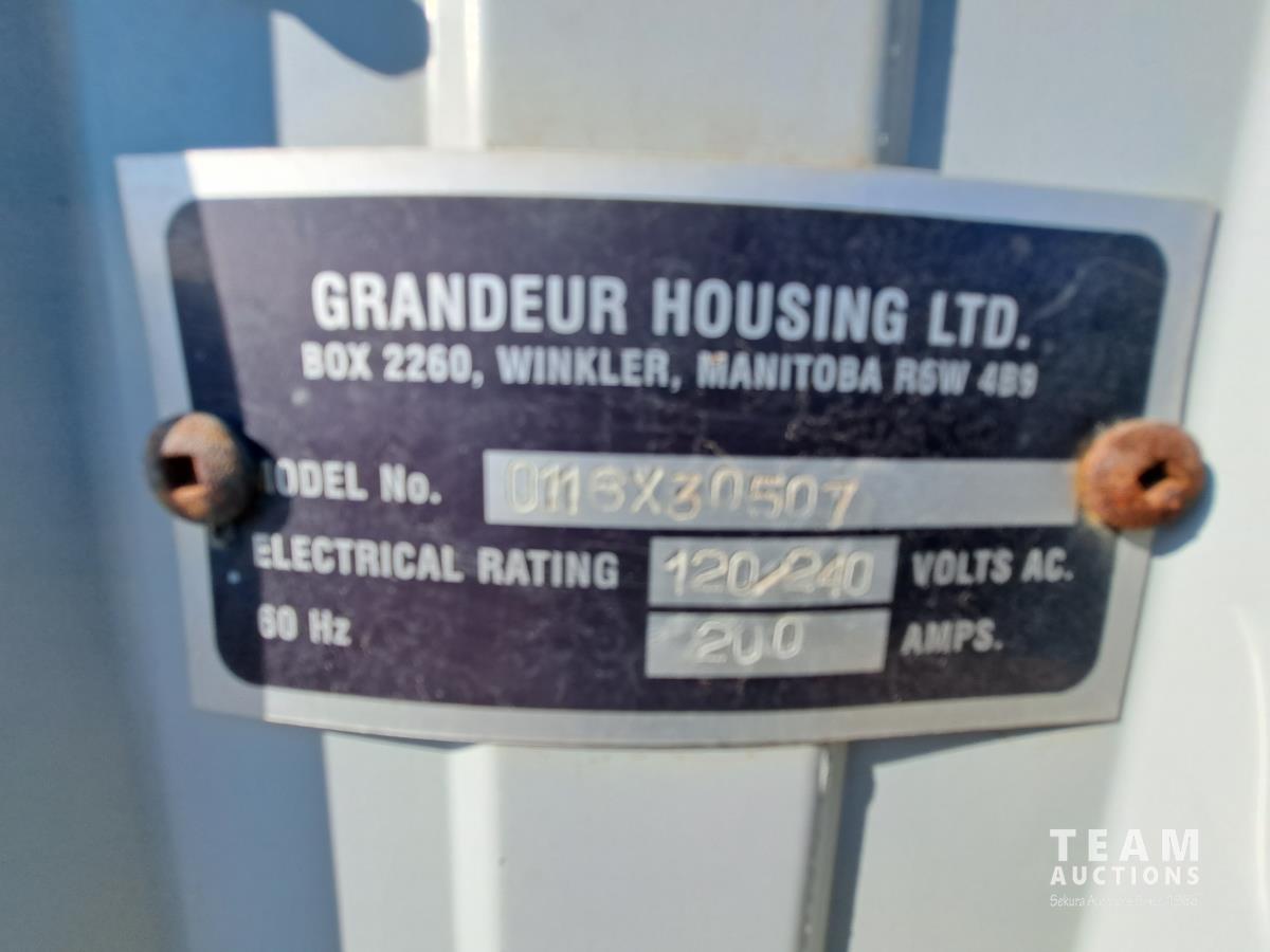 Sloped roof, eaves troughs, metal siding, 6.5 inch x 12 inch skid beams, 1 door, 3 windows, exterior electrical outlets, exterior lights, open floor plan, recently refurbished with new flooring, paint and stipple, comes with large roll of 5 wire cable for rig up.