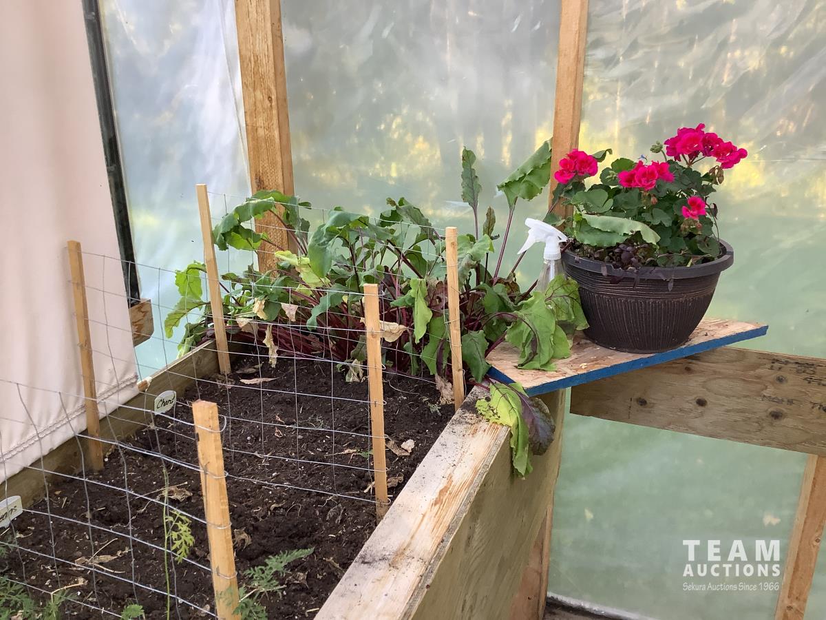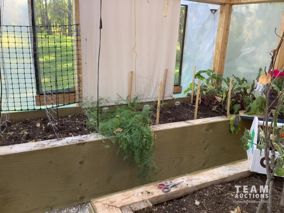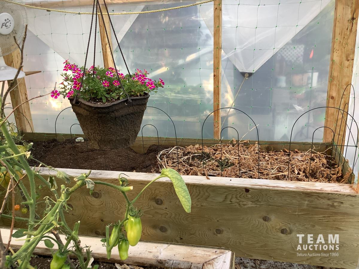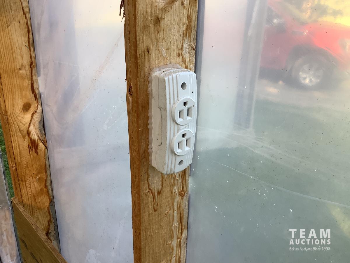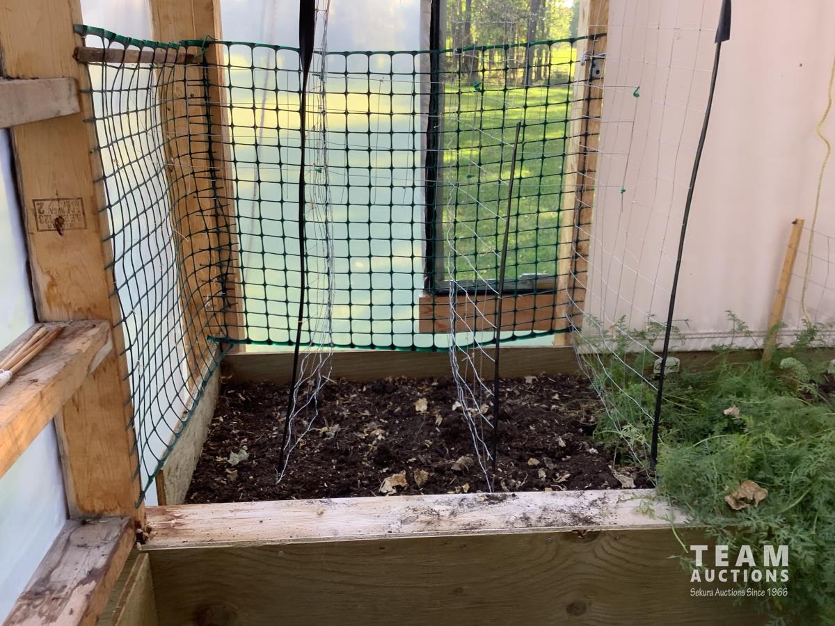 133 inch high, 3 bottom skids, wired inside with light and plug-ins, adjustable air openings, planting beds, fan