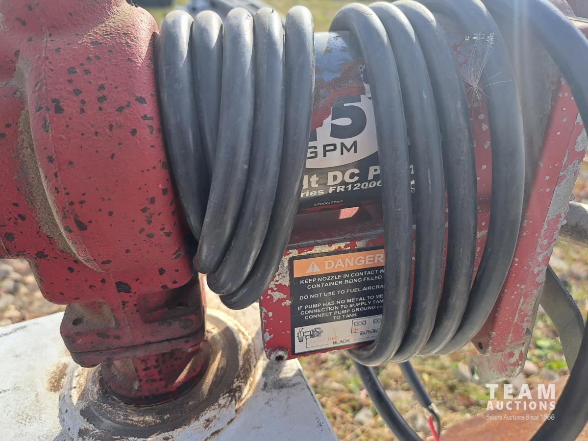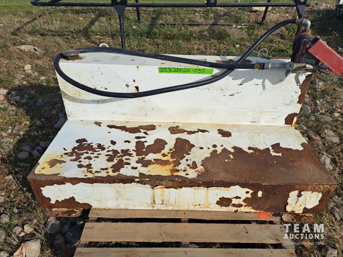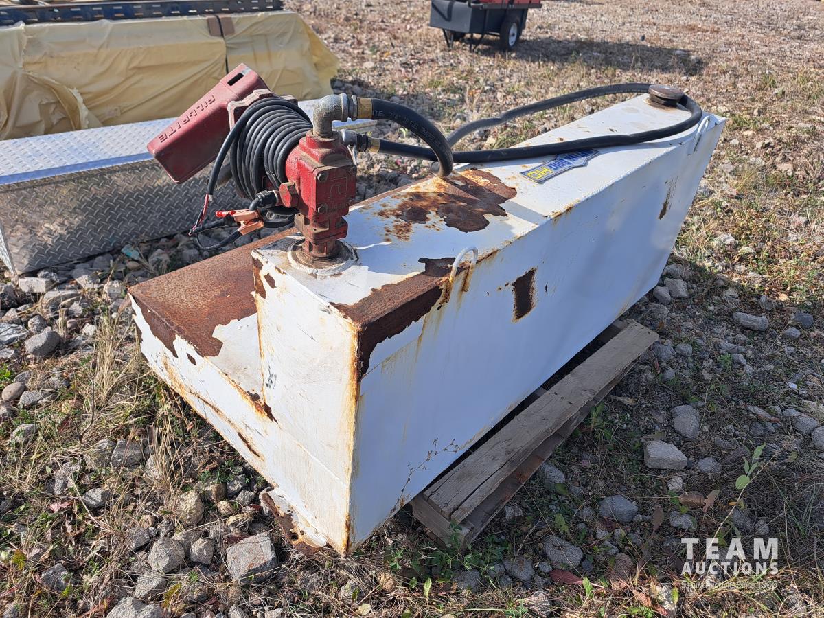 5 ft l x 31 inch deep on bottom, 24 inch tall, Fill Rite 12V 15 GPM pump, hose, nozzle, securement brackets