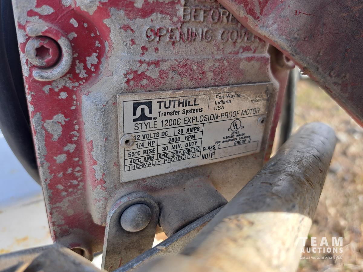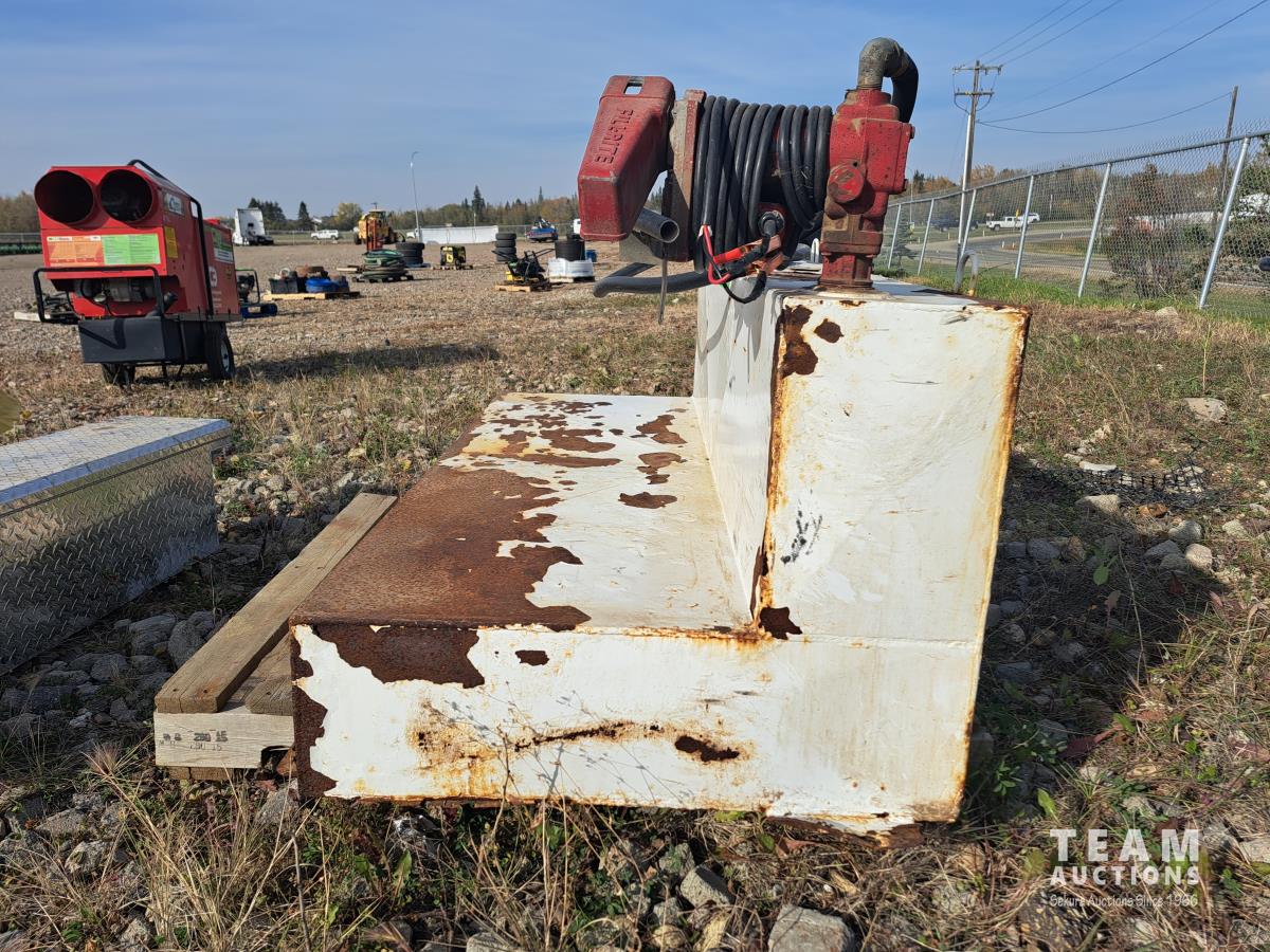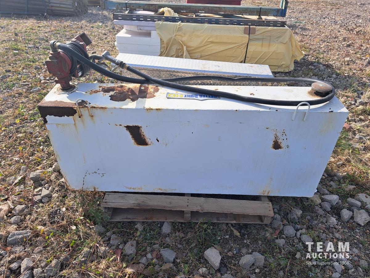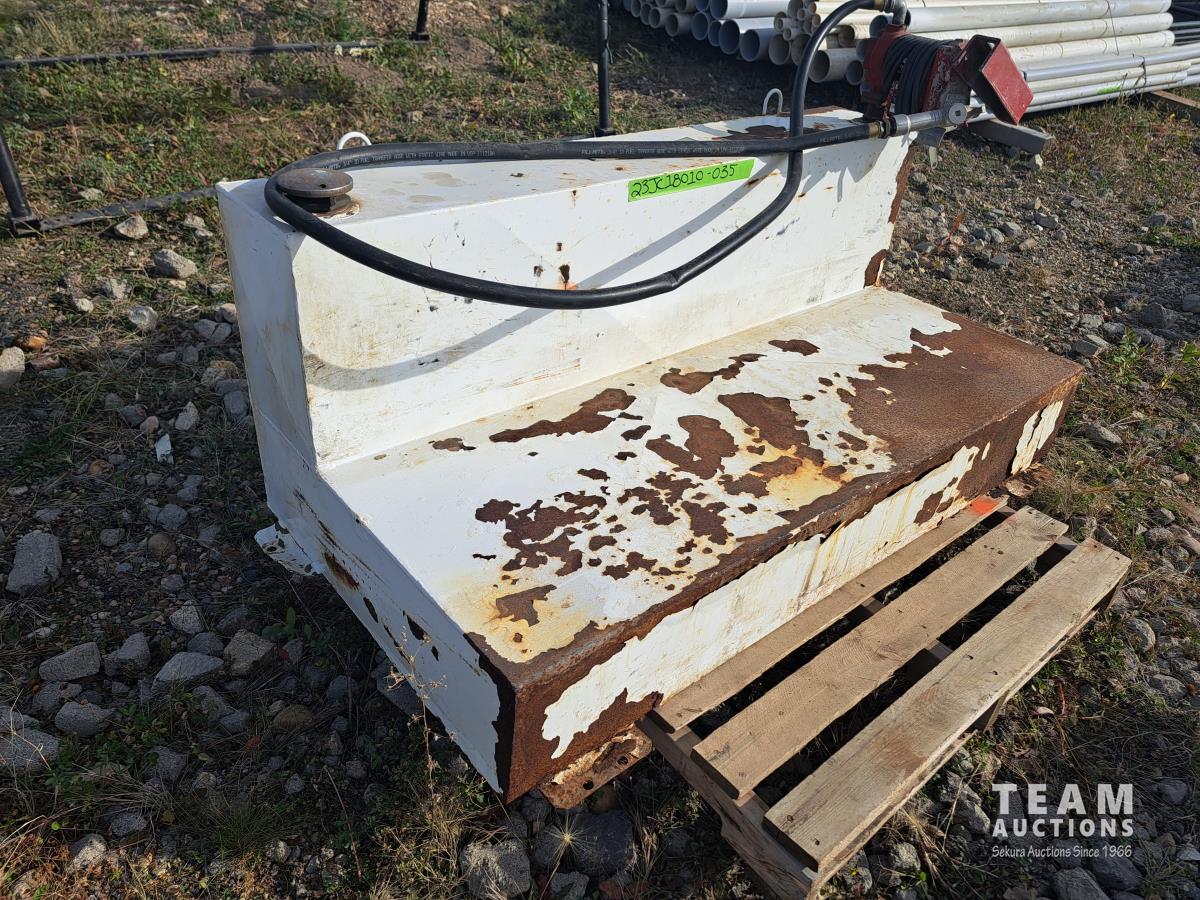 5 ft l x 31 inch deep on bottom, 24 inch tall, Fill Rite 12V 15 GPM pump, hose, nozzle, securement brackets