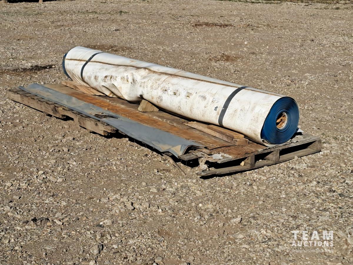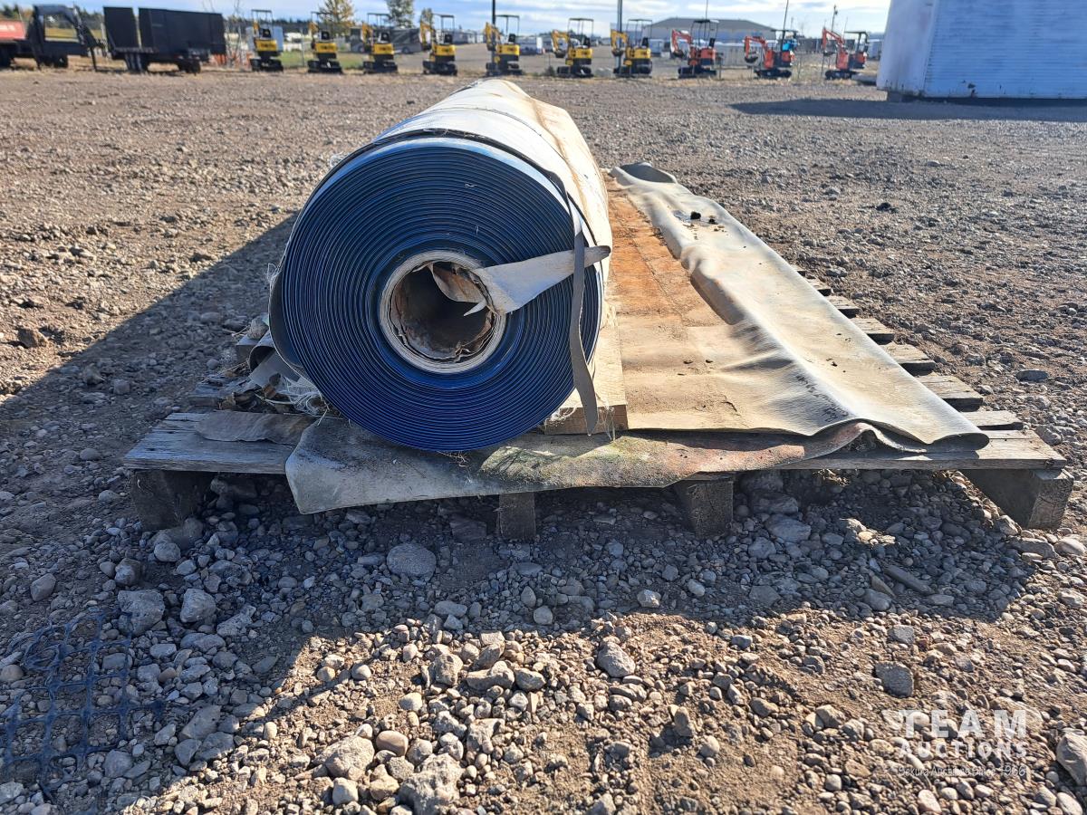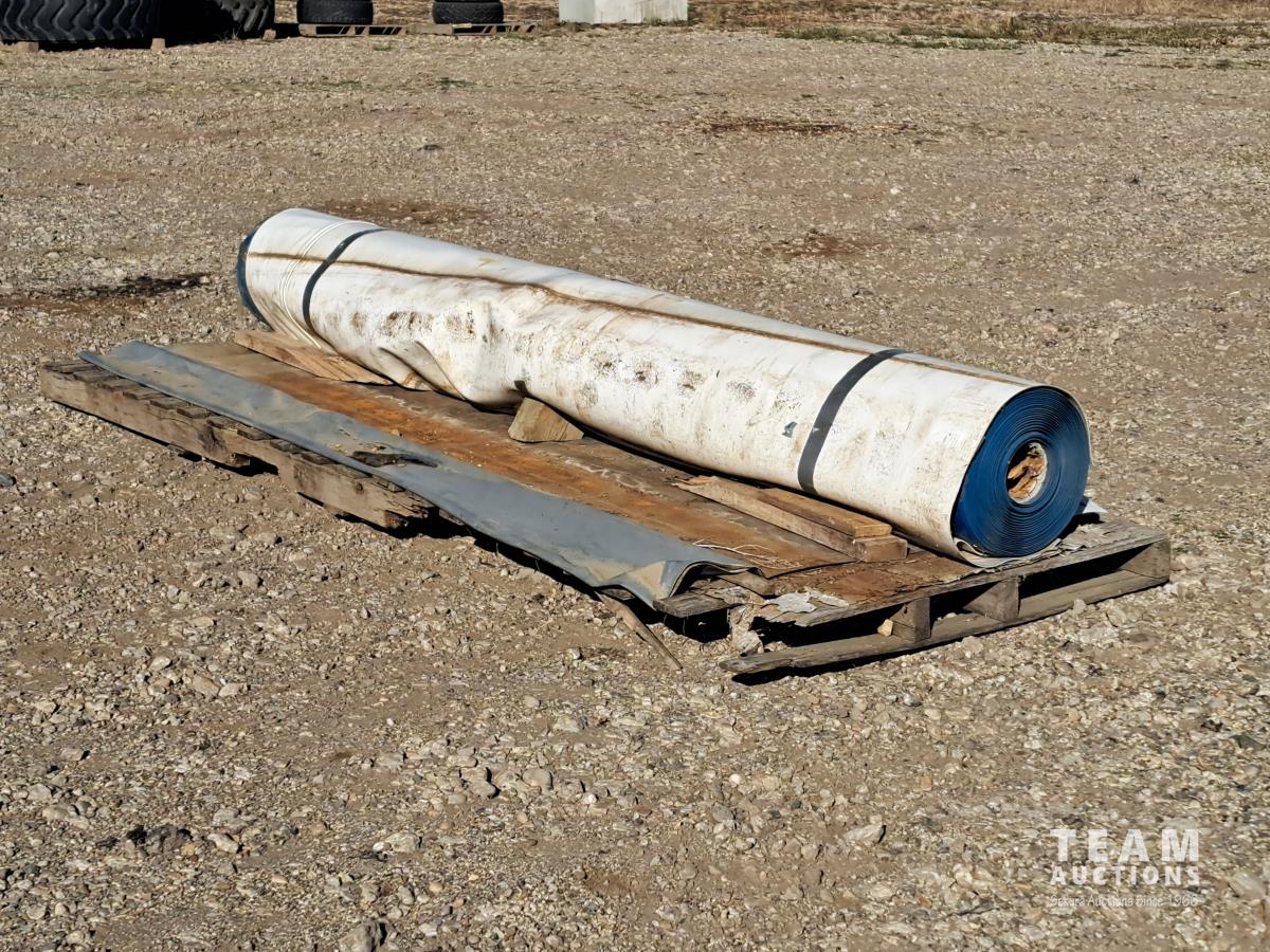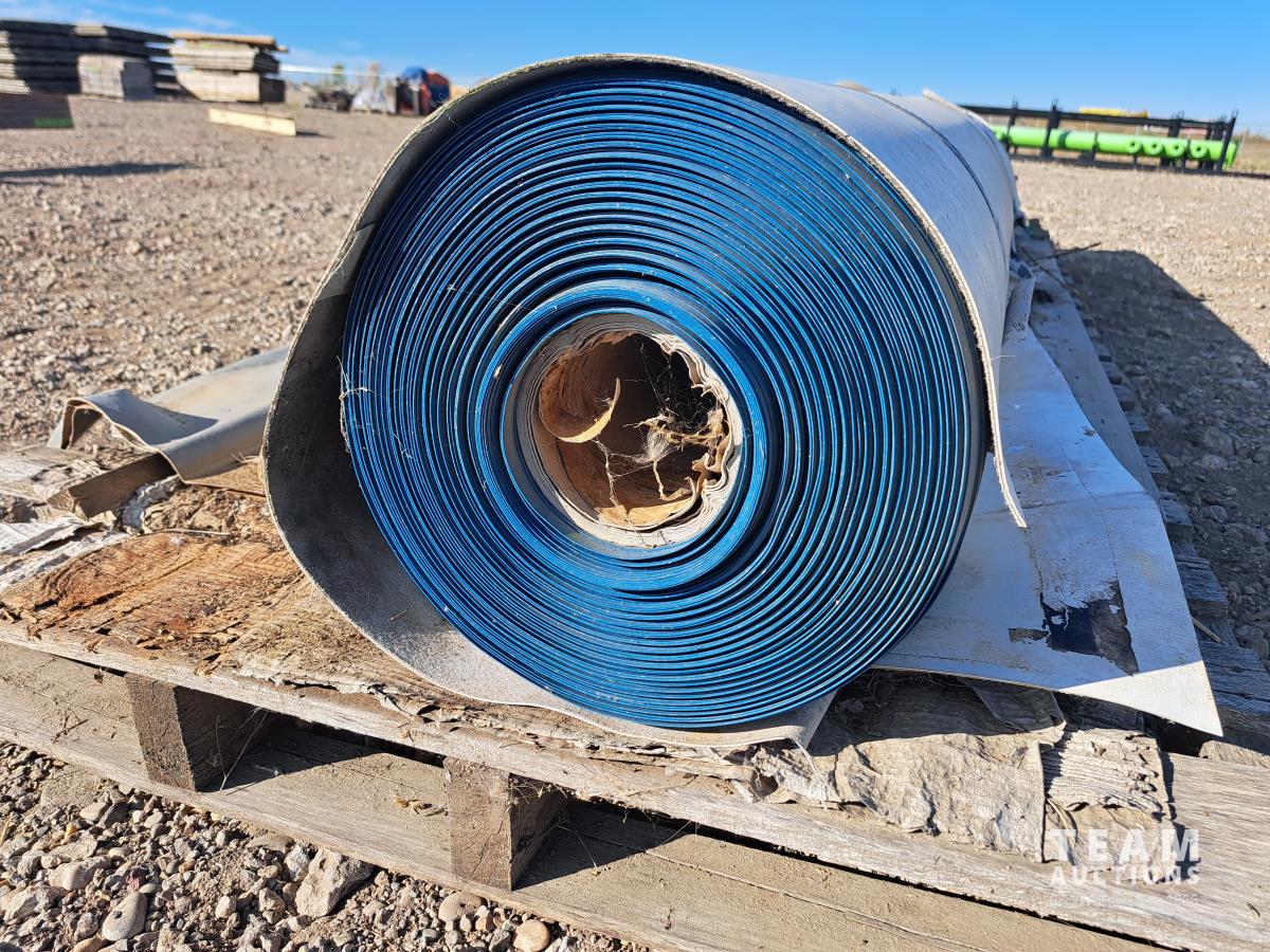 10 ft wide, length unknown, looks to be a full roll. Barrel has hose and fitting