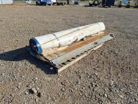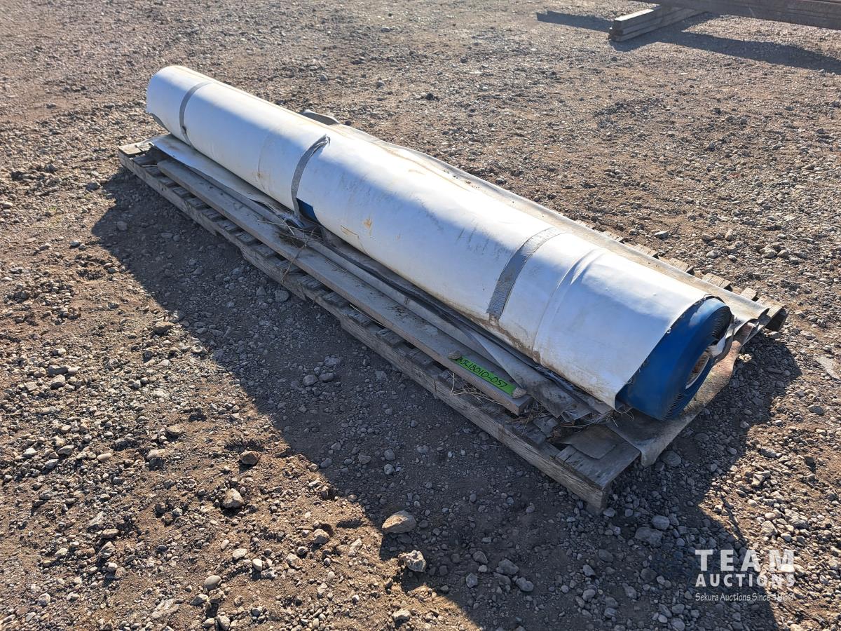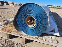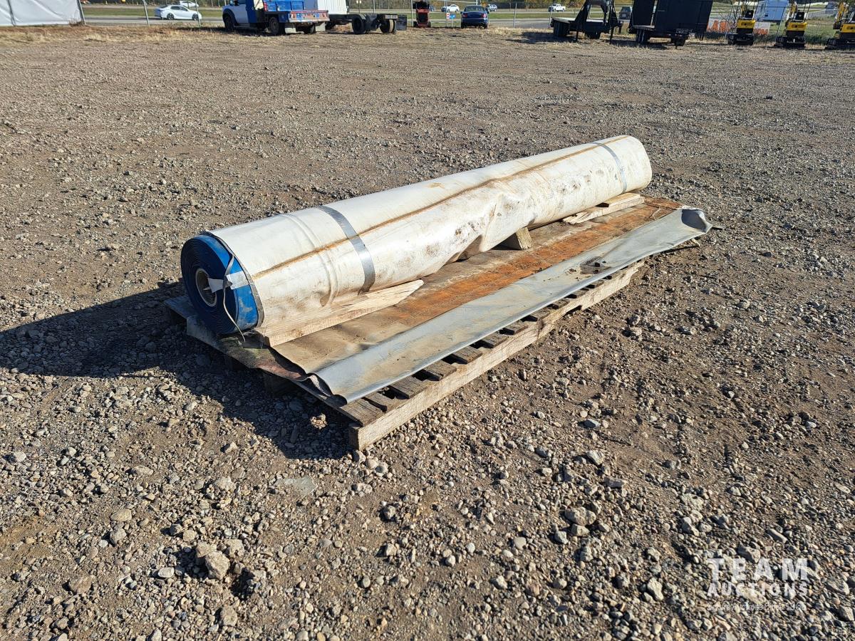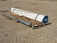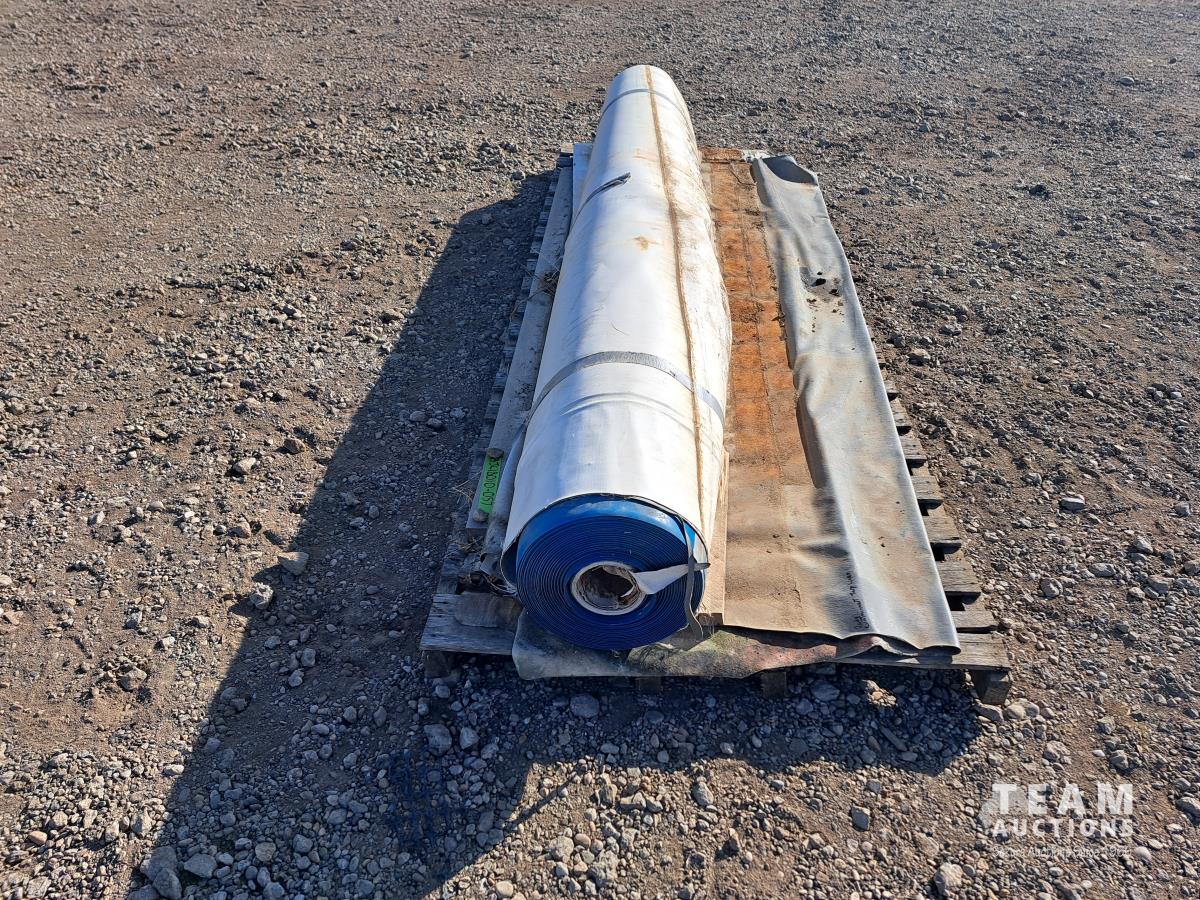 10 ft wide, length unknown, looks to be a full roll. Barrel has hose and fitting