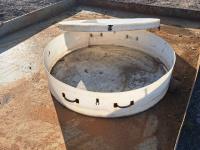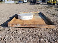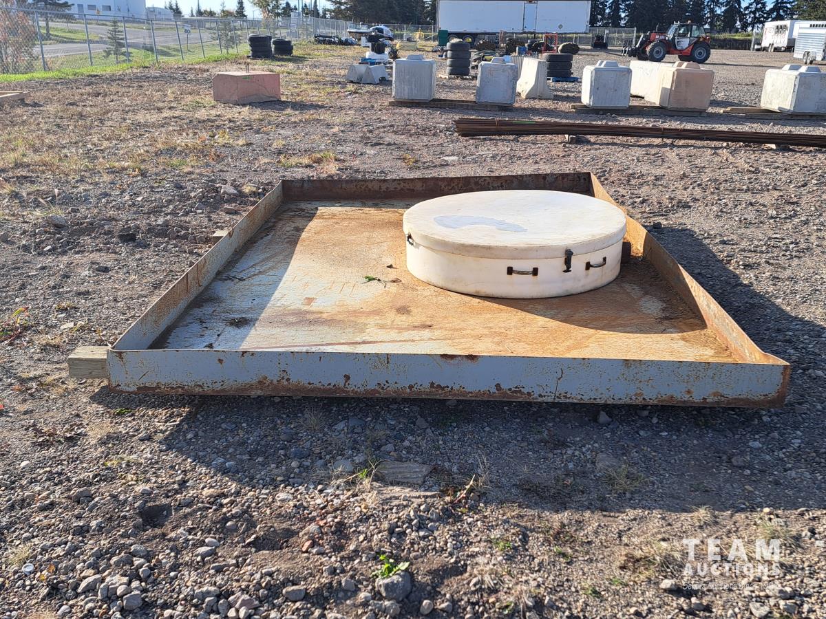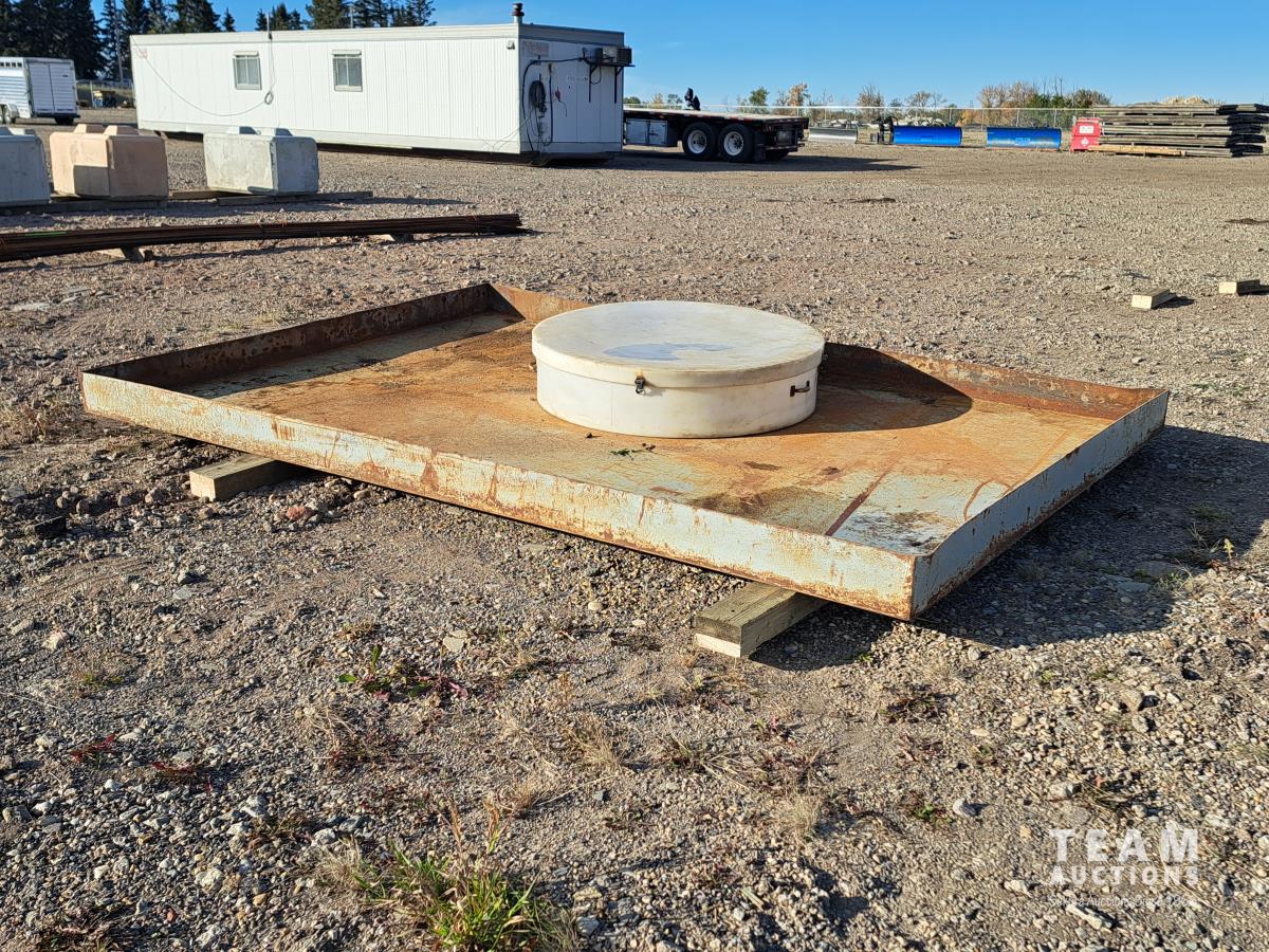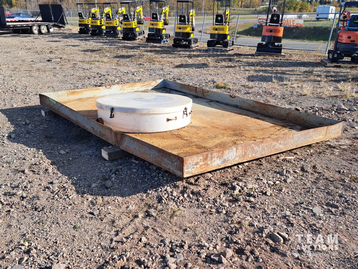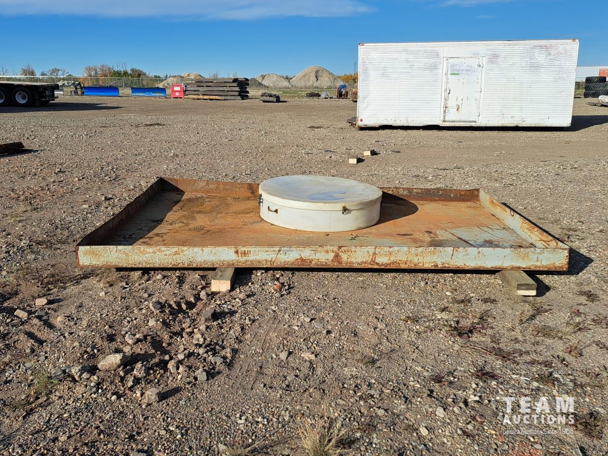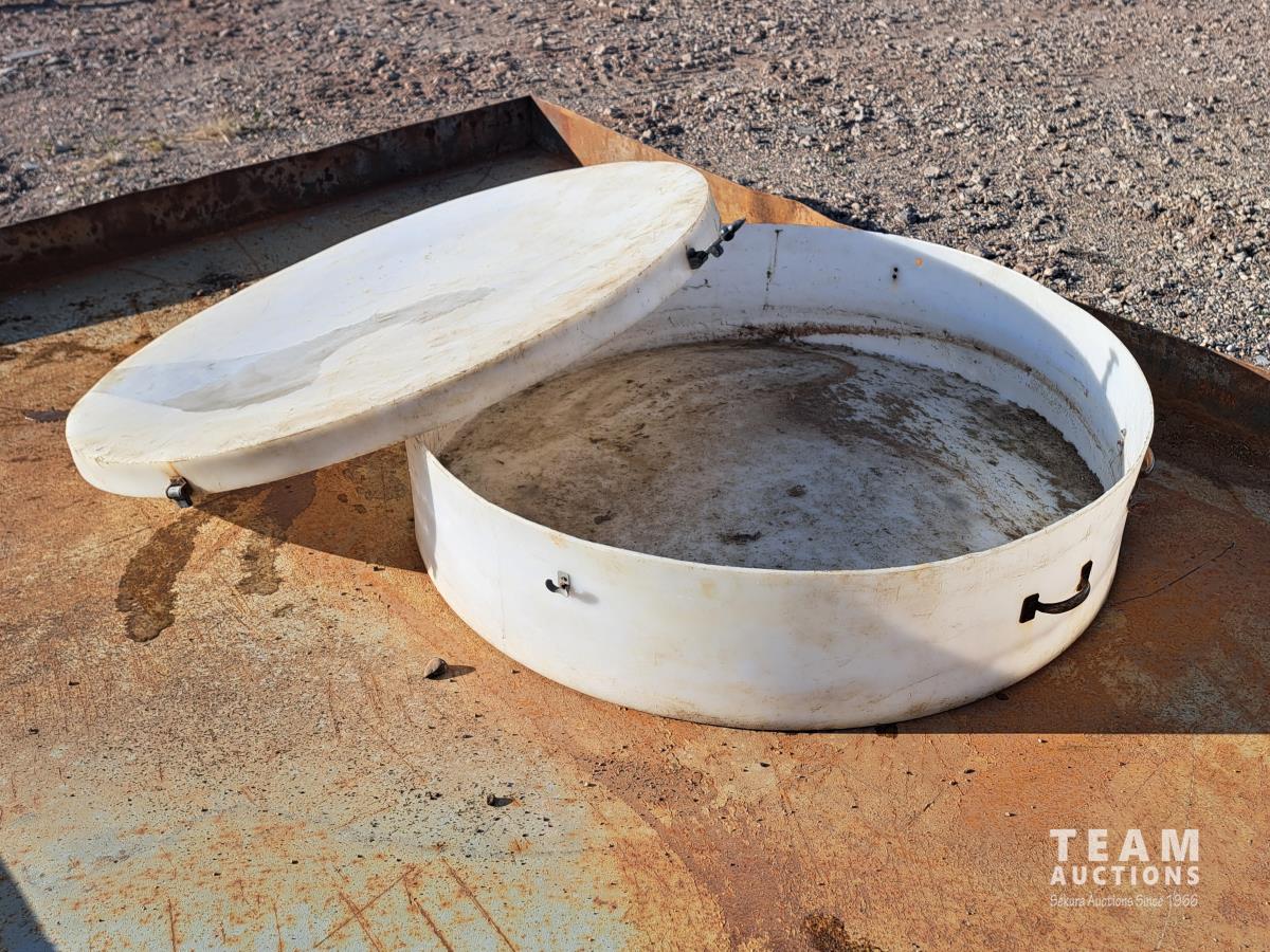103 inch wide x 13 ft long x 7 inch tall, 1/4 inch thick metal, poly containment catcher, 51 inch diameter, lifting handles, lid with rubber securement latches