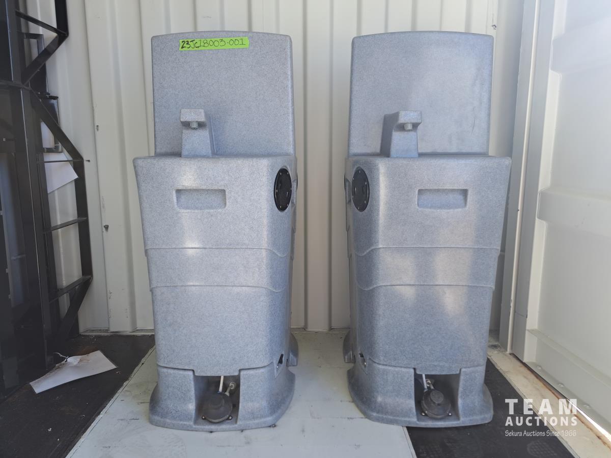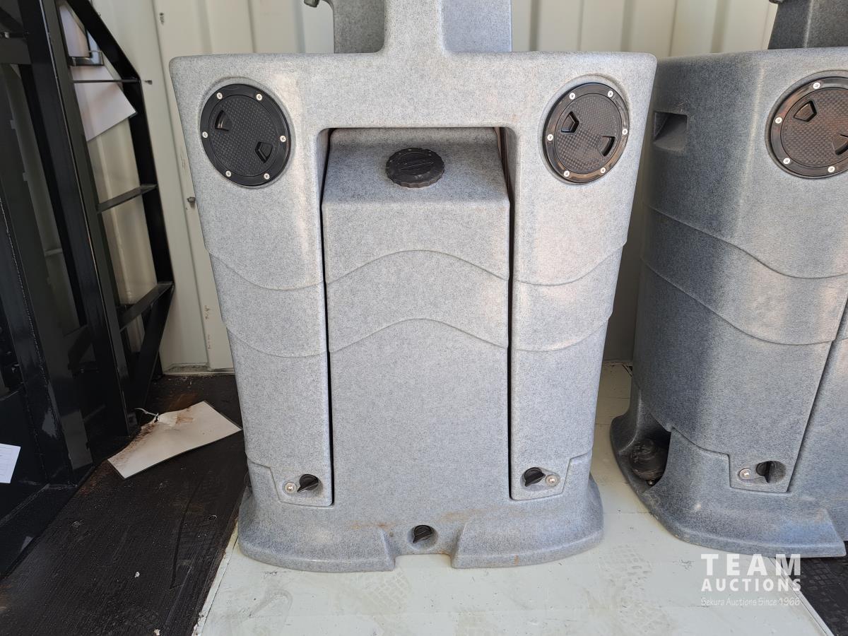 Fresh water tank, grey water tank, fill and drain outlets, as well as clean out outlets, foot pump. Sold in lots of 2.