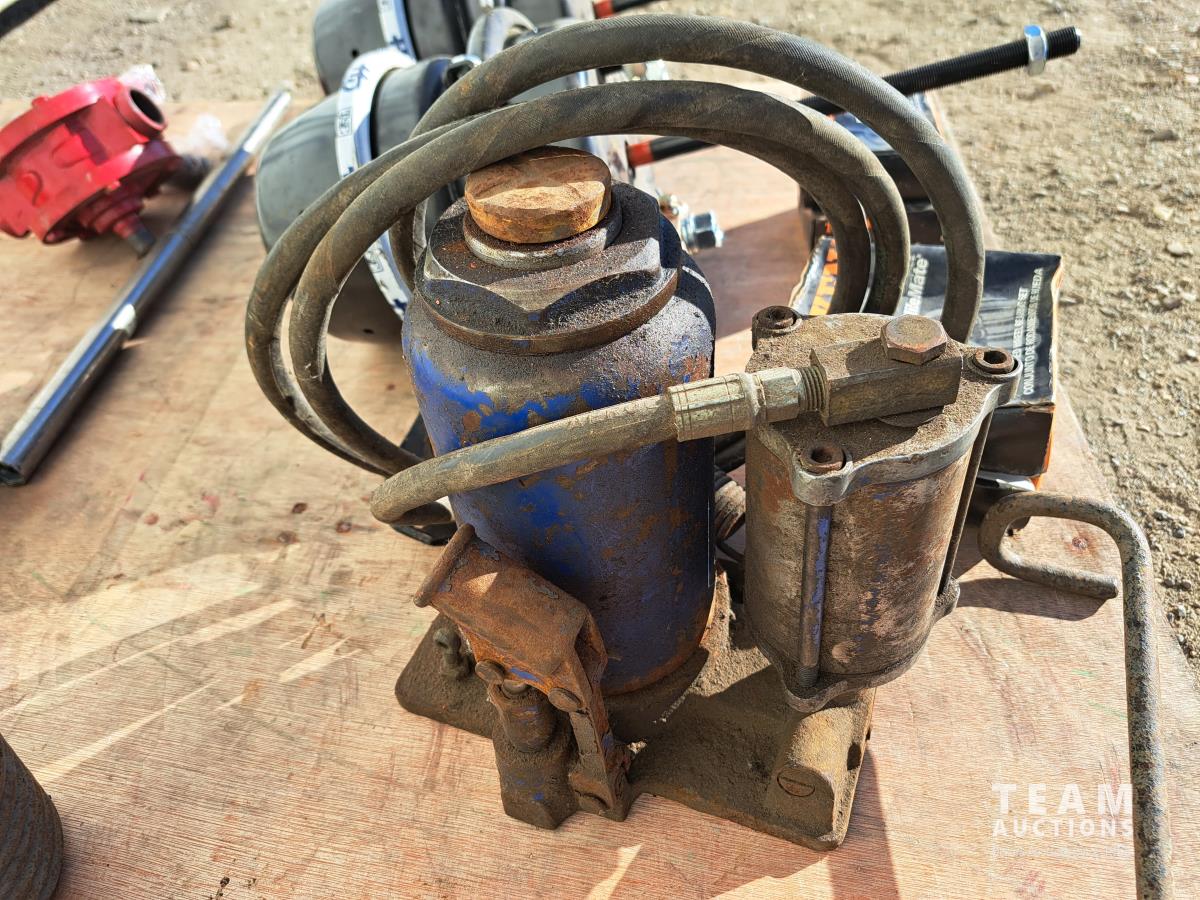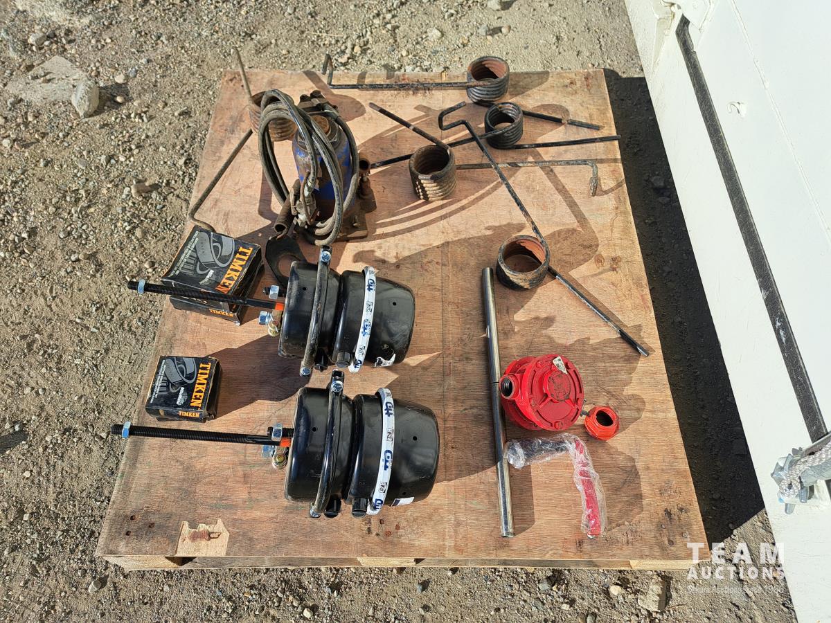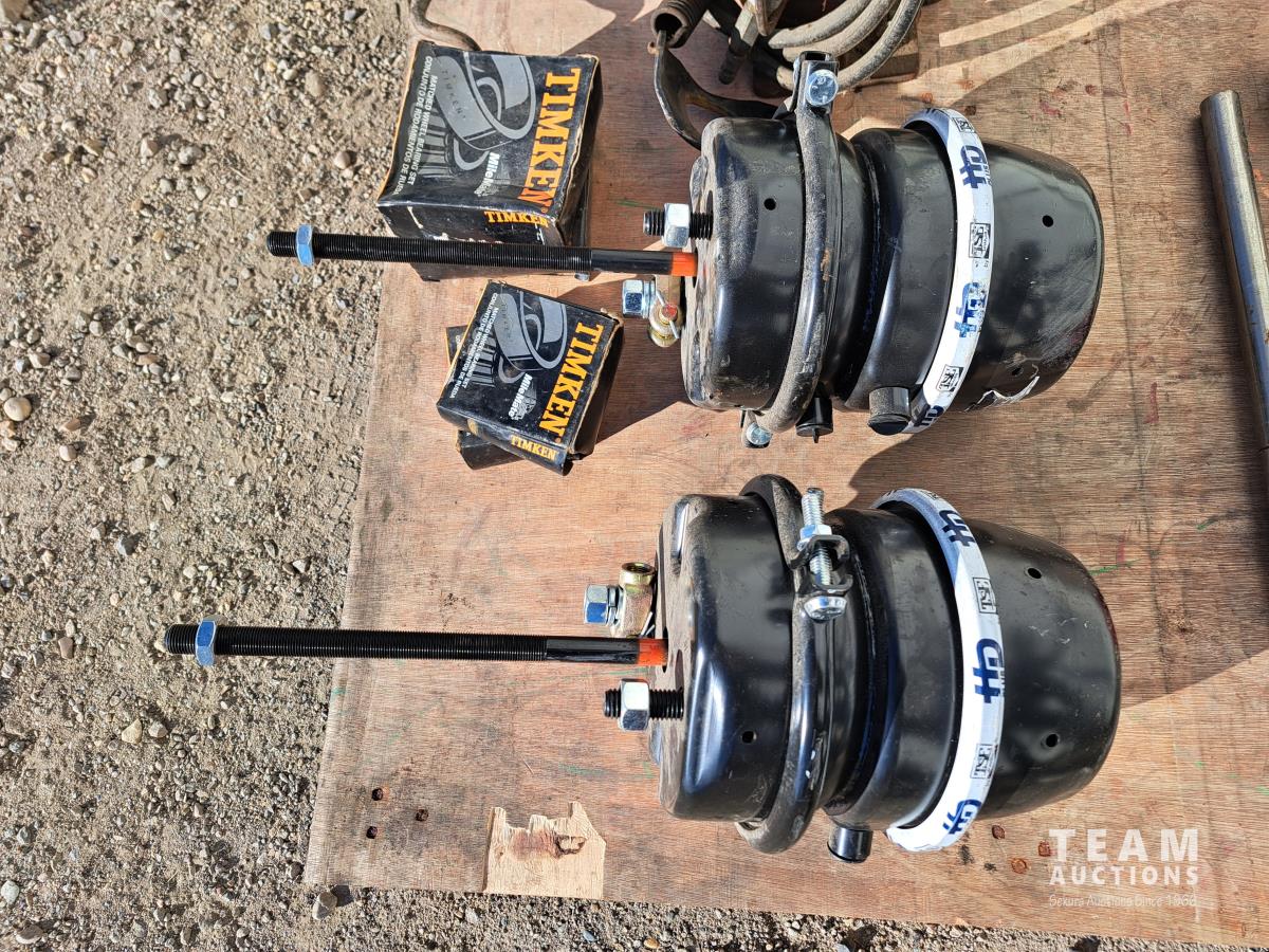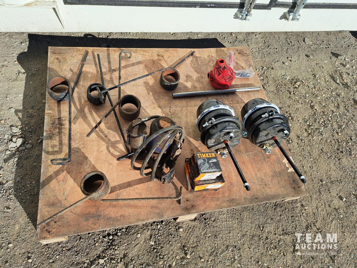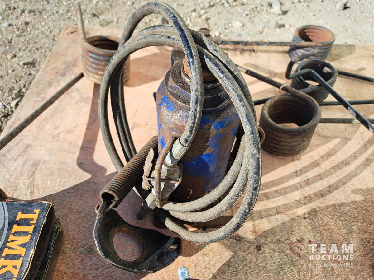 2 unused Spring Brake pods, HD330C, 1 hand crank barrel pump, 1 hydraulic bottle jack (size unknown), 4 boxes of Timkin matched wheel bearing sets, 5 truck box roll tarp springs