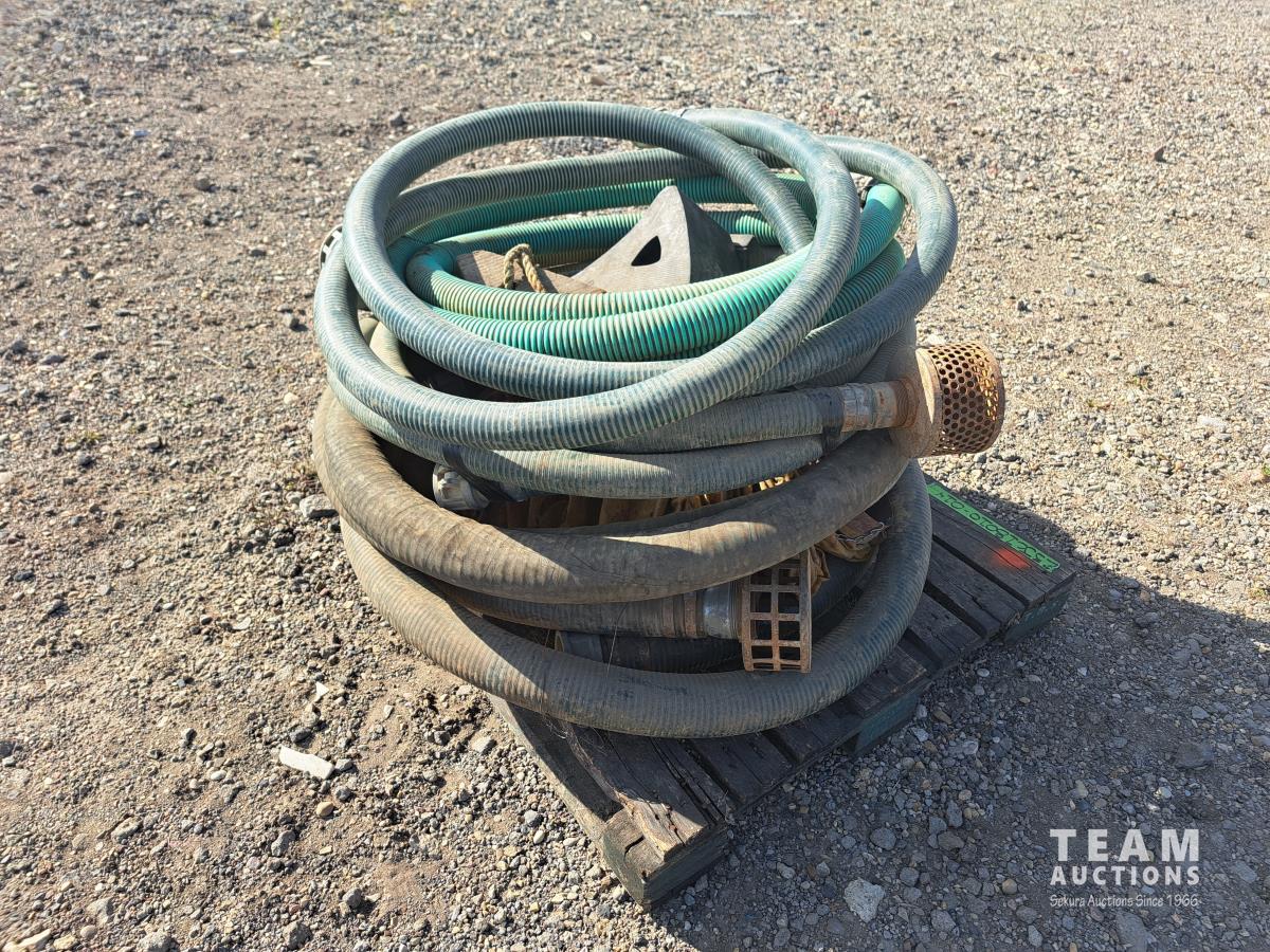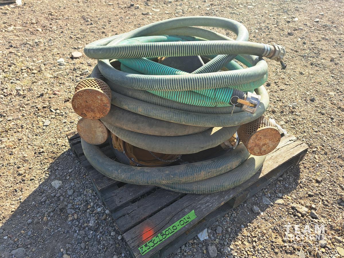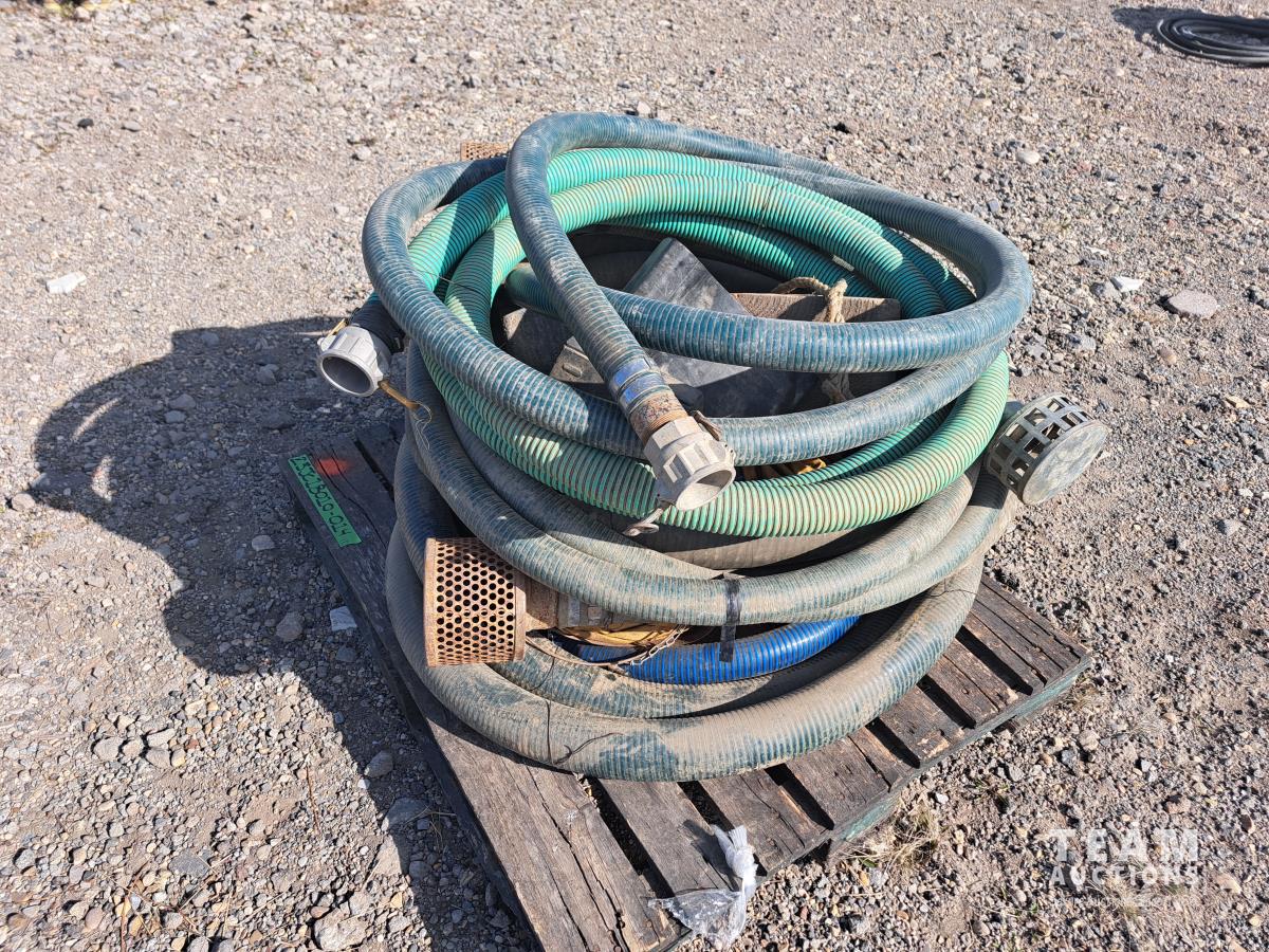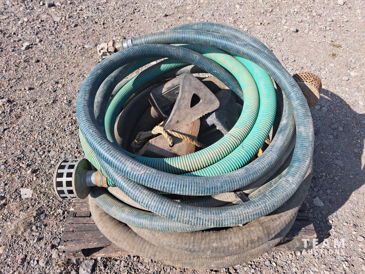 20 ft x 2 inch poly water hose equipped with camlock fittings, 3.5 inch suction hose approximately 20 ft long with camlock fittings and suction screen, 20 ft x 2 inch poly water hose with camlock fittings and suction screen, 20 ft x 2 inch Poly water hose with camlock fittings and suction screen, 3.5 inch poly water hose with camlock fittings and suction screen, 2 wheel chocks, 2 canvas heater ducts, 1 4 ft x 2 inch poly water hose with camlock fittings.