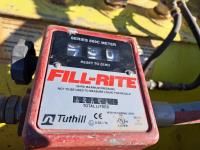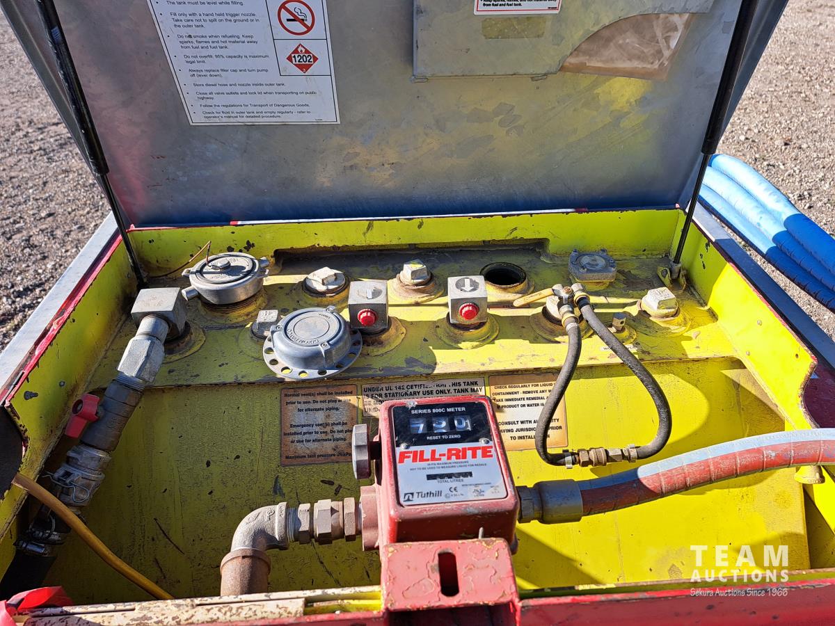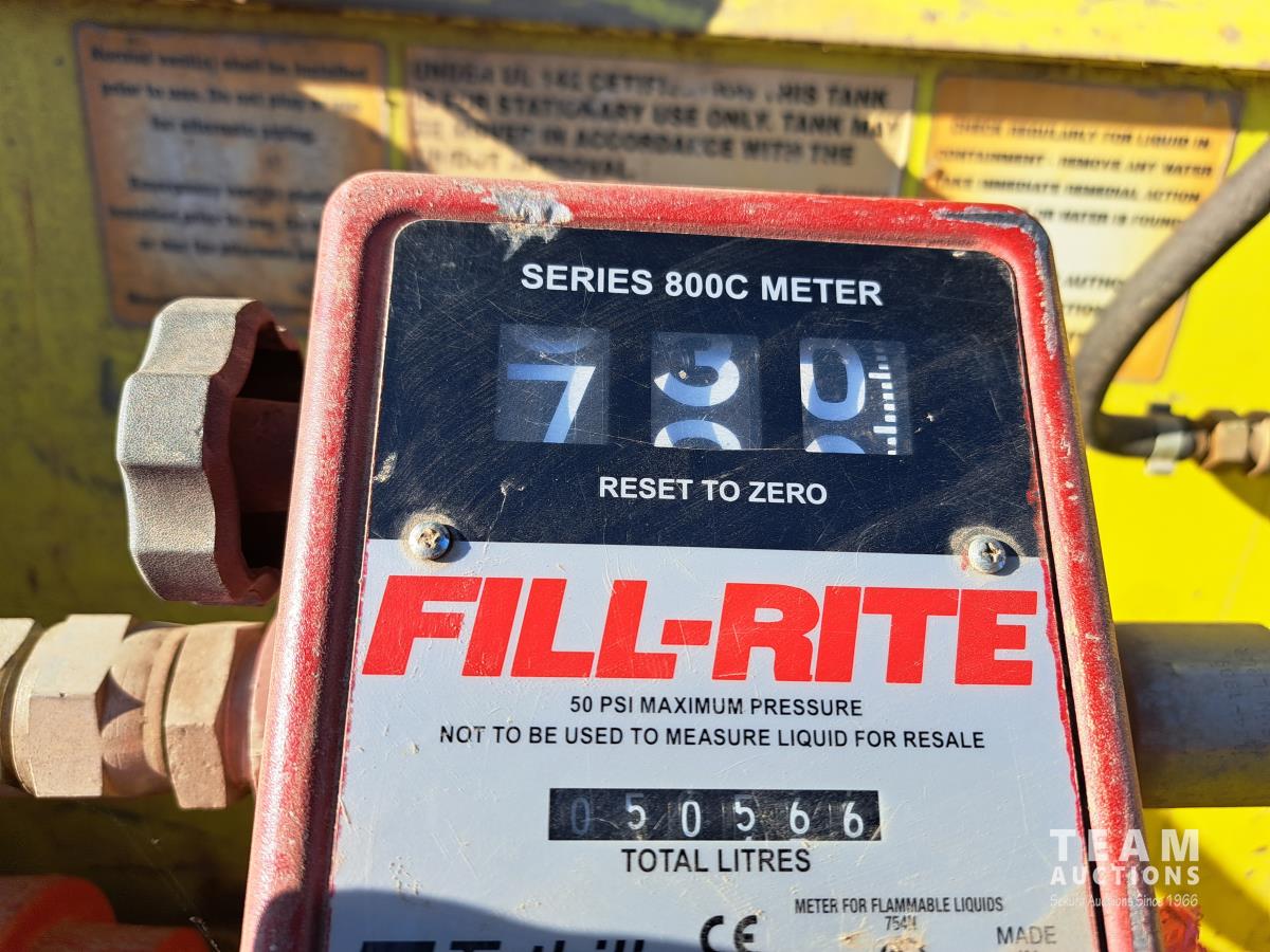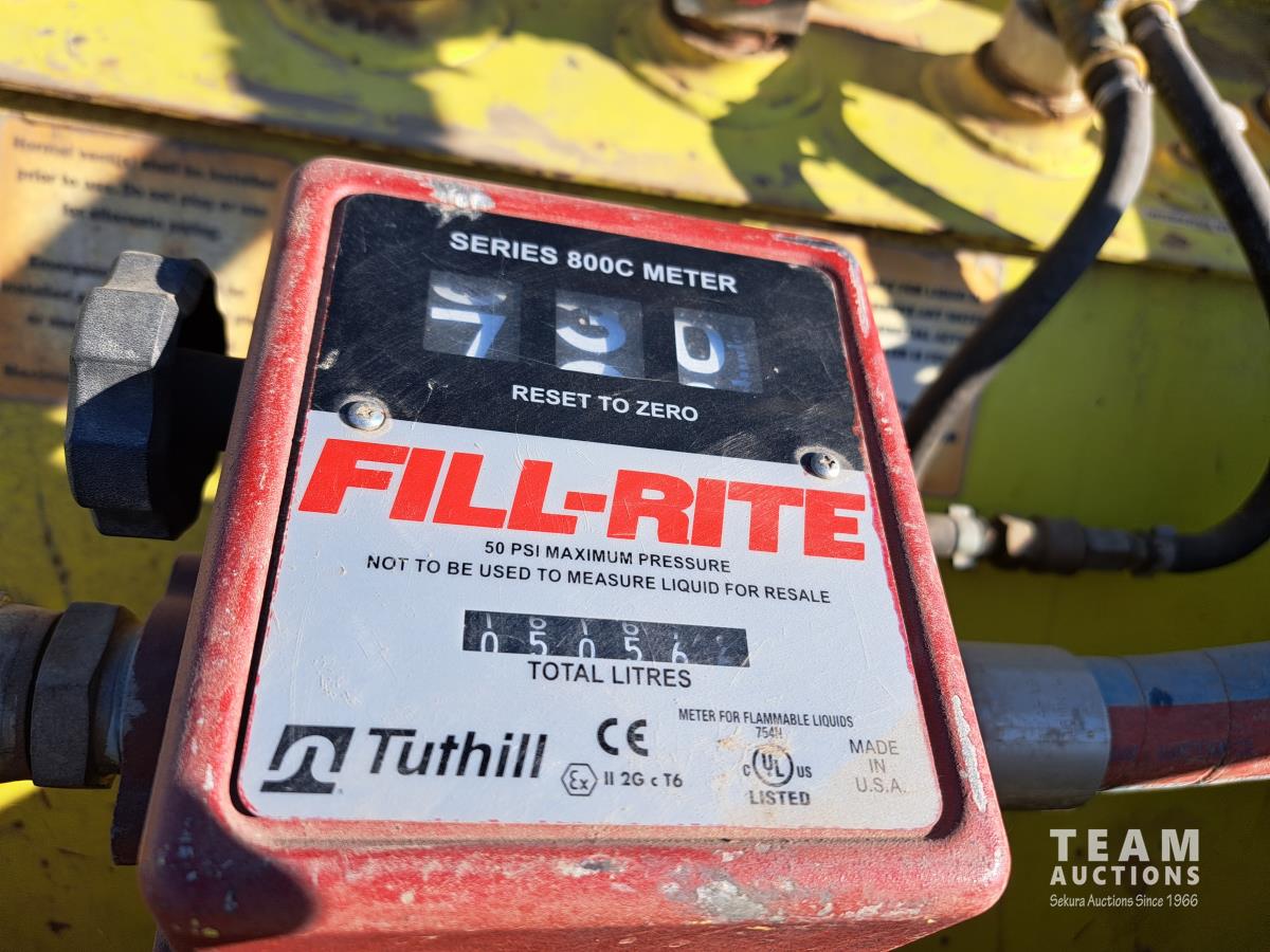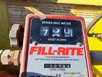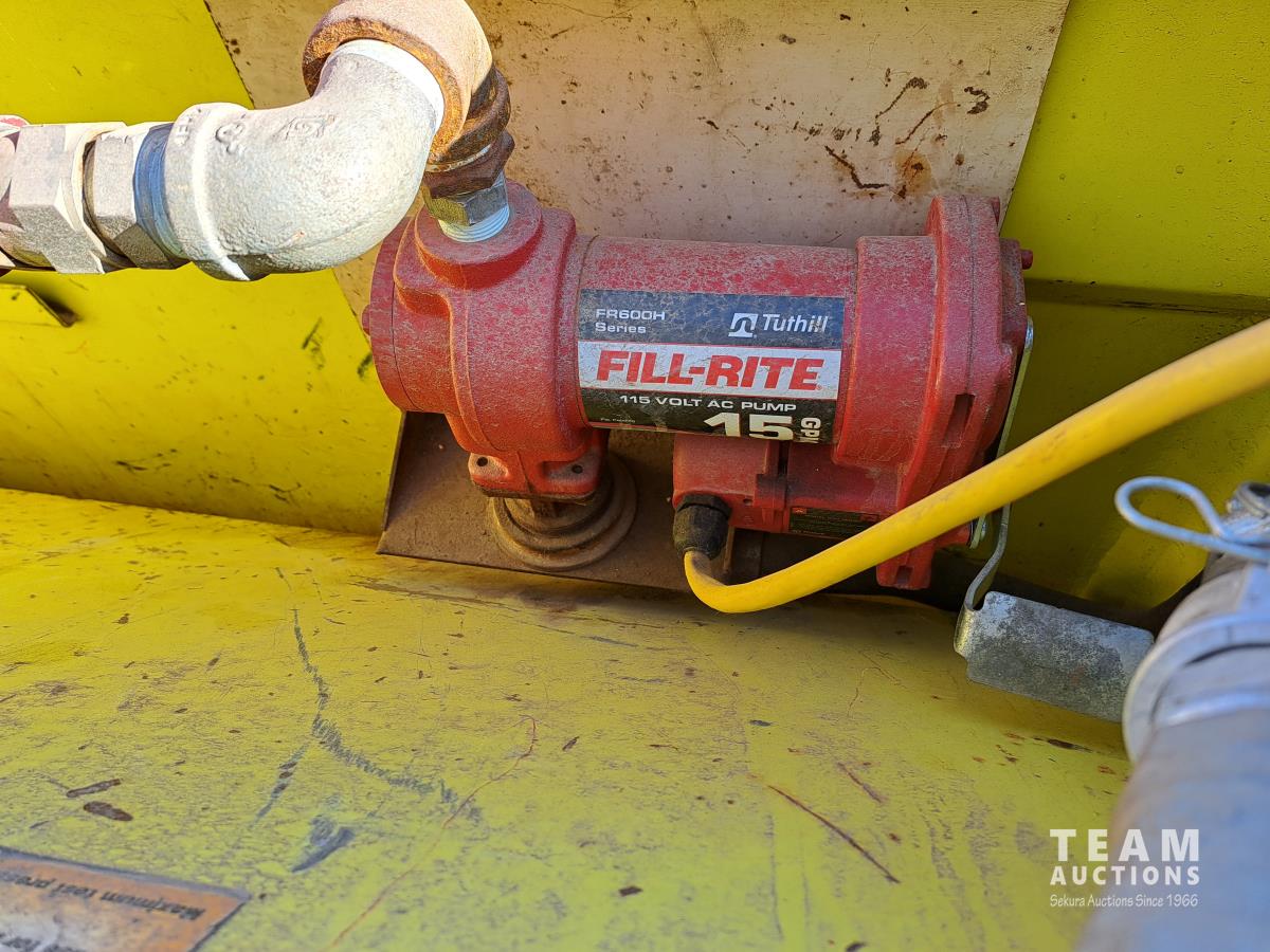 Double wall, Fill Rite 115 volt AC pump, 15 GPM, Fill Rite series 800c flow meter, hose, 1 inch nozzle, empty container weight is 1093 lb, fork lift slots all around, dimensions 45-1/4 inch w x 45-1/4 inch l x 52 inches tall.