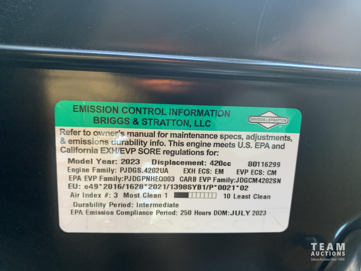 Open station, pilot controls, Briggs & Stratton 13.5 HP gas engine, LED work lights, 15 inch dig bucket, manual coupler, manual thumb, 1 auxiliary hydraulics, 2 Ft 7 inch stick, swing boom, backfill blade, 7 inch rubber tracks
