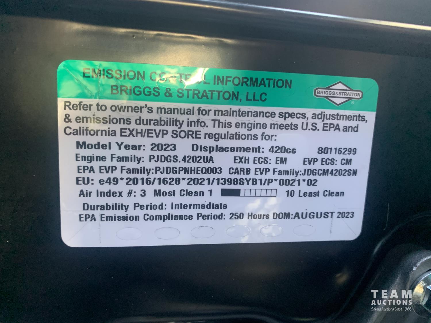 Briggs & Stratton 13.5 HP engine, 3 ft front blade, 14 inch dig bucket, 7 inch wide rubber track, 32 inch stick, aux hydraulic