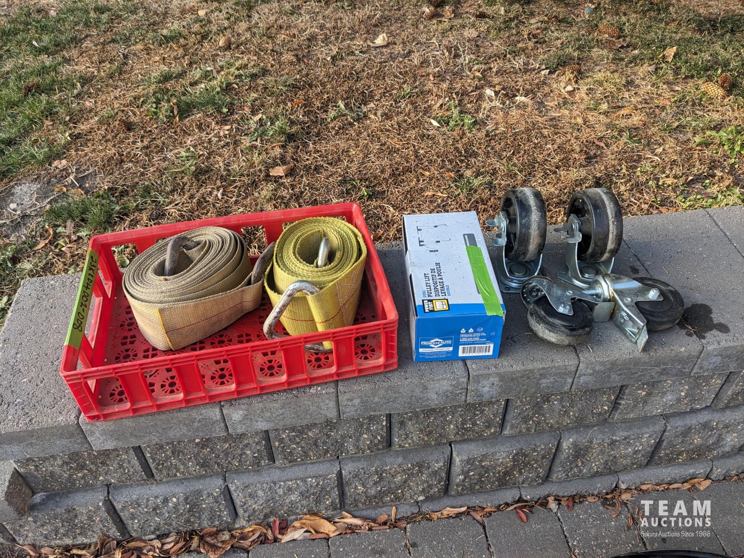 1274 (2) 4 Inch Web Slings, Powerfist Dual Pulley Lift System (Unused) & (4) Casters