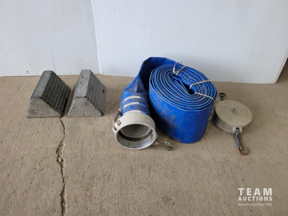 1035 25 Ft Lay Flat Hose, 6 Inch Camlock and 6 Inch Wheel Chocks