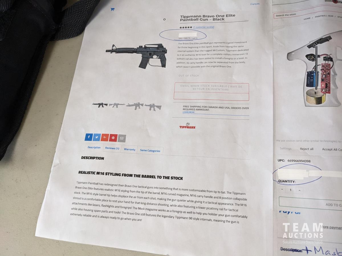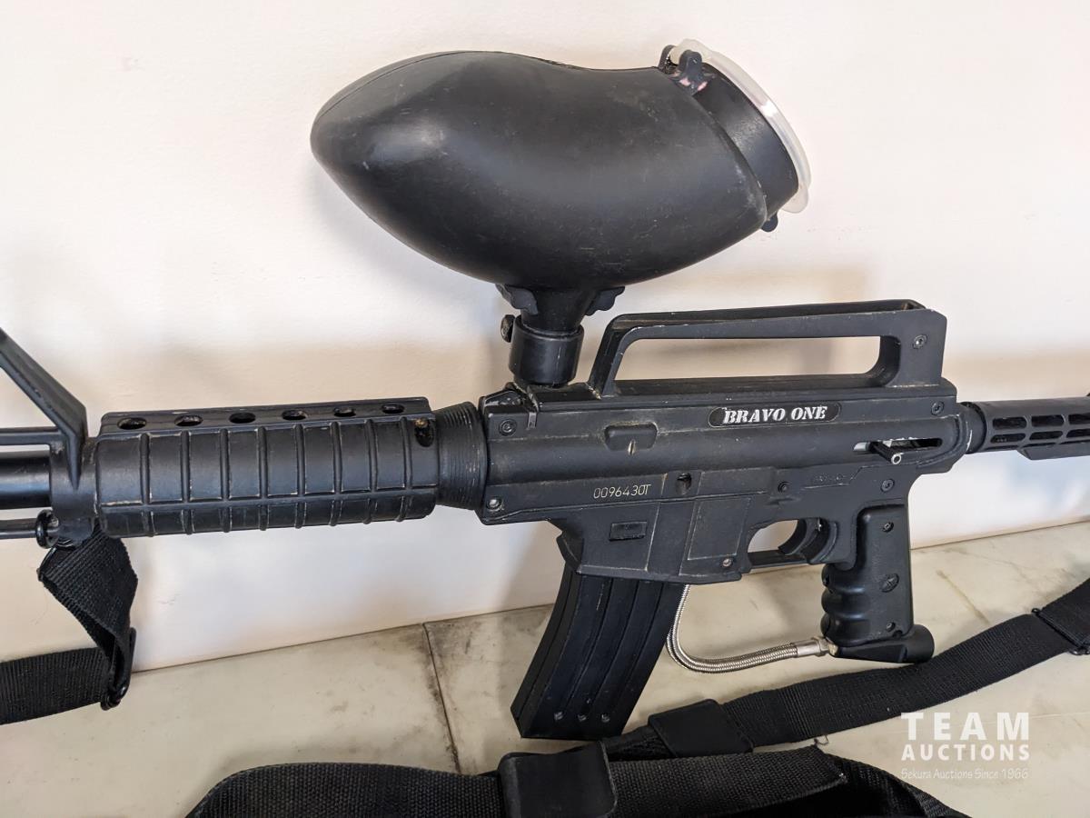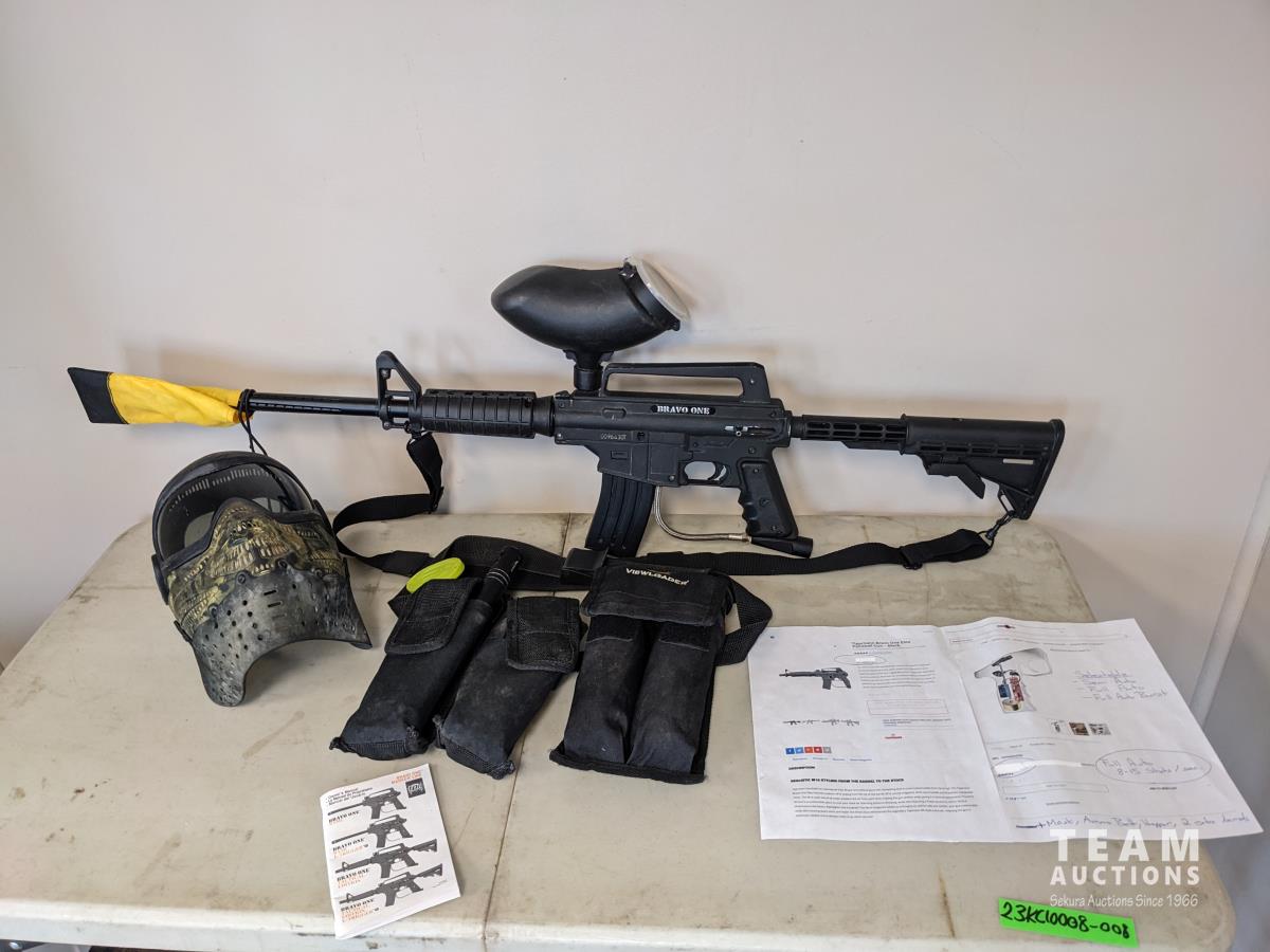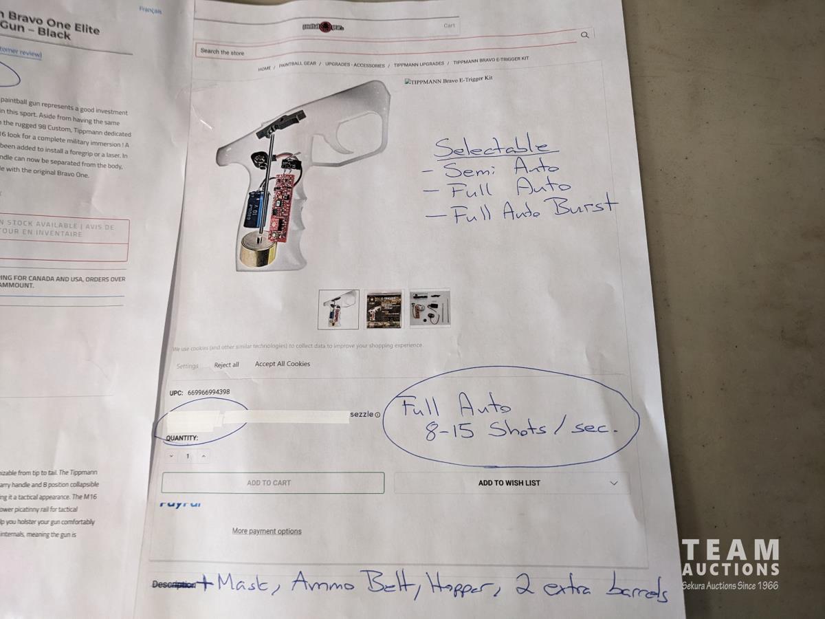 Tippmann Bravo One Elite paintball gun, three trigger settings: semi auto, full auto, full auto burst, 8-15 shots per second
