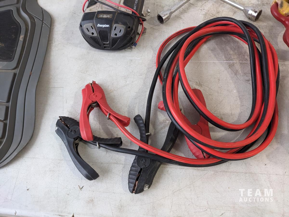 Booster cables, Energizer power inverter, rubber floor mats, tow sling, 12v light and compressor kit