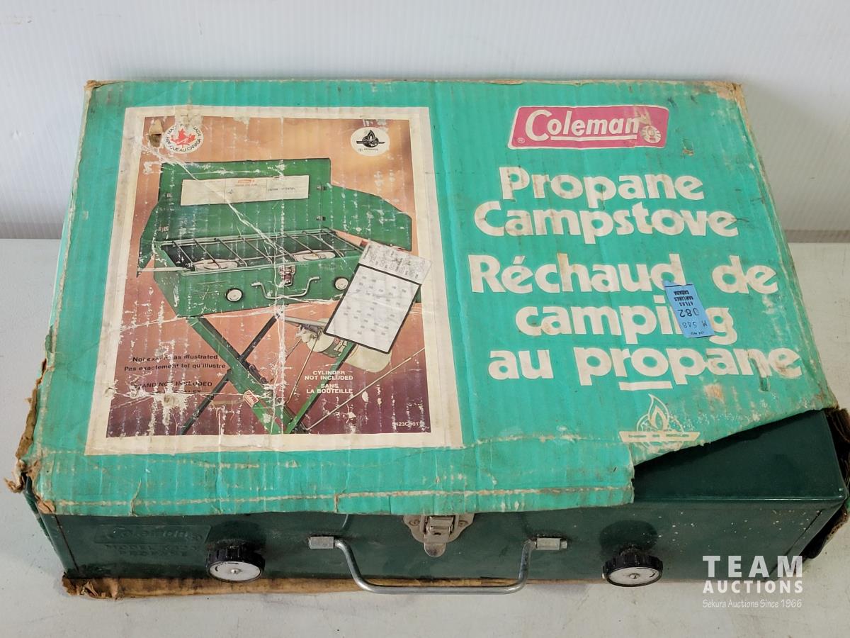 Igloo cooler, propane tree, Coleman camp stove, portable gourmet stove, propane lantern, propane heater, qty of BBQ tools, clothes pins