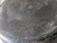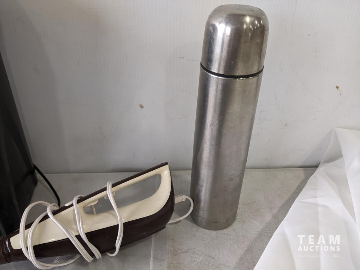 Triangle polyester table cloth, cast iron pan, electric knife, glass coffee pot and paper shredder