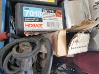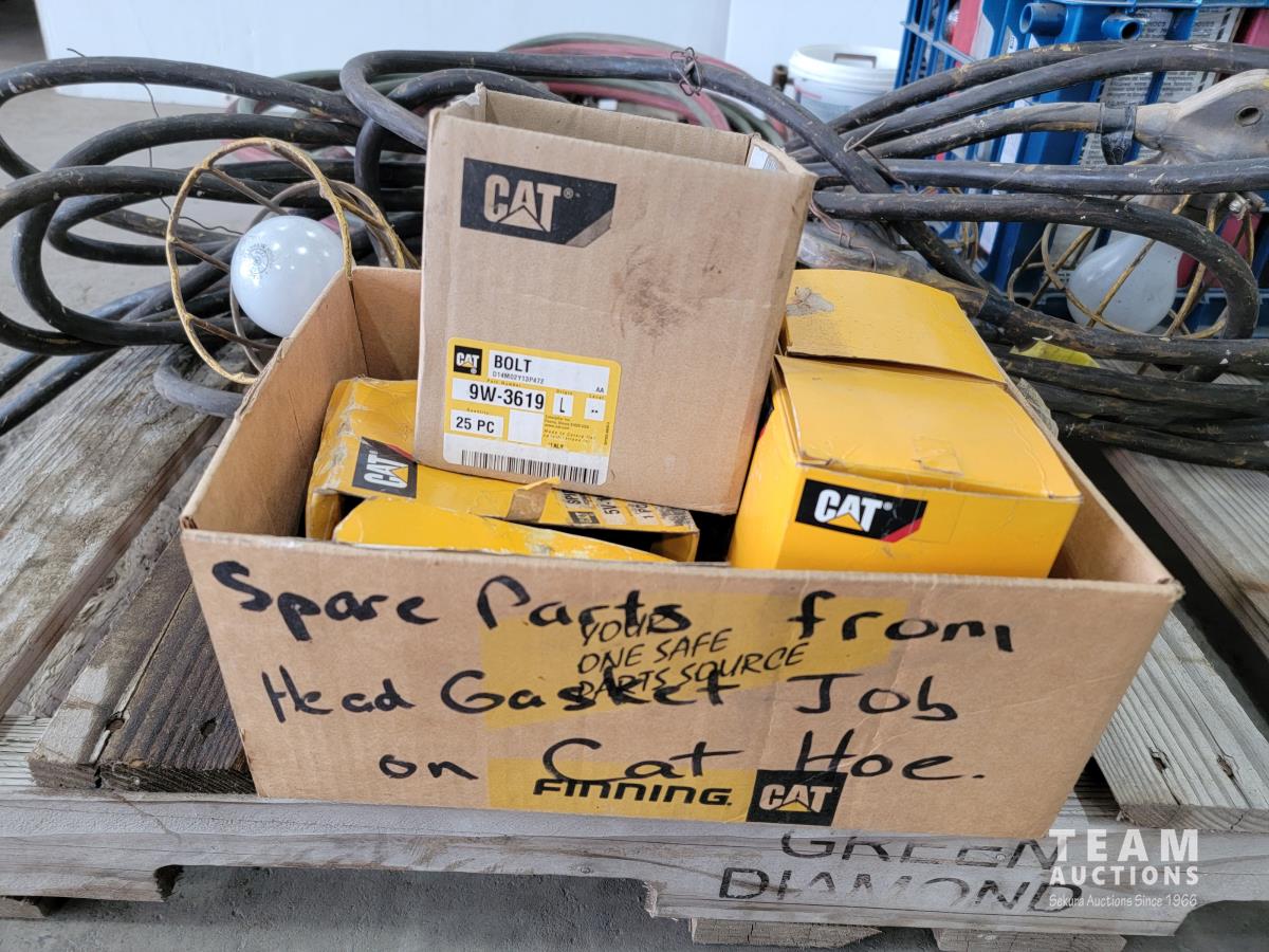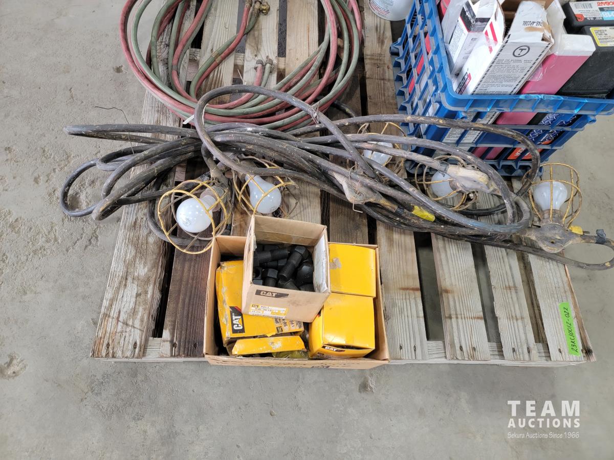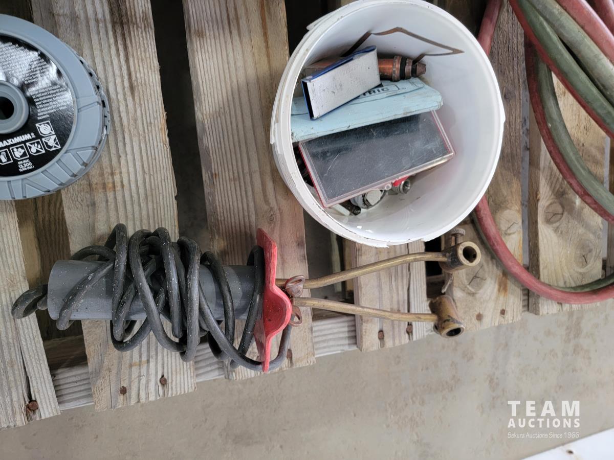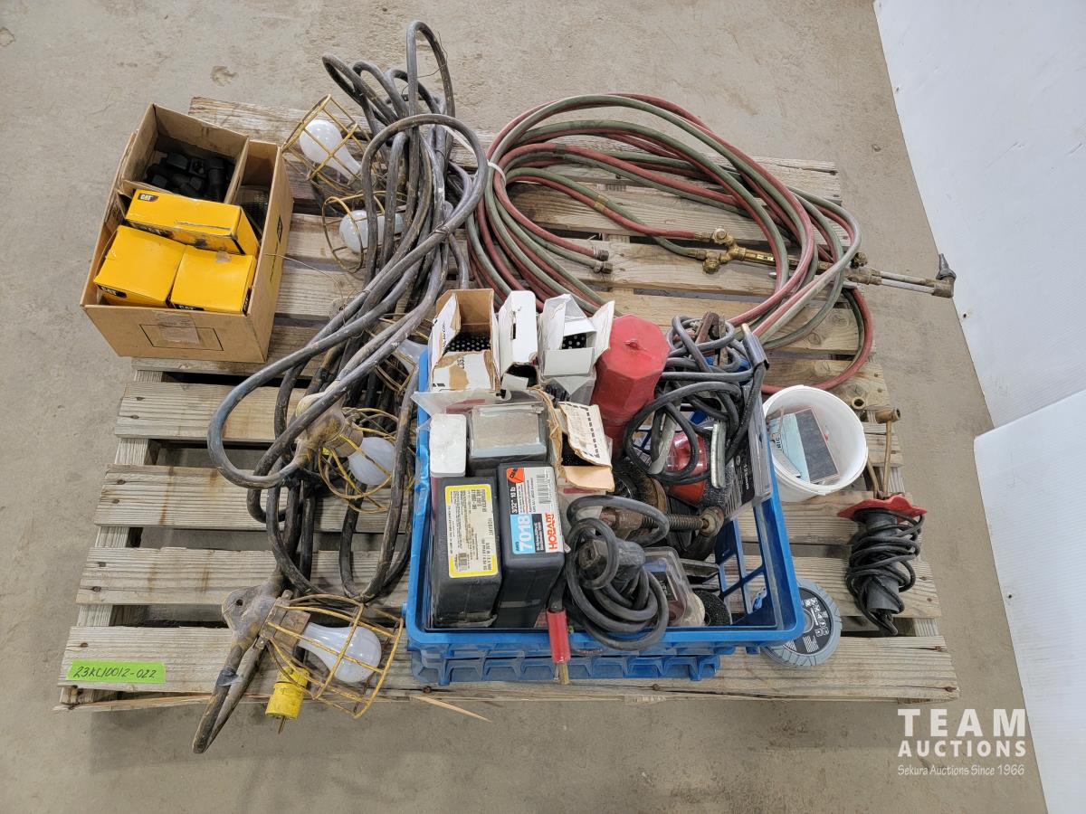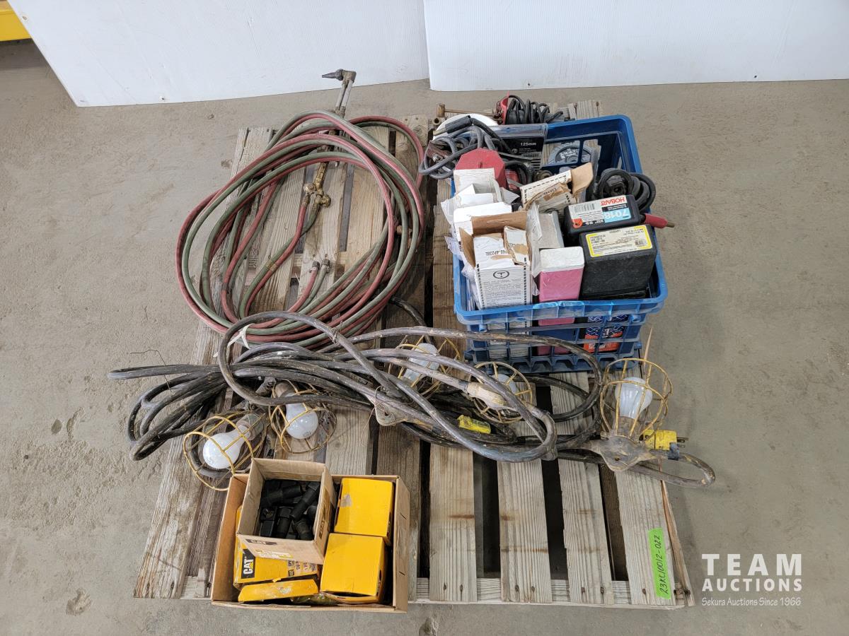 Torch and hose, work lights, qty of welding rods, wire wheels and box of spare parts from head gasket job on CAT hoe
