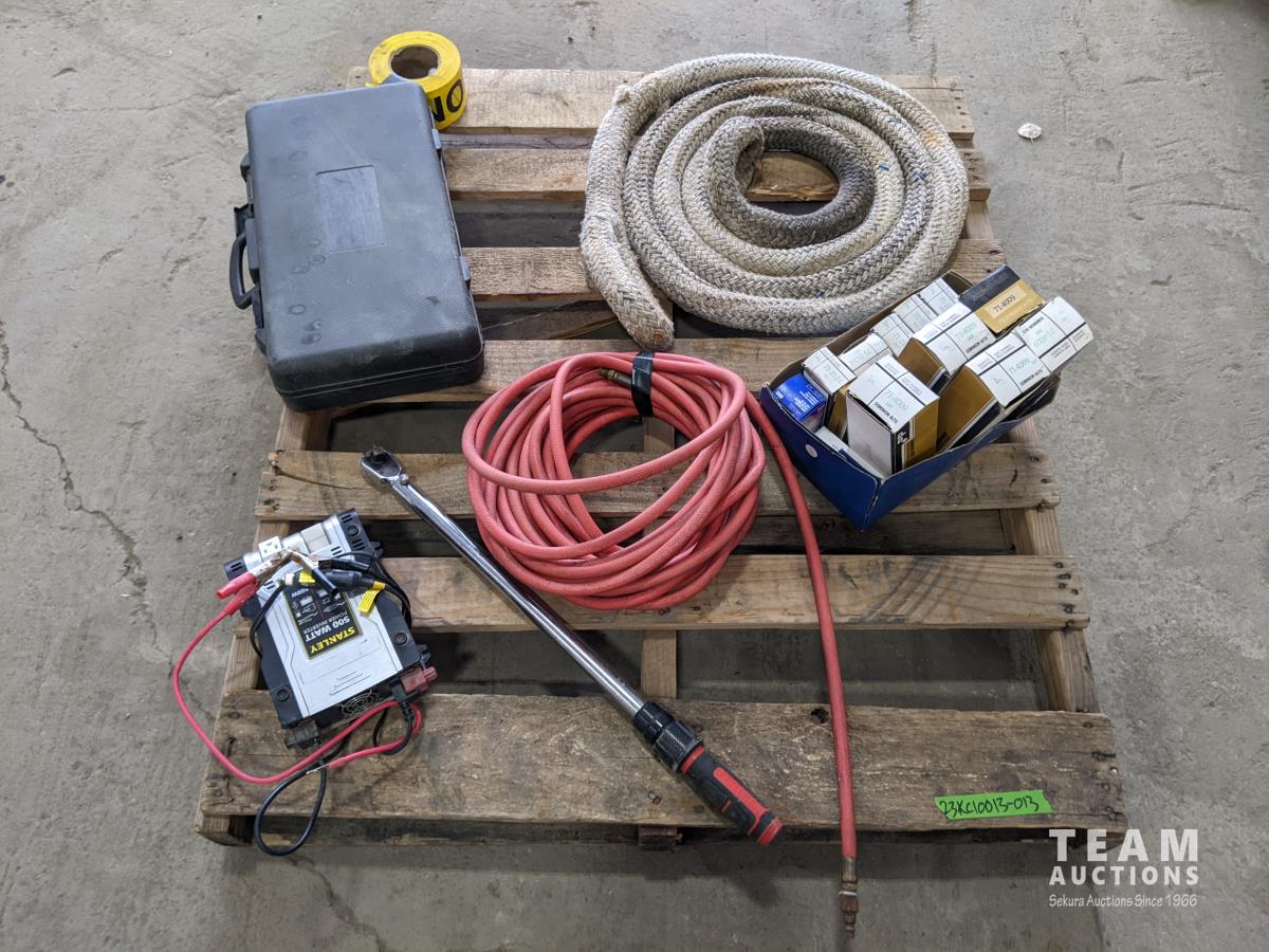Braided tow rope, marker lights airline, Craftsman torque wrench, Stanley 500w power inverter, level and roll of caution tape