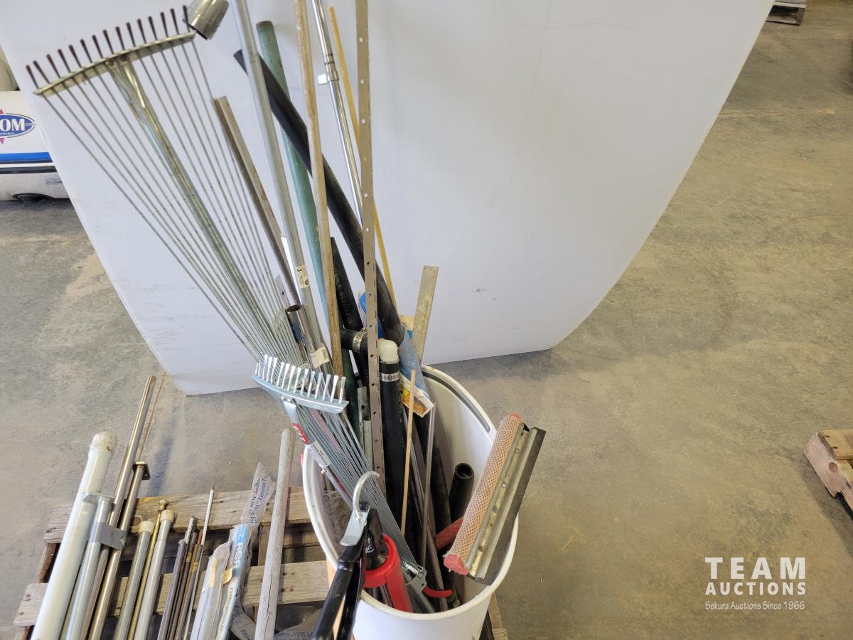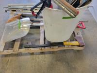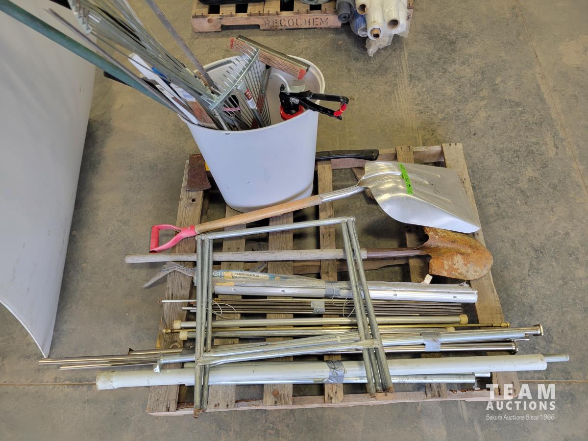 Shovels, axe, squeegee, 13 inch caulking gun, adjustable rakes, continuous hinge, aluminum threshold
