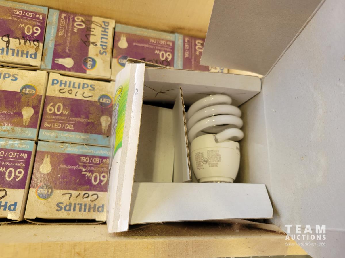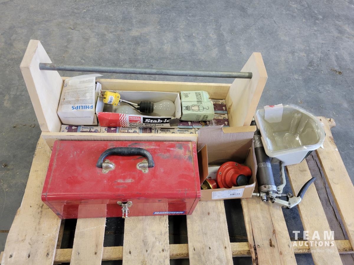Mastercraft toolbox, gas regulator, grease gun, paint pail, qty of light bulbs