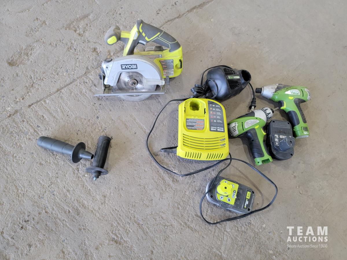 1271 Ryobi Saw, Charger, 18v Batteries and 12v Power Smith Drills