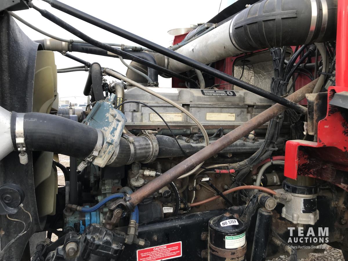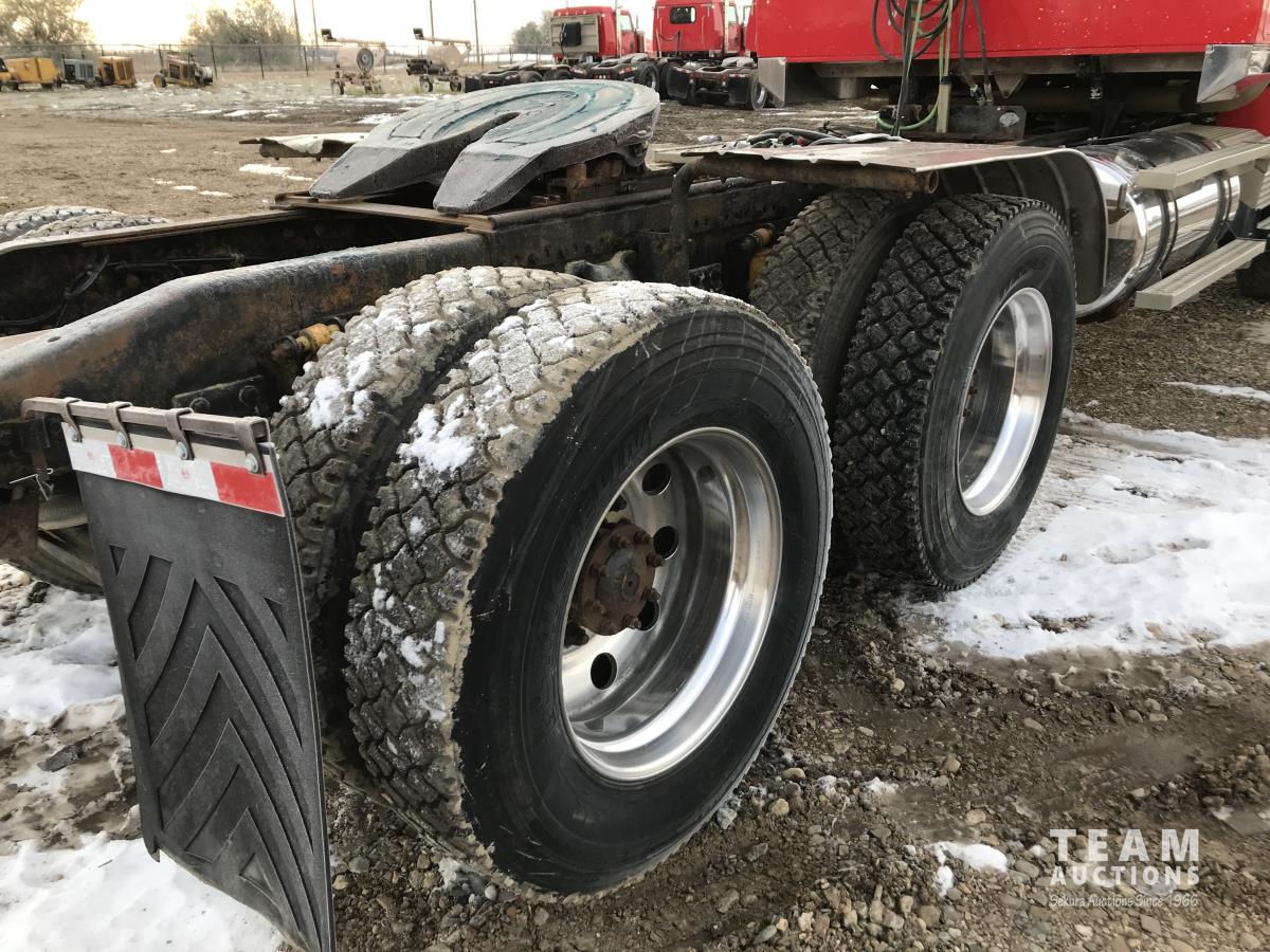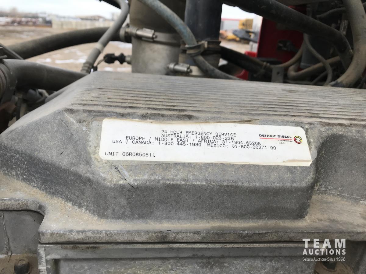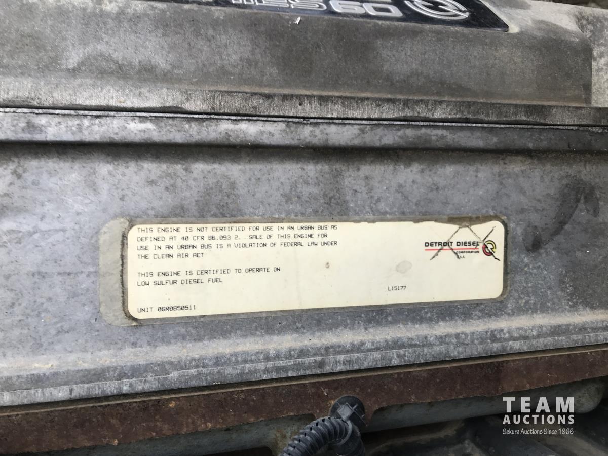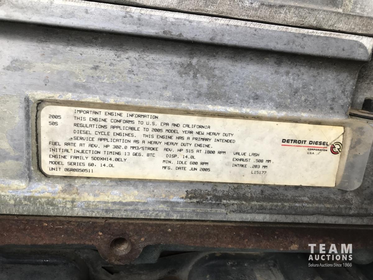 Detroit SERIES 60 14.0 L L6 515 HP diesel engine, engine brake, engine block heater, Eaton Fuller 18 speed manual transmission, mid rise 32 inch sleeper, A/C, cruise control, air ride driver seat, stereo, chain holders, air ride suspension, 16,000 lb front axle, 46,000 lb rear axles, 3 way diff locks, 231 inch WB, all aluminum wheels, 385/65R22.5 front tires, 11R24.5 rear tires