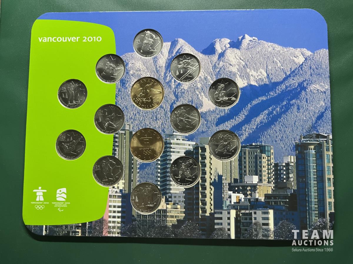 Twelve Vancouver 25 cent circulation sport coins and two Lucky Loonies