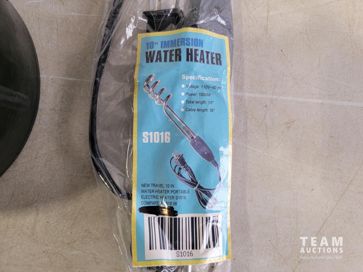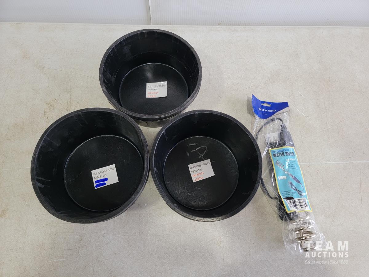 1743 (3) 2L Rubber Buckets and 10 Inch Immersion Water Heater (Unused)