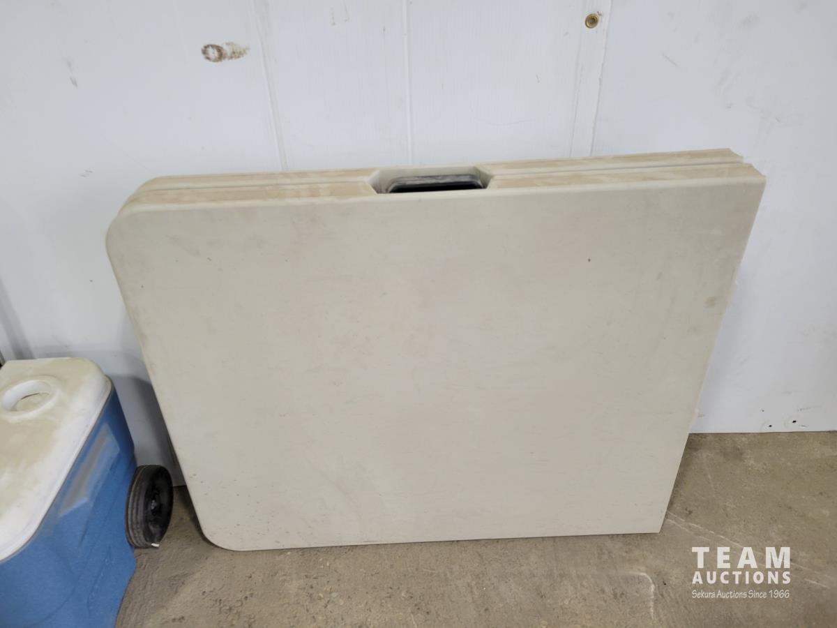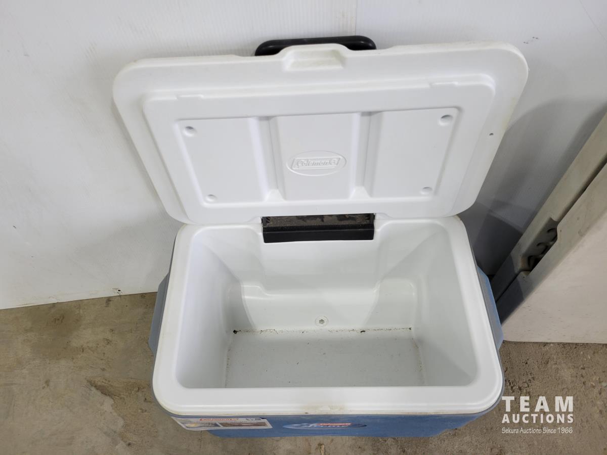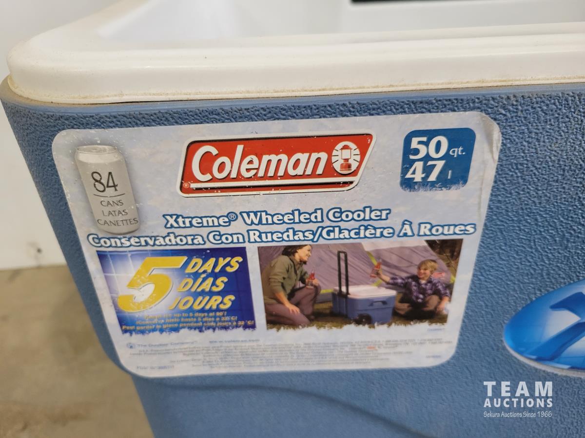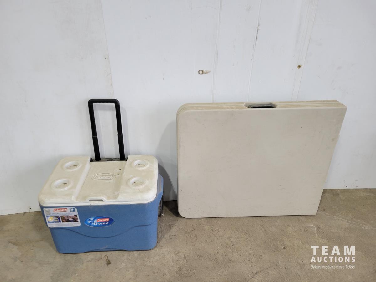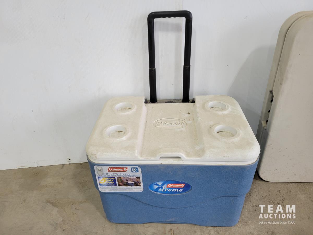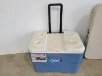 1072 Coleman 50 Qt Cooler On Wheels and Folding Table