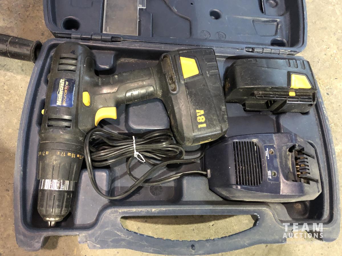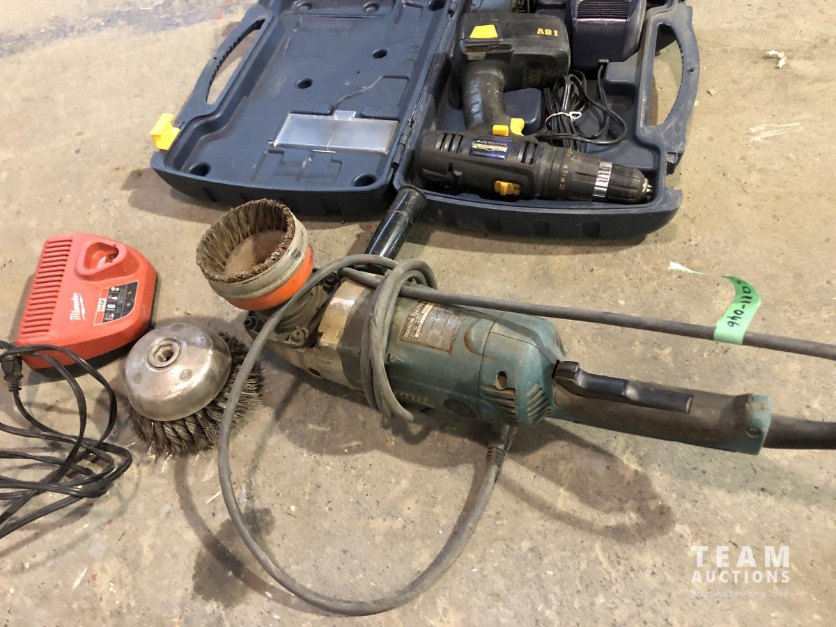 2001 Makita GA7020 Angle Grinder, Milwaukee M12 Charger, Mastercraft 18V Cordless Drill Set