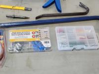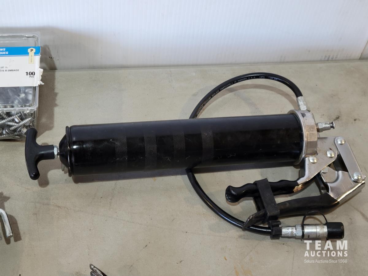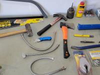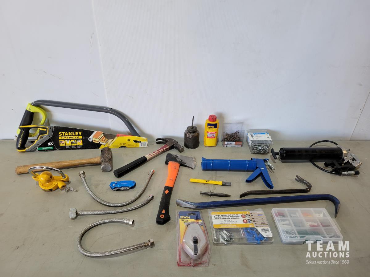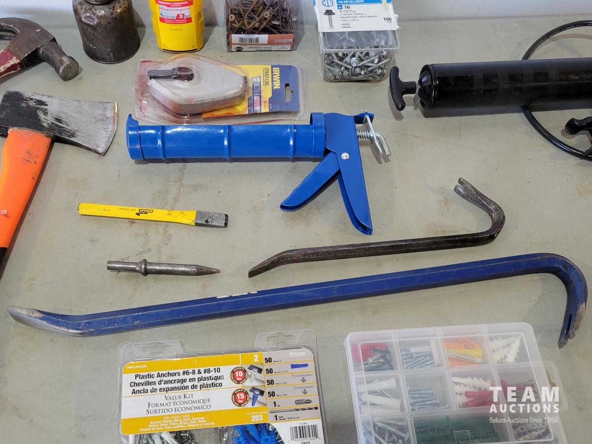 (2) grease guns, hatchet, pry bars, plastic anchors, strait-line, (2) hand saws, Reese ball hitch lock