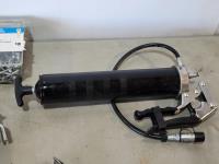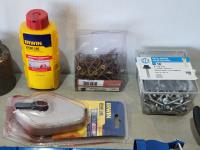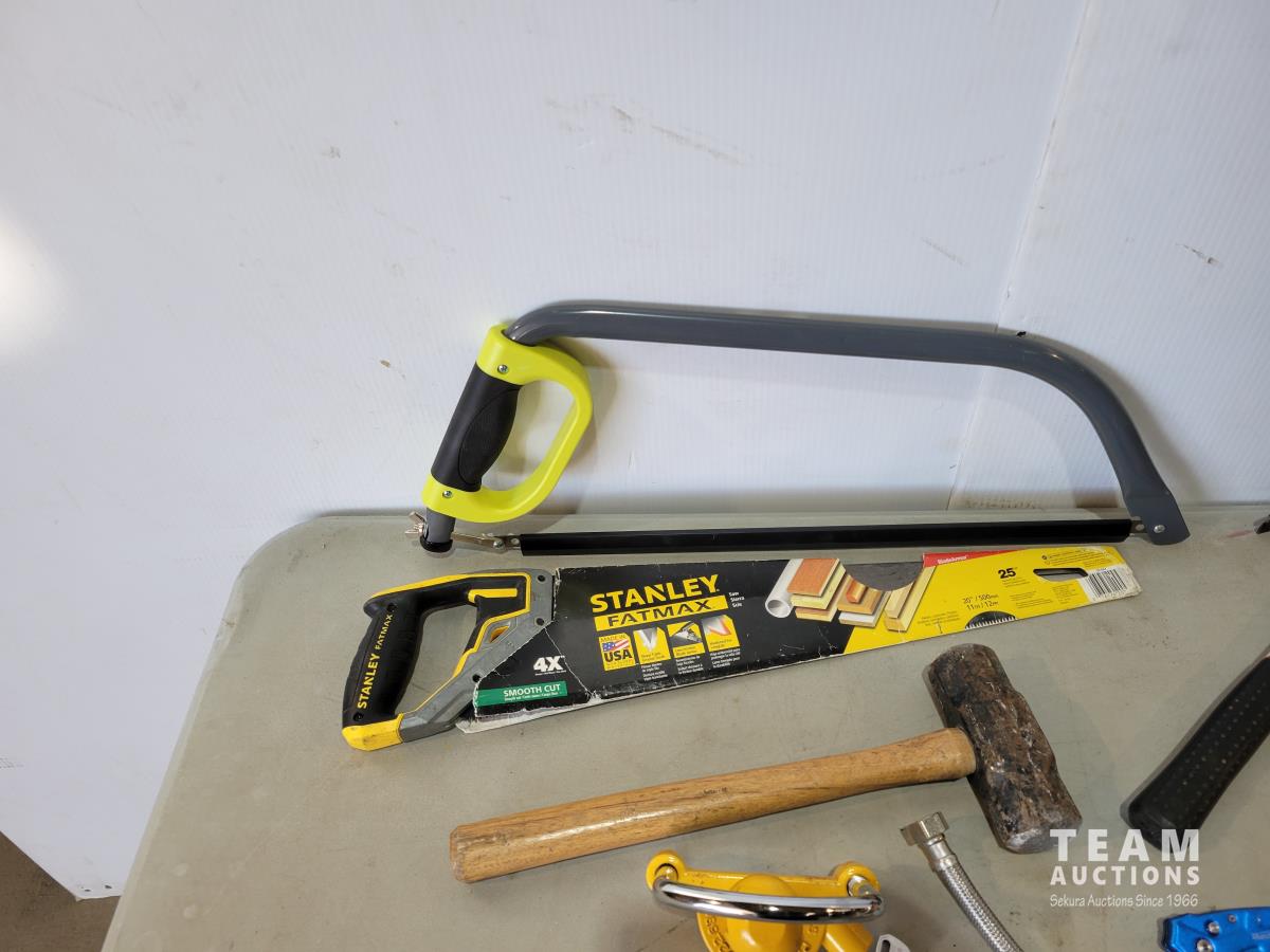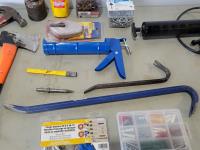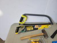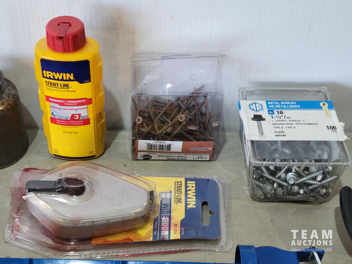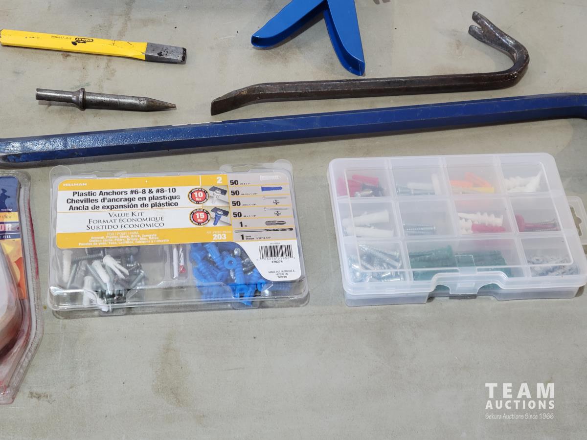 (2) grease guns, hatchet, pry bars, plastic anchors, strait-line, (2) hand saws, Reese ball hitch lock