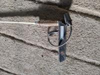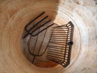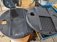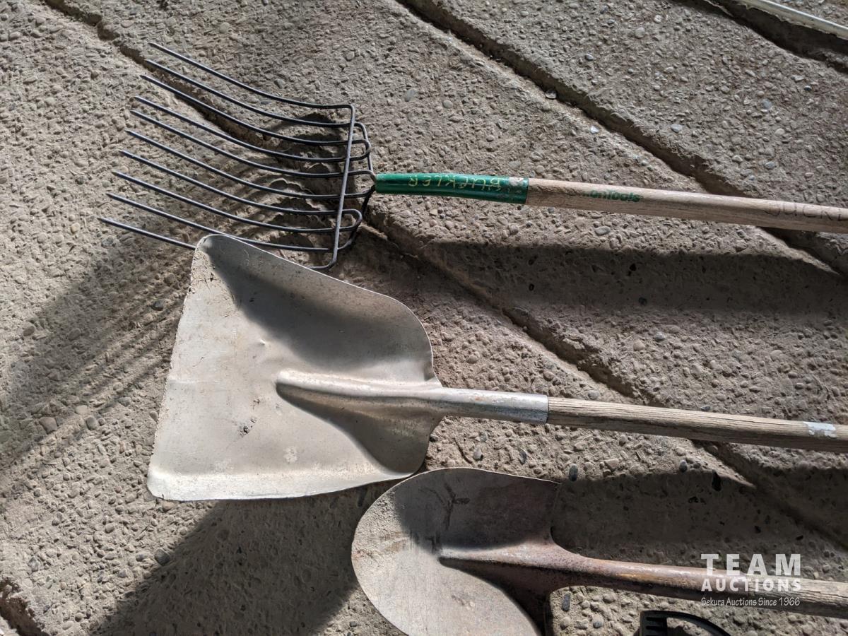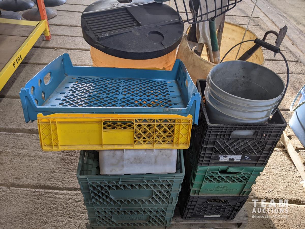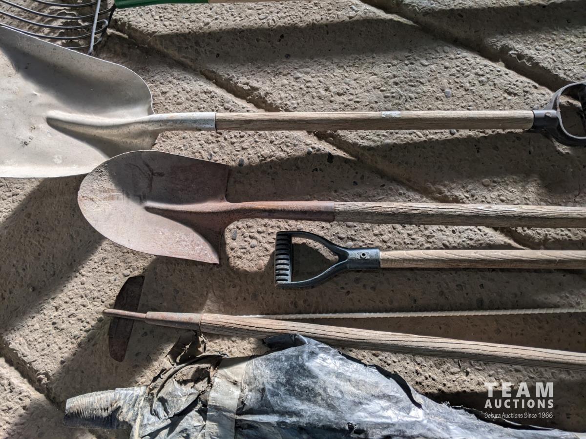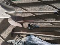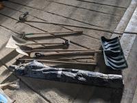 Shovels, hay rakes, pitch fork heads, (2) poly barrels, (2) rain barrel tops, 11 ft buggy whip hitch attachment with trailer plug in